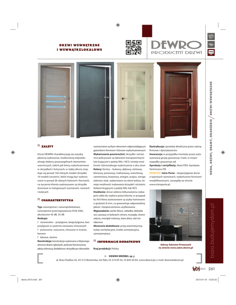n ZALETY wzmacniane są litym drewnem odpowiadającym Dystrybucja: sprzedaż detaliczna przez salony gatunkiem fornirowi i listwom wykończeniowym firmowe i dystrybutorów Drzwi DEWRO charakteryzują się wysoką Wykończenie powierzchni: skrzydła i oścież- Gwarancja: w przypadku montażu przez auto- jakością wykonania, możliwością indywidu- nice pokrywane są lakierami transparentnymi ryzowaną grupę gwarancja 3 lata, w innym alnego doboru poszczególnych elementów lub kryjącymi z palety RAL i NCS; istnieje moż- wypadku gwarancja rok wzorniczych, takich jak listwy wykończeniowe liwość różnorodnego wykończenia z obu stron Aprobaty i certyfikaty: Atest PZH, Aprobata w skrzydłach i futrynach; w stałej ofercie znaj- Kolory: forniry – bukowy, dębowy, olchowy, Techniczna ITB duje się ponad 130 różnych modeli skrzydeł, klonowy, jesionowy, mahoniowy, orzechowy, NOWOŚĆ: Intro Porte – bezprzylgowe drzwi 10 modeli ościeżnic, które mogą być wykony- czereśniowy, brzozowy, aniegre, acajou, wenge, o typowych wymiarach, wykończone fornirami wane w ponad 30 różnych kolorach i fornirach; zebrano, teak, wybarwiane na różne kolory; ist- modyfikowanymi, szczegóły na stronie na życzenie klienta wykonywane są skrzydła nieje możliwość malowania skrzydeł i ościeżnic www.introporte.pl drzwiowe w nietypowych wymiarach, wzorach farbami kryjącymi z palety RAL lub NCS i kolorach Oszklenie: drzwi szklone kilkunastoma rodza- OKNA, DRZWI, BRAMY, ORANŻERIE / DRZWI WEWNĘTRZNE DRZWI WEWNĘTRZNE I WEWNĄTRZLOKALOWE jami szkła do wyboru przez klienta; w przypad- n CHARAKTERYSTYKA ku linii Nova zastosowane są szyby hartowane jakość i bezpieczeństwo użytkowania wewnętrzne przeciwpożarowe EI30, EI60, Wyposażenie: zamki (klucz, wkładka, blokada akustyczne 42 dB, 35 dB wc), zawiasy w kolorach: chrom, mosiądz, chrom Rodzaje: satyna, mosiądz matowy, stare złoto, stal nie- l rozwieralne – przylgowe, bezprzylgowe, bez- rdzewna przylgowe w systemie zawiasów chowanych Akcesoria dodatkowe: próg automatyczny, l przesuwne, rozsuwne, chowane w ścianie, tuleje wentylacyjne, kratka wentylacyjna, łamane samozamykacz baza.budujemydom.pl o grubości 8 mm, co gwarantuje odpowiednią Typ: wewnętrzne i wewnątrzlokalowe, l łukowe, skośne Konstrukcja: konstrukcja wykonana z klejonego n INFORMACJE DODATKOWE drewna drzew iglastych, pokryta fornirowaną płytą wiórową; dodatkowo skrzydła po obwodzie Kraj produkcji: Polska Adresy Salonów Firmowych na stronie www.salon.dewro.pl n DEWRO WRÓBEL sp. j. ul. Braci Dudów 42, 43-512 Bestwinka, tel./faks 33 214 09 34, 33 845 64 83, www.dewro.pl, e-mail: [email protected] 2013 dewro 2013.indd 261 261 2013-01-19 12:02:32