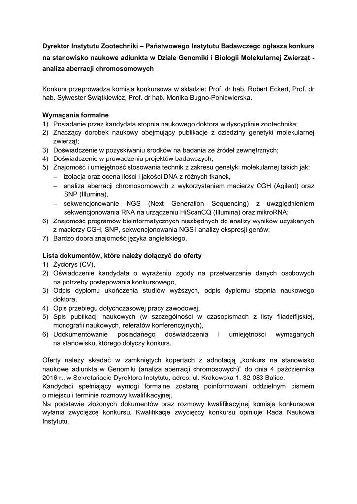 Dyrektor Instytutu Zootechniki – Państwowego Instytutu Badawczego ogłasza konkurs na stanowisko naukowe adiunkta w Dziale Genomiki i Biologii Molekularnej Zwierząt analiza aberracji chromosomowych Konkurs przeprowadza komisja konkursowa w składzie: Prof. dr hab. Robert Eckert, Prof. dr hab. Sylwester Świątkiewicz, Prof. dr hab. Monika Bugno-Poniewierska. Wymagania formalne 1) Posiadanie przez kandydata stopnia naukowego doktora w dyscyplinie zootechnika; 2) Znaczący dorobek naukowy obejmujący publikacje z dziedziny genetyki molekularnej zwierząt; 3) Doświadczenie w pozyskiwaniu środków na badania ze źródeł zewnętrznych; 4) Doświadczenie w prowadzeniu projektów badawczych; 5) Znajomość i umiejętność stosowania technik z zakresu genetyki molekularnej takich jak: izolacja oraz ocena ilości i jakości DNA z różnych tkanek, analiza aberracji chromosomowych z wykorzystaniem macierzy CGH (Agilent) oraz SNP (Illumina), sekwencjonowanie NGS (Next Generation Sequencing) z uwzględnieniem sekwencjonowania RNA na urządzeniu HiScanCQ (Illumina) oraz mikroRNA; 6) Znajomość programów bioinformatycznych niezbędnych do analizy wyników uzyskanych z macierzy CGH, SNP, sekwencjonowania NGS i analizy ekspresji genów; 7) Bardzo dobra znajomość języka angielskiego. Lista dokumentów, które należy dołączyć do oferty 1) Życiorys (CV), 2) Oświadczenie kandydata o wyrażeniu zgody na przetwarzanie danych osobowych na potrzeby postępowania konkursowego, 3) Odpis dyplomu ukończenia studiów wyższych, odpis dyplomu stopnia naukowego doktora, 4) Opis przebiegu dotychczasowej pracy zawodowej, 5) Spis publikacji naukowych (w szczególności w czasopismach z listy filadelfijskiej, monografii naukowych, referatów konferencyjnych), 6) Udokumentowanie posiadanego doświadczenia i umiejętności wymaganych na stanowisku, którego dotyczy konkurs. Oferty należy składać w zamkniętych kopertach z adnotacją „konkurs na stanowisko naukowe adiunkta w Genomiki (analiza aberracji chromosowych)” do dnia 4 października 2016 r., w Sekretariacie Dyrektora Instytutu, adres: ul. Krakowska 1, 32-083 Balice. Kandydaci spełniający wymogi formalne zostaną poinformowani oddzielnym pismem o miejscu i terminie rozmowy kwalifikacyjnej. Na podstawie złożonych dokumentów oraz rozmowy kwalifikacyjnej komisja konkursowa wyłania zwycięzcę konkursu. Kwalifikacje zwycięzcy konkursu opiniuje Rada Naukowa Instytutu.