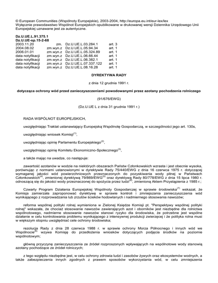 © European Communities (Wspólnoty Europejskie), 2003-2004, http://europa.eu.int/eur-lex/lex Wyłącznie prawodawstwo Wspólnot Europejskich opublikowane w drukowanej wersji Dziennika Urzędowego Unii Europejskiej uznawane jest za autentyczne. Dz.U.UE.L.91.375.1 Dz.U.UE-sp.15-2-68 2003.11.20 zm. 2004.08.02 zm.wyn.z 2006.01.01 zm.wyn.z data notyfikacji zm.wyn.z data notyfikacji zm.wyn.z data notyfikacji zm.wyn.z data notyfikacji zm.wyn.z Dz.U.UE.L.03.284.1 Dz.U.UE.L.05.94.34 Dz.U.UE.L.05.324.89 Dz.U.UE.L.06.66.44 Dz.U.UE.L.06.382.1 Dz.U.UE.L.07.337.122 Dz.U.UE.L.08.16.28 art. 3 art. 1 art. 1 art. 1 art. 1 art. 1 art. 1 DYREKTYWA RADY z dnia 12 grudnia 1991 r. dotycząca ochrony wód przed zanieczyszczeniami powodowanymi przez azotany pochodzenia rolniczego (91/676/EWG) (Dz.U.UE L z dnia 31 grudnia 1991 r.) RADA WSPÓLNOT EUROPEJSKICH, uwzględniając Traktat ustanawiający Europejską Wspólnotę Gospodarczą, w szczególności jego art. 130s, (1) uwzględniając wniosek Komisji , (2) uwzględniając opinię Parlamentu Europejskiego , (3) uwzględniając opinię Komitetu Ekonomiczno-Społecznego , a także mając na uwadze, co następuje: zawartość azotanów w wodzie na niektórych obszarach Państw Członkowskich wzrasta i jest obecnie wysoka, porównując z normami ustanowionymi w dyrektywie Rady 75/440/EWG z dnia 16 czerwca 1975 r. dotyczącej wymaganej jakości wód powierzchniowych przeznaczonych do pozyskiwania wody pitnej w Państwach (4) (5) Członkowskich , zmienionej dyrektywą 79/869/EWG oraz dyrektywą Rady 80/778/EWG z dnia 15 lipca 1980 r. (6) odnoszącą się do jakości wody przeznaczonej do spożycia przez ludzi , zmienioną Aktem Przystąpienia z 1985 r.; (7) Czwarty Program Działania Europejskiej Wspólnoty Gospodarczej w sprawie środowiska wskazał, że Komisja zamierzała zaproponować dyrektywę w sprawie kontroli i zmniejszania zanieczyszczenia wód wynikającego z rozprowadzania lub zrzutów ścieków hodowlanych i nadmiernego stosowania nawozów; reforma wspólnej polityki rolnej wymieniona w Zielonej Księdze Komisji pt. "Perspektywy wspólnej polityki rolnej" wskazała, że chociaż stosowanie nawozów zawierających azot i oborników jest niezbędne dla rolnictwa wspólnotowego, nadmierne stosowanie nawozów stanowi ryzyko dla środowiska, że potrzebne jest wspólne działanie w celu kontrolowania problemu wynikającego z intensywnej produkcji zwierzęcej i że polityka rolna musi w większym stopniu uwzględniać cele ochrony środowiska; rezolucja Rady z dnia 28 czerwca 1988 r. w sprawie ochrony Morza Północnego i innych wód we (8) Wspólnocie wzywa Komisję do przedłożenia wniosków dotyczących podjęcia środków na poziomie wspólnotowym; główną przyczynę zanieczyszczenia ze źródeł rozproszonych wpływających na wspólnotowe wody stanowią azotany pochodzące ze źródeł rolniczych; z tego względu niezbędne jest, w celu ochrony zdrowia ludzi i zasobów żywych oraz ekosystemów wodnych, a także zabezpieczenia innych zgodnych z prawem sposobów wykorzystania wód, w celu zmniejszenia zanieczyszczenia wód spowodowanego lub wywołanego przez azotany pochodzące ze źródeł rolniczych oraz w celu zapobieżenia dalszemu takiemu zanieczyszczaniu; w tym celu ważne jest podjęcie środków dotyczących składowania i rolniczego wykorzystania wszelkich związków azotu, oraz dotyczących tego pewnych praktyk zagospodarowania gruntów; ponieważ zanieczyszczenie wody spowodowane przez azotany w jednym Państwie Członkowskim może oddziaływać na wody w innych Państwach Członkowskich, niezbędne jest z tego względu działanie na poziomie wspólnotowym zgodnie z art. 130r; przez zachęcanie do stosowania dobrych praktyk rolniczych Państwa Członkowskie mogą zapewnić wszystkim wodom ogólny poziom ochrony przed zanieczyszczeniem w przyszłości; niektóre strefy, z których mają miejsce spływy do wód podatnych na zanieczyszczenie związkami azotu, wymagają szczególnej ochrony; niezbędne jest, aby Państwa Członkowskie określiły strefy zagrożenia oraz ustanowiły i wprowadziły w życie programy działania w celu zmniejszenia zanieczyszczenia wody związkami azotu w tych strefach; takie programy działania powinny obejmować środki mające na celu ograniczenie rolniczego wykorzystania wszelkich nawozów zawierających azot oraz w szczególności ustalenie specjalnych ograniczeń dotyczących stosowania odchodów zwierzęcych pochodzącego od zwierząt gospodarskich; niezbędne jest monitorowanie wód i stosowanie referencyjnych metod pomiarów w odniesieniu do związków azotu w celu zapewnienia, że środki są skuteczne; uznaje się, iż warunki hydrogeologiczne w niektórych Państwach Członkowskich są tego rodzaju, że może upłynąć wiele lat, zanim działania w zakresie ochrony doprowadzą do poprawy jakości wody; należy powołać Komitet do celów wspierania Komisji w sprawach odnoszących się do wykonania niniejszej dyrektywy oraz do jej dostosowania do postępu naukowo-technicznego; Państwa Członkowskie powinny ustanowić i przedstawić Komisji sprawozdania w sprawie wykonania niniejszej dyrektywy; Komisja powinna regularnie przedstawiać sprawozdania w sprawie wykonania niniejszej dyrektywy przez Państwa Członkowskie, PRZYJMUJE NINIEJSZĄ DYREKTYWĘ: Artykuł 1 – – Niniejsza dyrektywa ma na celu: zmniejszenie zanieczyszczenia wody spowodowanego lub wywołanego przez azotany pochodzące ze źródeł rolniczych, oraz zapobieganie dalszemu zanieczyszczeniu. Artykuł 2 a) b) c) d) e) f) g) h) Do celów niniejszej dyrektywy: "wody podziemne" oznaczają wszelkie wody znajdujące się pod powierzchnią ziemi w warstwie wodonośnej oraz w bezpośredniej styczności z gruntem lub podglebiem; "wody słodkie" oznaczają naturalnie występujące wody o niskim stężeniu soli, które są często akceptowane jako odpowiednie do poboru i uzdatniania w celu wyprodukowania wody pitnej; "związek azotu" oznacza każd