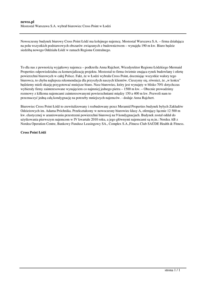 newss.pl Mostostal Warszawa S.A. wybrał biurowiec Cross Point w Łodzi Nowoczesny budynek biurowy Cross Point Łódź ma kolejnego najemcę. Mostostal Warszawa S.A. – firma działająca na polu wszystkich podstawowych obszarów związanych z budownictwem – wynajęła 190 m kw. Biuro będzie siedzibą nowego Oddziału Łódź w ramach Regionu Centralnego. To dla nas z pewnością wyjątkowy najemca – podkreśla Anna Rajchert, Wicedyrektor Regionu Łódzkiego Mermaid Properties odpowiedzialna za komercjalizację projektu. Mostostal to firma świetnie znająca rynek budowlany i ofertę powierzchni biurowych w całej Polsce. Fakt, że w Łodzi wybrała Cross Point, doceniając wszystkie walory tego biurowca, to chyba najlepsza rekomendacja dla przyszłych naszych klientów. Cieszymy się, również, że „w końcu” będziemy mieli okazję przygotować mniejsze biuro. Nasz biurowiec, który jest wynajęty w blisko 70% dotychczas wybierały firmy zainteresowane wynajęciem co najmniej jednego pietra – 1500 m kw. – Obecnie prowadzimy rozmowy z kilkoma najemcami zainteresowanymi powierzchniami między 150 a 400 m kw. Pozwoli nam to przeznaczyć jedną całą kondygnację na potrzeby mniejszych najemców. - dodaje Anna Rajchert. Biurowiec Cross Point Łódź to zrewitalizowany i rozbudowany przez Meramid Properties budynek byłych Zakładów Odzieżowych im. Adama Próchnika. Przekształcony w nowoczesny biurowiec klasy A, oferujący łącznie 12 500 m kw. elastycznej w aranżowaniu przestrzeni powierzchni biurowej na 9 kondygnacjach. Budynek został oddał do użytkowania pierwszym najemcom w IV kwartale 2010 roku, a jego głównymi najemcami są m.in.: Nordea AB z Nordea Operation Centre, Bankowy Fundusz Leasingowy SA., Complex S.A.,Fitness Club SAÚDE Health & Fitness. Cross Point Łódź strona 1 / 1