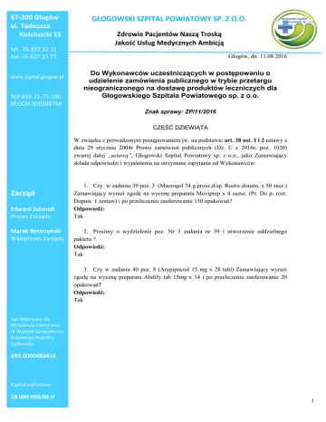 67-200 Głogów ul. Tadeusza Kościuszki 15 tel. 76 837 32 11 fax. 76 837 33 77 www.szpital.glogow.pl NIP 693-21-75-190 REGON 000308784 GŁOGOWSKI SZPITAL POWIATOWY SP. Z O.O. Zdrowie Pacjentów Naszą Troską Jakośd Usług Medycznych Ambicją Głogów, dn. 11.08.2016 Do Wykonawców uczestniczących w postępowaniu o udzielenie zamówienia publicznego w trybie przetargu nieograniczonego na dostawę produktów leczniczych dla Głogowskiego Szpitala Powiatowego sp. z o.o. Znak sprawy: ZP/11/2016 CZĘŚĆ DZIEWIĄTA W związku z prowadzonym postępowaniem jw. na podstawie art. 38 ust. 1 i 2 ustawy z dnia 29 stycznia 2004r Prawo zamówień publicznych (Dz. U z 2016r, poz. 1020) zwanej dalej „ustawą”, Głogowski Szpital Powiatowy sp. z o.o., jako Zamawiający składa odpowiedzi i wyjaśnienia na otrzymane zapytania od Wykonawców: Zarząd Edward Schmidt Prezes Zarządu Marek Bestrzyoski Wiceprezes Zarządu 1. Czy w zadaniu 39 poz. 3 (Macrogol 74 g prosz.d/sp. Roztw.doustn, x 50 sasz.) Zamawiający wyrazi zgodę na wycenę preparatu Moviprep x 4 sazsz. (Pr. Do p. rozt. Dopust. 1 zestaw) i po przeliczeniu zaoferowanie 150 opakowań? Odpowiedź: Tak 2. Prosimy o wydzielenie poz. Nr 3 zadania nr 39 i utworzenie oddzielnego pakietu ? Odpowiedź: Tak 3. Czy w zadaniu 40 poz. 8 (Arypiprazol 15 mg x 28 tabl) Zamawiający wyrazi zgodę na wycenę preparatu Abilify tab 15mg x 14 i po przeliczeniu zaoferowanie 20 opakowań? Odpowiedź: Tak Sąd Rejonowy dla Wrocławia Fabrycznej IX Wydział Gospodarczy Krajowego Rejestru Sądowego KRS 0000483416 Kapitał zakładowy 18 000 000,00 zł 1 2