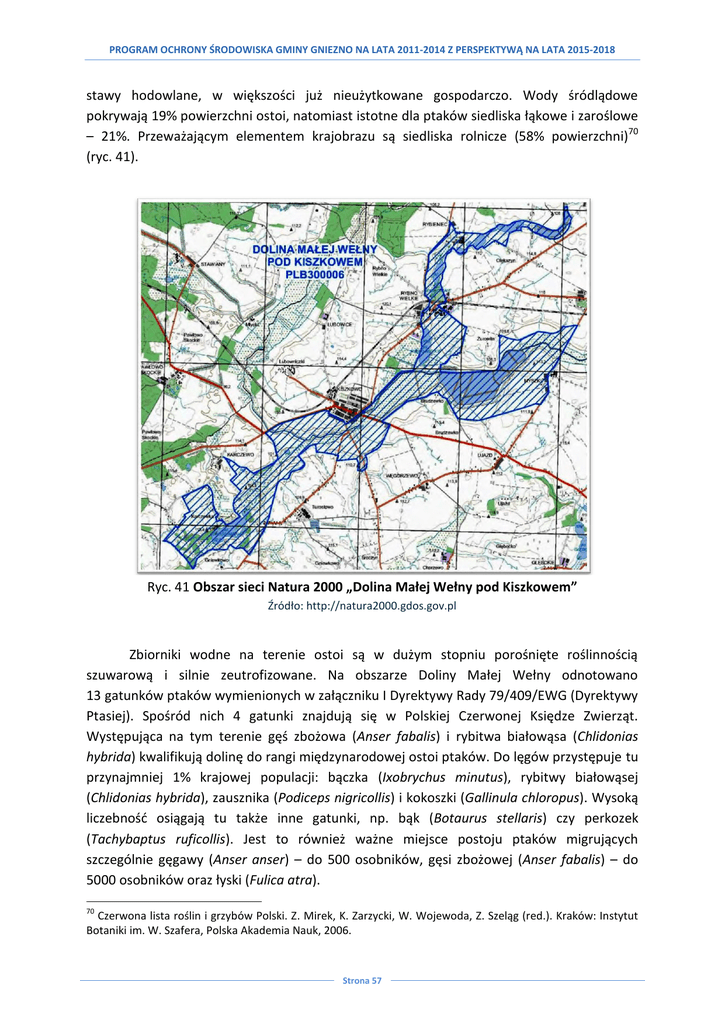PROGRAM OCHRONY ŚRODOWISKA GMINY GNIEZNO NA LATA 2011-2014 Z PERSPEKTYWĄ NA LATA 2015-2018 stawy hodowlane, w większości już nieużytkowane gospodarczo. Wody śródlądowe pokrywają 19% powierzchni ostoi, natomiast istotne dla ptaków siedliska łąkowe i zaroślowe – 21%. Przeważającym elementem krajobrazu są siedliska rolnicze (58% powierzchni)70 (ryc. 41). Ryc. 41 Obszar sieci Natura 2000 „Dolina Małej Wełny pod Kiszkowem” Źródło: http://natura2000.gdos.gov.pl Zbiorniki wodne na terenie ostoi są w dużym stopniu porośnięte roślinnością szuwarową i silnie zeutrofizowane. Na obszarze Doliny Małej Wełny odnotowano 13 gatunków ptaków wymienionych w załączniku I Dyrektywy Rady 79/409/EWG (Dyrektywy Ptasiej). Spośród nich 4 gatunki znajdują się w Polskiej Czerwonej Księdze Zwierząt. Występująca na tym terenie gęś zbożowa (Anser fabalis) i rybitwa białowąsa (Chlidonias hybrida) kwalifikują dolinę do rangi międzynarodowej ostoi ptaków. Do lęgów przystępuje tu przynajmniej 1% krajowej populacji: bączka (Ixobrychus minutus), rybitwy białowąsej (Chlidonias hybrida), zausznika (Podiceps nigricollis) i kokoszki (Gallinula chloropus). Wysoką liczebnośd osiągają tu także inne gatunki, np. bąk (Botaurus stellaris) czy perkozek (Tachybaptus ruficollis). Jest to również ważne miejsce postoju ptaków migrujących szczególnie gęgawy (Anser anser) – do 500 osobników, gęsi zbożowej (Anser fabalis) – do 5000 osobników oraz łyski (Fulica atra). 70 Czerwona lista roślin i grzybów Polski. Z. Mirek, K. Zarzycki, W. Wojewoda, Z. Szeląg (red.). Kraków: Instytut Botaniki im. W. Szafera, Polska Akademia Nauk, 2006. Strona 57 PROGRAM OCHRONY ŚRODOWISKA GMINY GNIEZNO NA LATA 2011-2014 Z PERSPEKTYWĄ NA LATA 2015-2018 Zagrożeniami dla tego obszaru są zaniechanie dotychczasowego użytkowanie rolnego terenów otaczających dolinę oraz zwiększenie antropopresji poprzez niekontrolowany rozwój turystki, kłusownictwo, zanieczyszczenia wód i siedlisk przyrodniczych. Ponadto negatywnie oddziałują także wzmożony hałas, który może płoszyd ptaki osiedlające się na tym terenie oraz penetrowanie siedlisk przez zwierzęta domowe lub ludzi. Istotnym z punktu widzenia gniazdowania i migracji ptaków obszarem w sąsiedztwie Gminy Gniezno jest także obszar wokół jezior: Ostrowickiego i Popielewskiego położonych na terenie gminy Trzemeszno (jezioro Popielewskie) oraz na granicy gminy Trzemeszno i Witkowo (jezioro Ostrowickie). Jezioro Popielewskie położone jest w dorzeczu Noteci. Jest to jezioro rynnowe z wysokim i bezleśnym brzegiem, którego powierzchnia zwierciadła wody wynosi około 300 ha. Średnia głębokośd jeziora wynosi 12,4 m, natomiast głębokośd maksymalna 45,8 m71. Jest to najgłębsze jezioro w Wielkopolsce. Zbiornik jest połączony strugami z jeziorami: Ostrowickim, Szydłowskim, Malicz i Folusz. Jezioro Popielewskie wraz z Ostrowickim tworzą ważny obszar dla ptaków w okresie gniazdowania oraz migracji. Jezioro Ostrowickie znajduje się na obszarze objętym ochroną w ramach sieci Natura 2000 „Pojezierze Gnieźnieoskie”. Posiada urozmaiconą linię brzegową, a powierzchnia zwierciadła wody wynosi około 270 ha. Średnia głębokośd jeziora, to 8,3 m, natomiast głębokośd maksymalna wynosi 27,0 m72. Oba te jeziora stanowią miejsce koncentracji ptaków wodnych podczas wędrówek. W 2006 roku zaobserwowano 382 osobniki z 7 gatunków na Jeziorze Ostrowickim i 33 osobniki z 3 gatunków na Jeziorze Popielewskim73. Natomiast w listopadzie 2007 zaobserwowano na Jeziorze Ostrowickim 326 osobników z 12 różnych gatunków, a Popielewskim 214 osobników z 7 gatunków74. Dominują tam różne gatunki kaczek oraz łyska (Fulica atra). Występuje także osobniki gęsi zbożowej (Anser fabalis) i gęsi białoczelnej (Anser albifrons). Na podstawie opracowanie „Obszary ważne dla ptaków w okresie gniazdowania oraz migracji na terenie województwa wielkopolskiego” wytypowano kompleks „Jezioro Popielewskie i Jezioro Ostrowickie” jako jeden z 30 najważniejszych zbiorników wodnych Wielkopolski dla ptaków w czasie migracji i zimowania75. Wśród ryb występują tu amur (Ctenopharyngodon idella), karp (Cyprinus Carpio), lin (Tinca tinca), okoo (Perca fluviatilis), płod (Rutilus rutilus), sandacz (Sander lucioperca), szczupak (Esox lucius), ukleja (Alburnus alburnus), węgorz (Anguilla anguilla) i wzdręga (Scardinius erythrophthalmus syn. Notemigonus crysoleucas roseus). 71 A. Choioski, Katalog jezior Polski, Wyd. UAM, Poznao 2006, s. 531 Tamże. 73 L. Kuczyoski, A. Winiecki, Z. Kosioski, Jeziora listopadowe 2006 – raport. 74 L. Kuczyoski, A. Winiecki, Z. Kosioski, Jeziora listopadowe 2007 – raport. 75 P. Wylęgała, S. Kuźniak, P. T. Dolata, Obszary ważne dla ptaków w okresie gniazdowania oraz migracji na terenie województwa wielkopolskiego, Poznao 2008. 72 Strona 58 PROGRAM OCHRONY ŚRODOWISKA GMINY GNIEZNO NA LATA 2011-2014 Z PERSPEKTYWĄ NA LATA 2015-2018 7. EDUKACJA EKOLOGICZNA Edukacja ekologiczna na terenie Gminy Gniezno prowadzona jest przede wszystkim poprzez placówki oświatowe. W Gminie funkcjonują 4 szkoły podstawowe w: Goślinowie, Jankowie Dolnym, Mnichowie i Modliszewku oraz 2 zespoły szkolno-gimnazjalne w: Szczytnikach Duchownych i Zdziechowie. Podejmowane w nich działania podzielid można na działania cykliczne oraz działania jednorazowe. W zakresie działao cyklicznych w każdej z jednostek obchodzone są „Dzieo Ziemi” oraz „Święto drzewa”, a także przeprowadzana jest akcja „Sprzątanie świata”. Poziom aktywności w ramach powyższych inicjatyw jest zróżnicowany, począwszy od organizacji apeli okolicznościowych, przygotowywania gazetek szkolnych i pogadanek tematycznych przeprowadzanych podczas zajęd lekcyjnych, po wycieczki szkolne, organizację konkursów dla uczniów i udział w inicjatywach zewnętrznych. W szerokim zakresie szkoły prowadzą także 