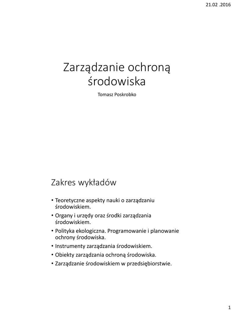 21.02 .2016 Zarządzanie ochroną środowiska Tomasz Poskrobko Zakres wykładów • Teoretyczne aspekty nauki o zarządzaniu środowiskiem. • Organy i urzędy oraz środki zarządzania środowiskiem. • Polityka ekologiczna. Programowanie i planowanie ochrony środowiska. • Instrumenty zarządzania środowiskiem. • Obiekty zarządzania ochroną środowiska. • Zarządzanie środowiskiem w przedsiębiorstwie. 1 21.02 .2016 Zakres ćwiczeń • Globalne i lokalne problemy środowiska przyrodniczego • Oceny odziaływania na środowisko • Zarządzanie środowiskiem według normy ISO 14001 Literatura • B. Poskrobko, T. Poskrobko, Zarządzanie środowiskiem w Polsce, PWE, Warszawa 2012 • A. Matuszak-Flejszman, System zarządzania środowiskowego w organizacji, Wyd. Akademii Ekonomicznej w Poznaniu, Poznań 2007 2 21.02 .2016 Teoretyczne aspekty nauki o zarządzaniu środowiskiem Tomasz Poskrobko Kształtowanie środowiska ANTROPOPRESJA Ochrona środowiska Użytkowanie środowiska 3 21.02 .2016 Ochrona środowiska • Ochrona środowiska – jest to ograniczanie lub ukierunkowanie korzystania z ożywionych i nieożywionych zasobów i walorów przyrody celem zapewnienia ciągłości ich użytkowania i utrzymania właściwej jakości elementów biosfery. • Ochrona środowiska wyraża się w ograniczeniach wolności osobistych, szczególnie w odniesieniu do dysponowania prywatną własnością zasobów i walorów przyrody; Kształtowanie środowiska • Kształtowanie środowiska jest to świadome wprowadzanie zmian w ekosystemach i krajobrazach czyli, pomoc człowieka w takim ukierunkowaniu ich rozwoju, który zapewni wysoki stopień ich samo reprodukcji i jednocześnie przyniesie możliwie największe korzyści gospodarcze i społeczne, zarówno obecnie, jak i w bliższej oraz dalszej perspektywie. 4 21.02 .2016 Kształtowanie środowiska • Kształtowanie środowiska polega na: • kompensacji, czyli uzupełnianiu brakujących (przeważnie wyeliminowanych przez człowieka) ogniw obiegu materii i energii w celu zwiększenia produktywności ekosystemów, ich zdolności asymilacyjnych lub poprawy walorów estetycznych i mikroklimatycznych środowiska, mających wpływ na przyrodnicze warunki życia i rozwoju człowieka • redukcji niektórych elementów ekosystemu lub krajobrazu, najczęściej nadmiernie rozwiniętych ze względu na wcześniejszą ingerencję człowieka; • rekultywacji, czyli odtworzeniu zdegradowanych ekosystemów przez wyeliminowanie czynników powodujących degradację, na przykład nadmierne zasolenie lub zbytnie odwodnienie; • kształtowaniu krajobrazów, stosownie do wymogów zachowania różnorodności biologicznej i normalnych – ukształtowanych w procesie ewolucji - środowiskowych warunków życia człowieka. Użytkowanie środowiska • korzystanie w sposób stały z zasobów, sił, procesów i walorów przyrody do celów gospodarczych. • Polega ono na: • zagospodarowaniu powierzchni i przestrzeni; • korzystaniu z ożywionych i nieożywionych zasobów naturalnych oraz z naturalnych nośników lub źródeł energii (np. siły wiatru lub wody); • wykorzystaniu procesów przyrodniczych, na przykład fotosyntezy w uprawach rolnych; • usuwaniu do środowiska odpadów w celu ich naturalnej asymilacji. 5 21.02 .2016 Gospodarowanie środowiskiem • Gospodarowanie środowiskiem jest to korzystanie z zasobów, walorów i usług środowiska dla zaspokojenia potrzeb osobniczych i społecznych ludzi, przy jednoczesnym: • ograniczaniu strat i zachowaniu największej ostrożności w przekształcaniu ekosystemów lub tworów geologicznych przy eksploatacji zasobów nieodnawialnych, • wspomaganiu procesów przyrodniczych poddawanych antropopresji przy użytkowaniu zasobów odnawialnych, celem zapewnienia trwałości i wydajności ich funkcjonowania, • wykorzystywaniu walorów, sił i procesów przyrodniczych, tak aby nie przerywać naturalnych dróg obiegu materii, energii i informacji w ekosystemach. Kształtowanie środowiska Użytkowanie środowiska Ochrona środowiska Gospodarowanie środowiskiem 6 21.02 .2016 Środowisko przyrodnicze Zasoby środowiska Walory środowiska Usługi środowiska Środowisko przyrodnicze Zasoby środowiska Walory środowiska Usługi środowiska 7 21.02 .2016 Zasoby naturalne • Zasoby naturalne to bogactwa mineralne i organiczne, wykorzystywane przez człowieka w jego procesie życiowym, działalności gospodarczej, twórczej i rekreacyjnej. • Zasoby mogą być: • odnawialne w długim okresie, np. gleba, drzewostany, • odnawialne w krótkim okresie, np. trawy lub inne rośliny jednoroczne i kilkuletnie • nieodnawialne zidentyfikowane: eksploatowane, rezerwowe; • nieodnawialne hipotetyczne i spekulatywne; Lesistość Polski wg województw Źródło: A. Wasiak, Raport o stanie lasów w Polsce, Warszawa 2014 8 21.02 .2016 Środowisko przyrodnicze Zasoby środowiska Walory środowiska Usługi środowiska 9 21.02 .2016 Walory środowiska • Walory środowiska są to specyficzne układy elementów materialnych i klimatycznych, które wykorzystuje się bez ich fizycznej eksploatacji, np. osobliwości przyrodnicze, mikroklimat, piękno krajobrazu, wzajemny układ (położenie zasobów); Środowisko przyrodnicze Zasoby środowiska Walory środowiska Usługi środowiska 10 21.02 .2016 Usługi środowiska • Usługi środowiska są to walory, siły i procesy przyrodnicze oraz efekty ich istnienia i funkcjonowania, które dostarczają pozamaterialnych wartości niezbędnych do życia i rozwoju ludzkości oraz do przebiegu przyrodniczych procesów gospodarczych. Usługi środowiska mogą być: • biologiczno-ekologiczne - usługą jest funkcjonowanie wszystkich tych procesów przyrody, dzięki którym habitat człowieka zapewnia wysoką jakość przyrodniczych podstaw jego życia i rozwoju • społeczno-gospodarcze - usługą środowiska jest wszystko to, co ma istotne znaczenie dla normalnego przebiegu proce