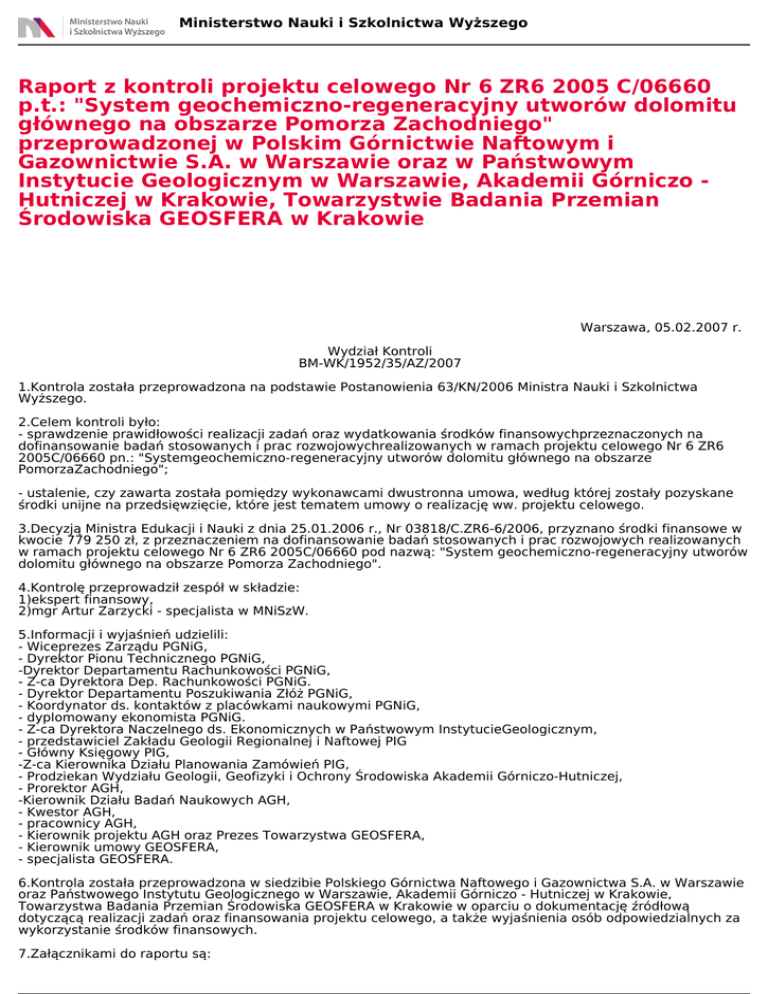Ministerstwo Nauki i Szkolnictwa Wyższego Raport z kontroli projektu celowego Nr 6 ZR6 2005 C/06660 p.t.: "System geochemiczno-regeneracyjny utworów dolomitu głównego na obszarze Pomorza Zachodniego" przeprowadzonej w Polskim Górnictwie Naftowym i Gazownictwie S.A. w Warszawie oraz w Państwowym Instytucie Geologicznym w Warszawie, Akademii Górniczo Hutniczej w Krakowie, Towarzystwie Badania Przemian Środowiska GEOSFERA w Krakowie Warszawa, 05.02.2007 r. Wydział Kontroli BM-WK/1952/35/AZ/2007 1.Kontrola została przeprowadzona na podstawie Postanowienia 63/KN/2006 Ministra Nauki i Szkolnictwa Wyższego. 2.Celem kontroli było: - sprawdzenie prawidłowości realizacji zadań oraz wydatkowania środków finansowychprzeznaczonych na dofinansowanie badań stosowanych i prac rozwojowychrealizowanych w ramach projektu celowego Nr 6 ZR6 2005C/06660 pn.: "Systemgeochemiczno-regeneracyjny utworów dolomitu głównego na obszarze PomorzaZachodniego"; - ustalenie, czy zawarta została pomiędzy wykonawcami dwustronna umowa, według której zostały pozyskane środki unijne na przedsięwzięcie, które jest tematem umowy o realizację ww. projektu celowego. 3.Decyzją Ministra Edukacji i Nauki z dnia 25.01.2006 r., Nr 03818/C.ZR6-6/2006, przyznano środki finansowe w kwocie 779 250 zł, z przeznaczeniem na dofinansowanie badań stosowanych i prac rozwojowych realizowanych w ramach projektu celowego Nr 6 ZR6 2005C/06660 pod nazwą: "System geochemiczno-regeneracyjny utworów dolomitu głównego na obszarze Pomorza Zachodniego". 4.Kontrolę przeprowadził zespół w składzie: 1)ekspert finansowy, 2)mgr Artur Zarzycki - specjalista w MNiSzW. 5.Informacji i wyjaśnień udzielili: - Wiceprezes Zarządu PGNiG, - Dyrektor Pionu Technicznego PGNiG, -Dyrektor Departamentu Rachunkowości PGNiG, - Z-ca Dyrektora Dep. Rachunkowości PGNiG. - Dyrektor Departamentu Poszukiwania Złóż PGNiG, - Koordynator ds. kontaktów z placówkami naukowymi PGNiG, - dyplomowany ekonomista PGNiG. - Z-ca Dyrektora Naczelnego ds. Ekonomicznych w Państwowym InstytucieGeologicznym, - przedstawiciel Zakładu Geologii Regionalnej i Naftowej PIG - Główny Księgowy PIG, -Z-ca Kierownika Działu Planowania Zamówień PIG, - Prodziekan Wydziału Geologii, Geofizyki i Ochrony Środowiska Akademii Górniczo-Hutniczej, - Prorektor AGH, -Kierownik Działu Badań Naukowych AGH, - Kwestor AGH, - pracownicy AGH, - Kierownik projektu AGH oraz Prezes Towarzystwa GEOSFERA, - Kierownik umowy GEOSFERA, - specjalista GEOSFERA. 6.Kontrola została przeprowadzona w siedzibie Polskiego Górnictwa Naftowego i Gazownictwa S.A. w Warszawie oraz Państwowego Instytutu Geologicznego w Warszawie, Akademii Górniczo - Hutniczej w Krakowie, Towarzystwa Badania Przemian Środowiska GEOSFERA w Krakowie w oparciu o dokumentację źródłową dotyczącą realizacji zadań oraz finansowania projektu celowego, a także wyjaśnienia osób odpowiedzialnych za wykorzystanie środków finansowych. 7.Załącznikami do raportu są: Ministerstwo Nauki i Szkolnictwa Wyższego -sprawozdanie eksperta finansowego, -opinia Departamentu Ekonomicznego Brak opinii Departamentu Badań Na Rzecz Gospodarki. 8.Ustalenia kontroli: - księgi rachunkowe spełniają wymogi określone w art. 21-24 ustawyz dnia 29 września 1994 roku o rachunkowości, - wykorzystanie środków budżetowych i wykonanie poszczególnych zadań przebiegaterminowo i zgodnie z umową o wykonanie projektu, - wnioskodawca i konsorcjum, jako wykonawca prowadzą rzetelnie dokumentacjęksięgową, zgodnie z wymogami ustawy o rachunkowości oraz politykąrachunkowości. - poniesione koszty na poszczególne zadania wynikają z prawidłowo opisanychdokumentów, sprawdzonych pod względem merytorycznym, rachunkowymi zatwierdzonych do wypłaty, - zakupów aparatury naukowo-badawczej dokonano zgodnie z wymogami ustawy:Prawo zamówień publicznych. - nie stwierdzono naruszenia przepisów ustawy z dnia 26.11.1998 o finansachpublicznych, - w kontrolowanych jednostkach prowadzone są odrębne analityki do rozliczaniaprojektów celowych, - nie stwierdzono zawarcia pomiędzy wykonawcami umowy, według którejzostałyby pozyskane środki unijne na przedsięwzięcie, które jest tematem umowyo realizację projektu celowego Nr 6 ZR6 2005C/06660. W.g. eksperta finansowego przeprowadzona kontrola nie wykazała nieprawidłowości. 9. Wnioskuję o wystosowanie do przedsiębiorcy: Polskie Górnictwo Naftowe i Gazownictwo S.A. w Warszawie Wnioskodawcy oraz do Państwowego Instytutu Geologicznego w Warszawie, Akademii Górniczo - Hutniczej w Krakowie, Towarzystwie Badania Przemian Środowiska GEOSFERA w Krakowie - Wykonawcy projektu celowego Nr 6 ZR6 2005C/06660 pisma pokontrolnego. Raport został zaakceptowany przez Ministra Nauki i Szkolnictwa Wyższego 6 lutego 2007 r. Powered by TCPDF (www.tcpdf.org)