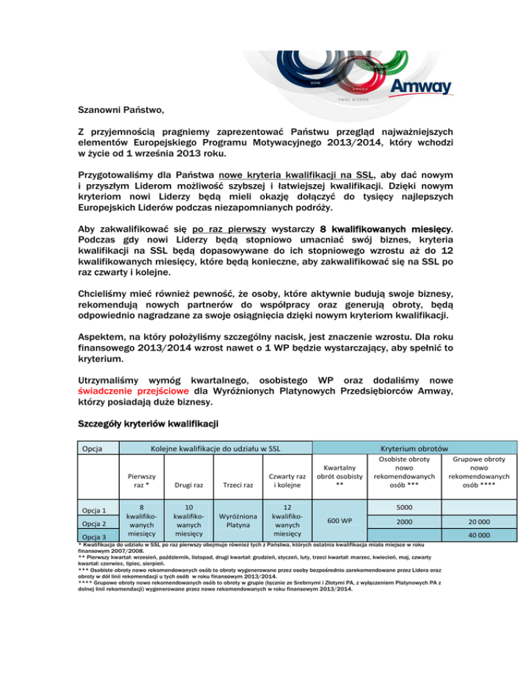 Szanowni Państwo, Z przyjemnością pragniemy zaprezentować Państwu przegląd najważniejszych elementów Europejskiego Programu Motywacyjnego 2013/2014, który wchodzi w życie od 1 września 2013 roku. Przygotowaliśmy dla Państwa nowe kryteria kwalifikacji na SSL, aby dać nowym i przyszłym Liderom możliwość szybszej i łatwiejszej kwalifikacji. Dzięki nowym kryteriom nowi Liderzy będą mieli okazję dołączyć do tysięcy najlepszych Europejskich Liderów podczas niezapomnianych podróży. Aby zakwalifikować się po raz pierwszy wystarczy 8 kwalifikowanych miesięcy. Podczas gdy nowi Liderzy będą stopniowo umacniać swój biznes, kryteria kwalifikacji na SSL będą dopasowywane do ich stopniowego wzrostu aż do 12 kwalifikowanych miesięcy, które będą konieczne, aby zakwalifikować się na SSL po raz czwarty i kolejne. Chcieliśmy mieć również pewność, że osoby, które aktywnie budują swoje biznesy, rekomendują nowych partnerów do współpracy oraz generują obroty, będą odpowiednio nagradzane za swoje osiągnięcia dzięki nowym kryteriom kwalifikacji. Aspektem, na który położyliśmy szczególny nacisk, jest znaczenie wzrostu. Dla roku finansowego 2013/2014 wzrost nawet o 1 WP będzie wystarczający, aby spełnić to kryterium. Utrzymaliśmy wymóg kwartalnego, osobistego WP oraz dodaliśmy nowe świadczenie przejściowe dla Wyróżnionych Platynowych Przedsiębiorców Amway, którzy posiadają duże biznesy. Szczegóły kryteriów kwalifikacji Opcja Opcja 1 Opcja 2 Opcja 3 Kolejne kwalifikacje do udziału w SSL Pierwszy raz * Drugi raz Trzeci raz 8 kwalifiko‐ wanych miesięcy 10 kwalifiko‐ wanych miesięcy Wyróżniona Platyna Czwarty raz i kolejne 12 kwalifiko‐ wanych miesięcy Kryterium obrotów Kwartalny obrót osobisty ** 600 WP Osobiste obroty nowo rekomendowanych osób *** Grupowe obroty nowo rekomendowanych osób **** 5000 2000 20 000 40 000 * Kwalifikacja do udziału w SSL po raz pierwszy obejmuje również tych z Państwa, których ostatnia kwalifikacja miała miejsce w roku finansowym 2007/2008. ** Pierwszy kwartał: wrzesień, październik, listopad, drugi kwartał: grudzień, styczeń, luty, trzeci kwartał: marzec, kwiecień, maj, czwarty kwartał: czerwiec, lipiec, sierpień. *** Osobiste obroty nowo rekomendowanych osób to obroty wygenerowane przez osoby bezpośrednio zarekomendowane przez Lidera oraz obroty w dół linii rekomendacji u tych osób w roku finansowym 2013/2014. **** Grupowe obroty nowo rekomendowanych osób to obroty w grupie (łącznie ze Srebrnymi i Złotymi PA, z wyłączeniem Platynowych PA z dolnej linii rekomendacji) wygenerowane przez nowo rekomendowanych w roku finansowym 2013/2014. Dodatkowe kryteria kwalifikacji do udziału w SSL: Dodatkowy wzrost obrotów: osoby kwalifikujące się po raz trzeci i kolejne muszą zwiększyć wysokość obrotów bazowych SSL w porównaniu do roku finansowego 2012/2013 o co najmniej 1 WP. Specjalne świadczenie przejściowe – bufor 10% Przedsiębiorcy Amway, którzy uzyskują średnio miesięcznie 5000 WP ponad wartość konieczną do kwalifikacji zgodnie z wymaganiami Planu Sprzedaży i Marketingu Amway, otrzymają dodatkową korzyść w postaci 10% buforu odnoszącego się do wymagań docelowego wzrostu obrotów. Poniżej przedstawiamy inne komponenty Europejskiego Programu Motywacyjnego 2013/2014: Program Rozwoju Wyróżnionej Platyny (PRWP) nadal nagradzać będzie Wyróżnionych Platynowych Przedsiębiorców Amway za tworzenie nowych grup kwalifikowanych. W ramach programu mogą oni otrzymać dodatkowo nawet do 4200 zł miesięcznie. Program Nowych Liderów (PNL) nadal nagradza Przedsiębiorców Amway za osiąganie nowych poziomów kwalifikacji. Jednorazowe wypłaty dla nowych Złotych, Platynowych oraz Wyróżnionych Platynowych Przedsiębiorców Amway zaczynają się od poziomu 3500 zł, aż do 35 000 zł. Przedsiębiorcy Amway na poziomie Szmaragdowym, Diamentowym lub wyższym mogą otrzymać nagrody za zdobywanie oraz utrzymywanie kolejnych poziomów kwalifikacji nawet do 210 000 zł. Nagroda za Dodatkową Grupę K12 (NDG) to dodatkowa nagroda motywacyjna w wysokości 70 000 zł dla Szmaragdów oraz wyższych kwalifikacji za zwiększenie liczby grup K12 w roku finansowym 2013/2014. Na początku nowego roku finansowego na stronie www.amway.pl dostępna będzie specjalna sekcja poświęcona Europejskiemu Programowi Motywacyjnemu 2013/2014. Sekcja zawierać będzie szczegółowe materiały dotyczące GIP: dokument „Odpowiedzi na pytania”, Dokument referencyjny, prezentacje oraz nowy wideoklip GIP 2013/2014. Życzymy Państwu powodzenia w osiąganiu swoich celów! Z poważaniem, Zespół Marketingu Europejskiego