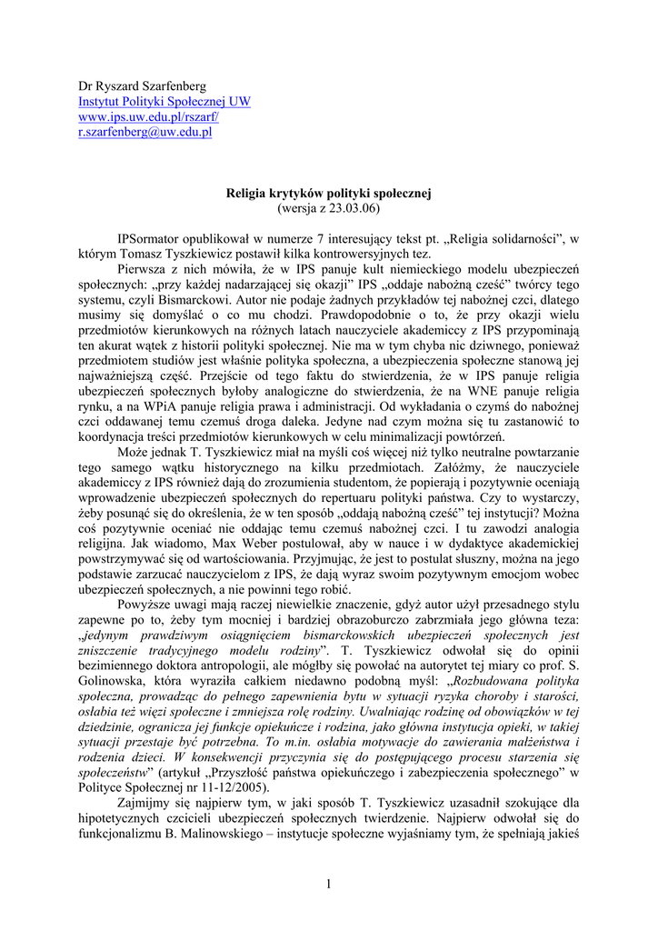 Dr Ryszard Szarfenberg Instytut Polityki Społecznej UW www.ips.uw.edu.pl/rszarf/ [email protected] Religia krytyków polityki społecznej (wersja z 23.03.06) IPSormator opublikował w numerze 7 interesujący tekst pt. „Religia solidarności”, w którym Tomasz Tyszkiewicz postawił kilka kontrowersyjnych tez. Pierwsza z nich mówiła, że w IPS panuje kult niemieckiego modelu ubezpieczeń społecznych: „przy każdej nadarzającej się okazji” IPS „oddaje nabożną cześć” twórcy tego systemu, czyli Bismarckowi. Autor nie podaje żadnych przykładów tej nabożnej czci, dlatego musimy się domyślać o co mu chodzi. Prawdopodobnie o to, że przy okazji wielu przedmiotów kierunkowych na różnych latach nauczyciele akademiccy z IPS przypominają ten akurat wątek z historii polityki społecznej. Nie ma w tym chyba nic dziwnego, ponieważ przedmiotem studiów jest właśnie polityka społeczna, a ubezpieczenia społeczne stanową jej najważniejszą część. Przejście od tego faktu do stwierdzenia, że w IPS panuje religia ubezpieczeń społecznych byłoby analogiczne do stwierdzenia, że na WNE panuje religia rynku, a na WPiA panuje religia prawa i administracji. Od wykładania o czymś do nabożnej czci oddawanej temu czemuś droga daleka. Jedyne nad czym można się tu zastanowić to koordynacja treści przedmiotów kierunkowych w celu minimalizacji powtórzeń. Może jednak T. Tyszkiewicz miał na myśli coś więcej niż tylko neutralne powtarzanie tego samego wątku historycznego na kilku przedmiotach. Załóżmy, że nauczyciele akademiccy z IPS również dają do zrozumienia studentom, że popierają i pozytywnie oceniają wprowadzenie ubezpieczeń społecznych do repertuaru polityki państwa. Czy to wystarczy, żeby posunąć się do określenia, że w ten sposób „oddają nabożną cześć” tej instytucji? Można coś pozytywnie oceniać nie oddając temu czemuś nabożnej czci. I tu zawodzi analogia religijna. Jak wiadomo, Max Weber postulował, aby w nauce i w dydaktyce akademickiej powstrzymywać się od wartościowania. Przyjmując, że jest to postulat słuszny, można na jego podstawie zarzucać nauczycielom z IPS, że dają wyraz swoim pozytywnym emocjom wobec ubezpieczeń społecznych, a nie powinni tego robić. Powyższe uwagi mają raczej niewielkie znaczenie, gdyż autor użył przesadnego stylu zapewne po to, żeby tym mocniej i bardziej obrazoburczo zabrzmiała jego główna teza: „jedynym prawdziwym osiągnięciem bismarckowskich ubezpieczeń społecznych jest zniszczenie tradycyjnego modelu rodziny”. T. Tyszkiewicz odwołał się do opinii bezimiennego doktora antropologii, ale mógłby się powołać na autorytet tej miary co prof. S. Golinowska, która wyraziła całkiem niedawno podobną myśl: „Rozbudowana polityka społeczna, prowadząc do pełnego zapewnienia bytu w sytuacji ryzyka choroby i starości, osłabia też więzi społeczne i zmniejsza rolę rodziny. Uwalniając rodzinę od obowiązków w tej dziedzinie, ogranicza jej funkcje opiekuńcze i rodzina, jako główna instytucja opieki, w takiej sytuacji przestaje być potrzebna. To m.in. osłabia motywacje do zawierania małżeństwa i rodzenia dzieci. W konsekwencji przyczynia się do postępującego procesu starzenia się społeczeństw” (artykuł „Przyszłość państwa opiekuńczego i zabezpieczenia społecznego” w Polityce Społecznej nr 11-12/2005). Zajmijmy się najpierw tym, w jaki sposób T. Tyszkiewicz uzasadnił szokujące dla hipotetycznych czcicieli ubezpieczeń społecznych twierdzenie. Najpierw odwołał się do funkcjonalizmu B. Malinowskiego – instytucje społeczne wyjaśniamy tym, że spełniają jakieś 1 pozytywne funkcje w stosunku do społeczeństwa. Rodzina i ubezpieczenie społeczne są to instytucje tego rodzaju, ale – jak twierdzi autor – konkurencyjne, ponieważ wypełniają te same funkcje „wsparcia i opieki” wobec jednostek, które tego potrzebują. W tej konkurencji z czasem zaczynają wygrywać coraz bardziej rozrastające się z różnych powodów ubezpieczenia społeczne. Konsekwencją tych procesów jest „oszczędny” model rodziny (rodzina nuklearna) w stosunku do wielopokoleniowej rodziny rozszerzonej. Na tym etapie nie wiemy jeszcze, czy model oszczędnościowy jest lepszy czy gorszy, ale T. Tyszkiewicz nie pozostawia niedomówień: „Stało się to jednak kosztem alienacji tych osób, które zostały wyłączne z nowego modelu, ale nie pozostało też bez wpływu na osoby w rodzinie pozostające, lecz wyrugowane z tradycji i kultury”. W skrócie, ubezpieczenia społeczne wygrały w konkurencji z rodziną, co spowodowało zmianę jej modelu na taki, który wyklucza jakieś bliżej nieokreślone osoby. Opowiem nieco inną historię, która jest również zgodna z teorią funkcjonalizmu. Dawno, dawno temu, było sobie społeczeństwo rolnicze ze swoim zestawem instytucji, wśród których znajdowała się tradycyjna, patriarchalna, wielopokoleniowa i wielodzietna rodzina chłopska. W wyniku uprzemysłowienia, urbanizacji i wzrostu gospodarczego, społeczeństwo rolnicze razem z charakterystycznym dla siebie układem i kształtem instytucji odeszło w przeszłość lub stało się enklawą. W bólach rodził się nowy porządek społeczny charakterystyczny dla zurbanizowanego społeczeństwa przemysłowego, czyli taki zestaw instytucji, który miał w nowych warunkach zapewnić równowagę społeczną, wśród nich znalazło się ubezpieczenie społeczne. Zastanówmy się teraz, jak uprzemysłowienie i urbanizacja wpłynęły na rodzinę? Zatrudnienie poza gospodarstwem domowym i praca od świtu do zmierzchu przez 6 dni w tygodniu w fabryce sprawiły, że tradycyjna głowa rodziny prawie znika z domu. Płace wolnorynkowe są za indywidualną wydajność i nie uwzględniają tego, że możemy mieć kogoś na utrzymaniu, a przy tym były one niskie, co sprawiało, że kobiety również musiały pracować poza domem, dzieci ni