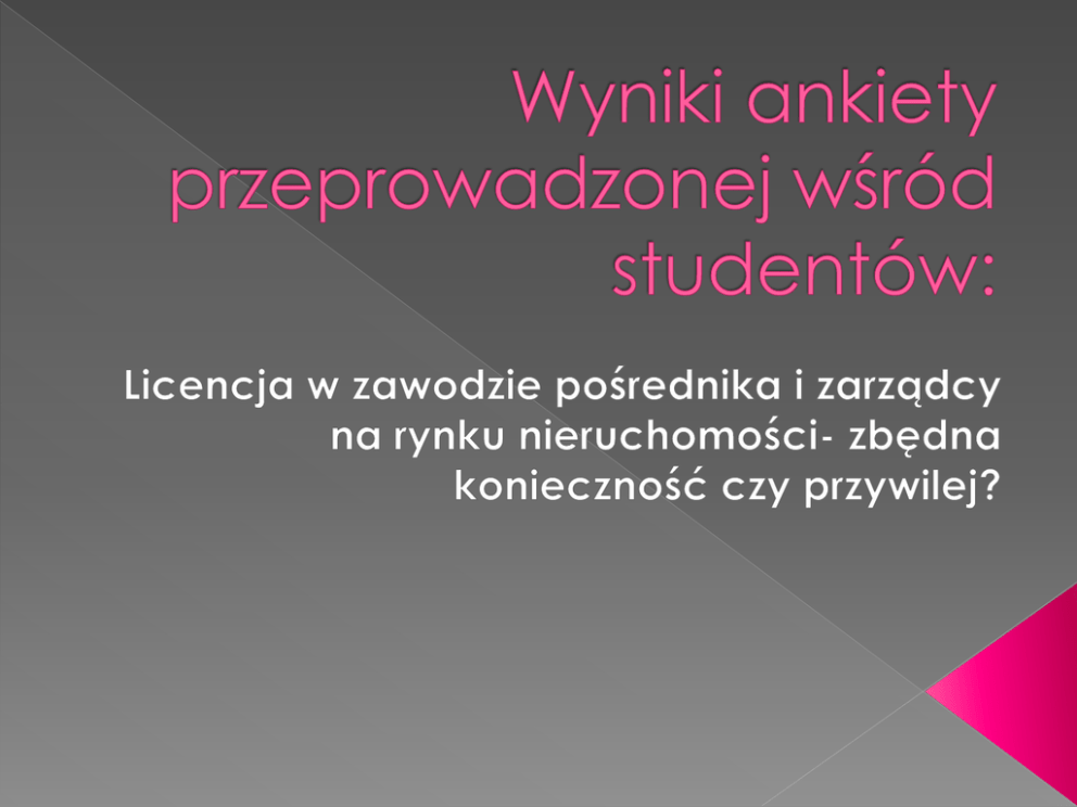 Liczba respondentów: 42 mężczyzn 20 62 Płeć: kobiet mężczyzna 33% kobieta 67% Uniwersytet WarmińskoMazurski 6% Uniwersytet inne 2% Ekonomiczny w Poznaniu 22% Akademia Ekonomiczna w Katowicach 70% inne 1 15 zarządzanie rachunkowość gospodarka przestrzenna finanse ekonomia 1 10 12 23 9 V rok studiów jednolitych magisterskich 12 IV rok studiów jednolitych magisterskich II rok studiów drugiego stopnia 2 9 I rok studiów drugiego stopnia 18 III rok studiów pierwszego stopnia 10 II rok studiów pierwszego stopnia I rok studiów pierwszego stopnia 2 rzeczoznawca nieruchomości 51% zarządca nieruchomości pośrednik w obrocie nieruchomościami 49% 48% Tak 13% Nie 87% licencjonowani pośrednicy narzucają wysokie prowizje 1 i tak wykonują ten zawód ludzie bez licencji zawód ten może wykonywać każdy, bez przygotowania 7 0 4 zbyt kosztowna zbyt skomplikowana procedura przyznawania licencji 2 ogranicza konkurencję 2 ogranicza swobodę działalności 2 napływ do zawodu osób z wykształceniem wyższym prawniczym i ekonomicznym 11 upadek małych biur nieruchomości 3 konieczność przestrzegania praw i standardów etycznych i zawodowych 18 wymóg podnoszenia kwalifikacji zawodowych doskonalenia 21 bardzo często przedmiotem obrotu jest dorobek całego życia klienta zapewnia szybkie, kompleksowe i profesjonalne wykonanie usługi 20 0 zapewnia bezpieczeństwo transakcji jest gwarancją satysfakcji klienta dostarcza niezbędnej wiedzy z zakresu nieruchomości profesjonalne przygotowanie do zawodu - praktyka 24 7 24 37 wymagania otrzymania licencji powinny być bardziej restrykcyjne powinno się wymyślić inne zasady odbywania praktyk pośrednik powinien reprezentować jedną stronę transakcji zakres działań pośrednika powinien poszerzyć się na fachowe doradztwo w tej dziedzinie oraz prowadzenie negocjacji w imieniu klienta, a nie bierne w nich uczestniczenie jak dzieje się aktualnie. Licencja w zawodzie pośrednika i zarządcy na rynku nieruchomości- zbędna konieczność czy przywilej?