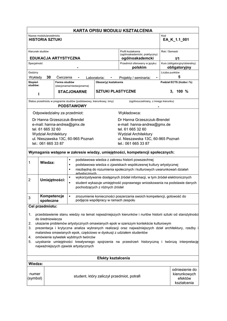 KARTA OPISU MODUŁU KSZTAŁCENIA Nazwa modułu/przedmiotu Kod HISTORIA SZTUKI EA_K_1.1_001 Kierunek studiów EDUKACJA ARTYSTYCZNA Specjalność - Profil kształcenia (ogólnoakademicki, praktyczny) Rok / Semestr ogólnoakademcki CKI oferowany w języku: Przedmiot polskim Kurs (obligatoryjny/obieralny) AU-K-K601/602 I/1 obligatoryjny Liczba punktów Godziny Wykłady : 30 Stopień studiów: Ćwiczenia - Laboratoria: : Forma studiów (stacjonarna/niestacjonarna) STACJONARNE I - Podział ECTS (liczba i %) Dr Hanna Grzeszczuk-Brendel e-mail: [email protected] tel. 61 665 32 60 Wydział Architektury ul. Nieszawska 13C, 60-965 Poznań tel.: 061 665 33 87 3, 100 % (ogólnouczelniany, z innego kierunku) PODSTAWOWY Odpowiedzialny za przedmiot: 5 - SZTUKI PLASTYCZNE Status przedmiotu w programie studiów (podstawowy, kierunkowy, inny) Liczba punktów Projekty / seminaria: Obszar(y) kształcenia xx Wykładowca: xxx Dr Hanna Grzeszczuk-Brendel e-mail: [email protected] tel. 61 665 32 60 Wydział Architektury ul. Nieszawska 13C, 60-965 Poznań tel.: 061 665 33 87 Wymagania wstępne w zakresie wiedzy, umiejętności, kompetencji społecznych: 1 Wiedza: 2 Umiejętności: 3 Kompetencje społeczne podstawowa wiedza z zakresu historii powszechnej podstawowa wiedza o zjawiskach współczesnej kultury artystycznej niezbędną do rozumienia społecznych i kulturowych uwarunkowań działań artystycznych wykorzystywanie dostępnych źródeł informacji, w tym źródeł elektronicznych student wykazuje umiejętność poprawnego wnioskowania na podstawie danych pochodzących z różnych źródeł zrozumienie konieczności poszerzania swoich kompetencji, gotowość do podjęcia współpracy w ramach zespołu Cel przedmiotu: 1. 2. 3. 4. 5. przedstawienie stanu wiedzy na temat najważniejszych kierunków i nurtów historii sztuki od starożytności do średniowiecza ukazanie problemów artystycznych omawianych epok w szerszym kontekście kulturowym prezentacja i krytyczna analiza wybranych realizacji oraz najważniejszych dzieł architektury, rzeźby i malarstwa omawianych epok, częściowo w dyskusji z udziałem studentów omówienie sylwetek wybitnych twórców uzyskanie umiejętności kreatywnego spojrzenia na przestrzeń historyczną i twórczą interpretację najważniejszych zjawisk artystycznych Efekty kształcenia Wiedza: numer (symbol) student, który zaliczył przedmiot, potrafi odniesienie do kierunkowych efektów kształcenia EA_W0 5 EA_W0 8 EA_W1 0 EA_W1 1 EA_W1 2 EA_W1 8 zna i rozumie wpływ obszarów kulturowych na podejście do zjawiska twórczości A1_W11 rozumie znaczenie wpływów tradycji na nowe tendencje w sztukach plastycznych, a także zna najważniejszych przedstawicieli oraz ich dokonania w kontekście wpływu na sztukę współczesną A1_W11 posiada wiedzę o publikacjach, związanych z poszczególnymi dyscyplinami plastycznymi A1_W11 ma wiedzę dotyczącą historii sztuki i tradycji twórczych w aspekcie kulturowym, religijnym, społecznym i politycznym A1_W12 ma podstawową wiedzę o sztuce współczesnej i trendach rozwojowych z zakresu sztuk plastycznych oraz zna publikacje związane z tymi problemami A1_W12 zna powiązania i zależności pomiędzy teoretycznymi i praktycznymi elementami związanymi ze studiowanym kierunkiem oraz rozumie znaczenie wyboru odpowiednich środków w realizacji zadania, wynikających z tych powiązań i zależności A1_W15 Umiejętności: numer (symbol) EU_U15 student, który zaliczył przedmiot, potrafi umie współdziałać z osobami drugimi przy projektowaniu i realizacjach prac zespołowych EU_U19 ma świadomość i umiejętność samokształcenia EU_U23 potrafi przygotować ustne lub pisemne prezentacje dotyczące różnych dziedzin plastyki odniesienie do kierunkowych efektów kształcenia A1_U18 A1_U20 A1_U22 EU_U24 potrafi świadomie i krytycznie korzystać z dostępnych źródeł wiedzy A1_U22 EU_U25 umie rozpoznawać stylistyczne zjawiska artystyczne i określać je historycznie A1_U22 posługuje się językiem angielskim w stopniu pozwalającym na porozumienie się EU_U26 oraz posiada zasób słownictwa specjalistycznego, pozwalający na czytanie ze zrozumieniem tekstów związanych ze sztukami plastycznymi A1_U23 Kompetencje społeczne: numer (symbol) EA_K03 student, który zaliczył przedmiot, potrafi potrafi elastycznie dostosować się do zmieniających się warunków posiada umiejętność kontroli własnych zachowań w stosunkach EA_K04 interpersonalnych EA_K06 EA_K07 potrafi efektywnie komunikować się w ramach wspólnych przedsięwzięć potrafi organizować stanowisko pracy Sposoby sprawdzenia efektów kształcenia odniesienie do kierunkowych efektów kształcenia A1_K03 A1_K03 A1_K05 A1_K05 Cykl wykładów z przedmiotu Historia sztuki kończy się egzaminem. Studenci otrzymują listę obowiązujących zagadnień egzaminacyjnych. Przewidziane są dwa egzaminy sesyjne, przy czym drugi termin jest terminem poprawkowym. Egzamin z przedmiotu Historia sztuki jest ustny, traktowany jako sprawdzian wymaganej wiedzy, omawiania dzieł i sylwetek twórców prezentowanych w ramach wykładów, umiejętności kojarzenia procesów artystycznych i kulturowych. Warunkiem dopuszczenia do egzaminu jest obecność na wykładach i zaliczenie kolokwium terminologicznego Ocena formująca kolokwium sprawdzające opanowanie fachowej terminologii Przyjęta skala ocen: 3,0; 3,5; 4,0; 4,5; 5,0 Ocena podsumowująca: ocena uzyskana w trakcie egzaminu ustnego Przyjęta skala ocen: 3,0; 3,5; 4,0; 4,5; 5,0 Treści programowe Wykład: 1, 2. Specyficzne podstawy sztuki egipskiej, rola państwa i religii w sztuce, trwałość form i ich wariacje, najważniejsze dzieła architektury, malarstwa i rzeźby. 3. Sztuka kreteńska i mykeńska. 4,5. Omówienie zasad rozwojowych architektury i rzeźby greckiej, ideałów piękna i tendencji realistycznych. 6. Sztuka etruska, związki ze sztuką grecką i wpływ na sztukę rzymską. 7,8. Państwowe związki architektury rzymskiej
