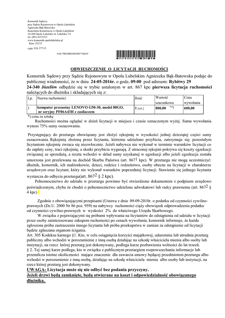 Komornik Sądowy przy Sądzie Rejonowym w Opolu Lubelskim Agnieszka Bąk-Batowska Kancelaria Komornicza w Opolu Lubelskim 24-300 Opole Lubelskie ul. Lubelska 7/4 tel. (081) 8272315 www.komornik-opolelubelskie.pl Kms 152/15 sygn. II K 277/15 #AS *0010001083091*/0419/ *0010001083091* OBWIESZCZENIE O LICYTACJI RUCHOMOŚCI Komornik Sądowy przy Sądzie Rejonowym w Opolu Lubelskim Agnieszka Bąk-Batowska podaje do publicznej wiadomości, że w dniu 24-05-2016r. o godz. 09:00 pod adresem: Rybitwy 29 24-340 Józefów odbędzie się w trybie ustalonym w art. 867 kpc pierwsza licytacja ruchomości należących do dłużnika i składających się z: Lp. Nazwa ruchomości komputer przenośny LENOVO G50-30, model 80GO, nr seryjny PF06A43H z zasilaczem *) cena za sztukę 1 Ilość 1 [szt.] Wartość szacunkowa 800,00 **) Cena wywołania 600,00 Ruchomości można oglądać w dzień licytacji w miejscu i czasie oznaczonym wyżej. Suma wywołania wynosi 75% sumy oszacowania. Przystępujący do przetargu obowiązany jest złożyć rękojmię w wysokości jednej dziesiątej części sumy oszacowania. Rękojmię złożoną przez licytanta, któremu udzielono przybicia, zatrzymuje się; pozostałym licytantom rękojmię zwraca się niezwłocznie. Jeżeli nabywca nie wykonał w terminie warunków licytacji co do zapłaty ceny, traci rękojmię, a skutki przybicia wygasają. Z utraconej rękojmi pokrywa się koszty egzekucji związanej ze sprzedażą, a reszta wchodzi w skład sumy uzyskanej w egzekucji albo jeżeli egzekucja została umorzona jest przelewana na dochód Skarbu Państwa (art. 8671 kpc). W przetargu nie mogą uczestniczyć: dłużnik, komornik, ich małżonkowie, dzieci, rodzice i rodzeństwo, osoby obecne na licytacji w charakterze urzędowym oraz licytant, który nie wykonał warunków poprzedniej licytacji. Stawienie się jednego licytanta wystarcza do odbycia przetargu(art. 8672 § 2 kpc). Pełnomocnictwo do udziału w przetargu powinno być stwierdzone dokumentem z podpisem urzędowo poświadczonym, chyba że chodzi o pełnomocnictwo udzielone adwokatowi lub radcy prawnemu (art. 8672 § 4 kpc) Zgodnie z obowiązującymi przepisami (Ustawa z dnia 09-09-2010r. o podatku od czynności cywilnoprawnych (Dz.U. 2000 Nr 86 poz. 959) na nabywcy ruchomości ciąży obowiązek odprowadzenia podatku od czynności cywilno-prawnych w wyskości 2% do właściwego Urzędu Skarbowego. W związku z pojawiającymi się próbami wpływania na licytantów do odstąpienia od udziału w licytacji przez osoby zainteresowane zakupem ruchomości po cenach wywołania, komornik informuje, że każda zgłoszona próba zastraszenia innego licytanta lub próba przekupstwa w zamian za odstąpienie od licytacji będzie zgłaszana organom ścigania. Art. 305 Kodeksu karnego §1. Kto, w celu osiągnięcia korzyści majątkowej, udaremnia lub utrudnia przetarg publiczny albo wchodzi w porozumienie z inną osobą działając na szkodę właściciela mienia albo osoby lub instytucji, na rzecz której przetarg jest dokonywany, podlega karze pozbawienia wolności do lat trzech. § 2. Tej samej karze podlega, kto w związku z publicznym przetargiem rozpowszechania informacje lub przemilcza istotne okoliczności mające znaczenie dla zawarcia umowy będącej przedmiotem przetargu albo wchodzi w porozumienie z inną osobą, działając na szkodę właściciela mienia albo osoby lub instytucji, na rzecz której przetarg jest dokonywany. UWAGA: Licytacja może się nie odbyć bez podania przyczyny. Jeżeli drzwi będą zamknięte, będą otwierane na koszt i odpowiedzialność obowiązanego dłużnika.