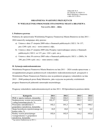 Załącznik Nr 4 do uchwały Nr XII/91/11 Rady Miejskiej w Braniewie z dnia 20.12.2011r. OBJAŚNIENIA WARTOŚCI PRZYJĘTYCH W WIELOLETNIEJ PROGNOZIE FINANSOWEJ MIASTA BRANIEWA NA LATA 2011 – 2024. I. Podstawa prawna Podstawę do opracowania Wieloletniej Prognozy Finansowej Miasta Braniewa na lata 2011 – 2024 stanowiły następujące akty prawne: a) Ustawa z dnia 27 sierpnia 2009 roku o finansach publicznych ( DZ.U. Nr 157, poz.1240 z póź. zm.) – nowa ustawa ( ufp), b) Ustawa z dnia 27 sierpnia 2009 roku Przepisy wprowadzające ustawę o finansach publicznych ( DZ.U. nr 157, poz. 1241 z póź. zm.), c) Ustawa z dnia 30 czerwca 2005 roku o finansach publicznych ( DZ.U. z 2005r, Nr 249, poz.2104 z póź. zm.) – stara ustawa ( sufp). II. Sytuacja makroekonomiczna Wieloletnia Prognoza Finansowa Miasta Braniewa na lata 2011 – 2024 została opracowana z uwzględnieniem prognoz podstawowych wskaźników makroekonomicznych przyjętych w Wieloletnim Planie Finansowym Państwa oraz na podstawie prognozy wskaźników na lata 2015 – 2040 podanych przez Radę Ministrów, jako wytyczne na potrzeby wieloletnich prognoz finansowych jednostek samorządu terytorialnego. Prognozę wskaźników makroekonomicznych na lata 2011- 2014przedstawia poniższa tabela: Kategoria PKB w ujęciu realnym, dynamika Średnioroczny wzrost cen towarów i usług konsumpcyjnych, % Przeciętne zatrudnienie w gospodarce narodowej, dynamika Stopa bezrobocia rejestrowanego na koniec roku, % Realny wzrost przeciętnego wynagrodzenia w gospodarce narodowej, dynamika 2011 104,0 102,3* 2012 104,0 102,8 2013 103,7 102,5 2014 103,9 102,5 102,2 101,3 100,7 100,5 10,9 10,0 9,3 8,5 102,6 102,9 103,2 103,6 *wg ustawy budżetowej na 2011 r. 1 Prognoza wskaźników na lata 2015 – 2040: Wyszczególnienie PKB, dynamika realna średnio w okresie CPI*- dynamika średnioroczna Jednostka % 2015-2020 103,4 20121-2030 103,0 2031-2040 102,7 102,5 102,3 102,1 % *Wskaźnik zmiany kosztów utrzymania ( inflacja) III. Uwagi ogólne Wieloletnia Prognoza Finansowa Miasta Braniewa została opracowana na lata 2011 – 2024. Długość okresu objętego prognozą wynika z art. 227 ust.2 ustawy z dnia 27 sierpnia 2009 roku o finansach publicznych. Z brzmienia przepisu wynika , ze prognozę należy sporządzić na czas nie krótszy niż okres na jaki przyjęto limity wydatków dla przedsięwzięć , o których mowa w art.226 ust.3. Wykaz przedsięwzięć miasta Braniewa obejmuje natomiast okres roku budżetowego oraz sześć kolejnych lat, tj. lata 2012 – 2018 zgodnie z art. 227 ufp. Wieloletnia Prognoza Finansowa Miasta Braniewa została opracowana do 2024 roku, czyli do momentu całkowitej spłaty zaciągniętych i planowanych do zaciągnięcia zobowiązań z tytułu kredytów, pożyczek i emisji obligacji. IV. Prognoza dochodów Do określenia wielkości dochodów budżetu miasta przyjęto założenie, iż dochody bieżące będą rosły średnio na poziomie 3,0 % w stosunku rocznym. W zakresie dochodów majątkowych wykazano od roku 2013 jedynie dochody ze sprzedaży majątku komunalnego. Na dzień sporządzenia prognozy nie przewiduje się otrzymywania dotacji majątkowych. Na kolejne lata przyjęto wielkości sprzedaży majątku na podstawie danych uzyskanych z Wydziału Mienia komunalnego UM. W kolejnych latach planuje się sprzedaż corocznie kilku- kilkudziesięciu mieszkań, sprzedaż lokali użytkowych posiadanych przez miasto, I opłaty za przekazywanie gruntów w użytkowanie wieczyste pod garażami, wpływy z rat za sprzedaż mieszkań oraz działek gruntowych w latach wcześniejszych, sprzedaż działek pod zabudowę usługową. 2 V. Prognoza wydatków Wydatki bieżące zostały zaplanowane przy corocznym 2,0 % wzroście. Środki na wynagrodzenia i składki od nich naliczane zaplanowano z uwzględnieniem corocznego 2,0 % wzrostu. Zaplanowano wzrost wynagrodzeń pracowników samorządowych w poszczególnych latach o 2,0 % chcąc utrzymać realna wielkość wynagrodzeń na stałym poziomie w związku z przyjętym wskaźnikiem inflacji. W roku 2012 zaplanowano wzrost wynagrodzeń o 3, 0 %ze względu, iż w 2011 nie miały miejsca podwyżki płac w administracji. Pozycja „Wydatki związane z funkcjonowaniem organów jednostek samorządu terytorialnego obejmuje wydatki planowane w rozdziale 75022 „Rady gmin” oraz w rozdziale 75023 „Urzędy gmin” przy założeniu również 2,0 % wzrostu ogółu wydatków ponoszonych na funkcjonowanie organów j.s.t. Wydatki na obsługę długu publicznego zaplanowano na podstawie harmonogramów spłat zaciągniętych kredytów i wyemitowanych obligacji komunalnych. W 2012 roku planuje się wyemitować obligacje komunalne na kwotę 1 280 000,00 zł w celu pokrycia zaplanowanego deficytu w budżecie miasta oraz na spłatę rat wcześniej zaciągniętych kredytów i wykup obligacji. Stosownie do wielkości utrzymującego się zadłużenia zaplanowano również środki na spłatę odsetek od kredytów i obligacji. VI. Wynik budżetu Wynik budżetu jest to różnica pomiędzy dochodami ogółem, a wydatkami ogółem. W 2012 roku został zaplanowany deficyt w wysokości 380 000,00 zł. Od roku 2013 prognoza zakłada budżet oparty na zasadzie , iż planowane dochody muszą pokryć planowane wydatki plus rozchody w postaci przypadających spłat rat kredytów i wykupu obligacji. VII. Przychody Wieloletnia Prognoza Finansowa zakłada przychody budżetu w 2012 roku w wysokości 1 280 000,00 zł jako wpływy z emisji dwóch serii obligacji komunalnych po 640 000,00 zł, których emisja była planowana w 2011, jednak nie nastąpi na fakt, iż nie wszystkie planowane inwestycje w 2011 roku zostaną zrealizowane. W kolejnych latach nie przewiduje się przychodów w postaci kredytów , ani wpływów z obligacji ze względu na możliwości budżetu miasta obwarowane wymogami art. 243 uofp., które zaczną obowiązywać od 2014 roku. 3 VIII. Rozchody Wieloletnia Prognoza Finansowa obejmuje rozchody związane 