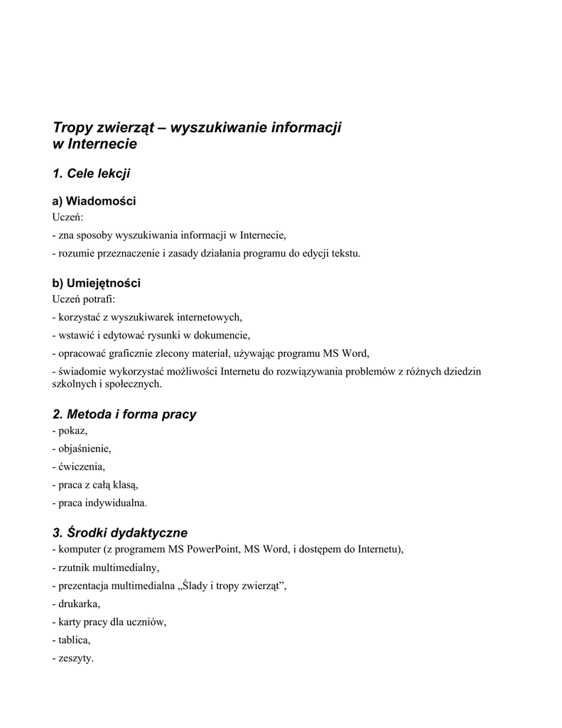 Tropy zwierząt – wyszukiwanie informacji w Internecie 1. Cele lekcji a) Wiadomości Uczeń: - zna sposoby wyszukiwania informacji w Internecie, - rozumie przeznaczenie i zasady działania programu do edycji tekstu. b) Umiejętności Uczeń potrafi: - korzystać z wyszukiwarek internetowych, - wstawić i edytować rysunki w dokumencie, - opracować graficznie zlecony materiał, używając programu MS Word, - świadomie wykorzystać możliwości Internetu do rozwiązywania problemów z różnych dziedzin szkolnych i społecznych. 2. Metoda i forma pracy - pokaz, - objaśnienie, - ćwiczenia, - praca z całą klasą, - praca indywidualna. 3. Środki dydaktyczne - komputer (z programem MS PowerPoint, MS Word, i dostępem do Internetu), - rzutnik multimedialny, - prezentacja multimedialna „Ślady i tropy zwierząt”, - drukarka, - karty pracy dla uczniów, - tablica, - zeszyty. 4. Przebieg lekcji a) Faza przygotowawcza 1. Nauczyciel wita uczniów, sprawdza listę obecności, prosi o zapisanie tematu lekcji w zeszytach. 2. Nauczyciel wyjaśnia cele lekcji i prosi uczniów o uruchomienie komputerów. b) Faza realizacyjna Nauczyciel uruchamia prezentację multimedialną pt. „Ślady i tropy zwierząt”. Prezentacja przedstawia zagadnienia dotyczące śladów i tropów zwierząt (notatki dla nauczyciela – załącznik b). Spis treści prezentacji: - Co to są tropy zwierząt? - Gdzie możemy spotkać ślady zwierząt? - Rodzaje tropów - Na co warto zwrócić uwagę szukając i rozpoznając ślady zwierząt? - Ślady i tropy zwierząt w przykładach - Kilka słów do Ciebie - Ćwiczenie 1 (załącznik a) - Ćwiczenie 2 (załącznik a) c) Faza podsumowująca Uczniowie przedstawiają rozwiązania swoich ćwiczeń. Jeżeli istnieje taka możliwość, można wydrukować opracowane ćwiczenia. 5. Bibliografia 1. M. Buchner, Śladami zwierząt. Przewodnik, Drzewo Babel, Warszawa 1996. 2. E. Dreyer, Las, Multico, Warszawa 2003. 3. W. Eisenreich, Przewodnik do rozpoznawania zwierząt i roślin, Delta, Warszawa 2004. 4. G. Ohnesorge, B. Scheiba, K. Uhlenhaut, Ślady i tropy zwierząt. Kieszonkowy atlas, Mulico, Warszawa 1997. 5. J. Romanowski, Śladami zwierząt, Państwowe Wydawnictwo Rolnicze i Leśne, Warszawa 1998. 6. http://www.przyrodapolska.pl/luty01/sladyprzy.html 6. Załączniki a) Karta pracy ucznia Ćwiczenie 1. Otwórz dokument o nazwie „tropy.doc”. W wolne miejsca tabeli wstaw odpowiednie obrazki. Ćwiczenie 2. Korzystając ze źródeł internetowych, odszukaj innych gatunków zwierząt oraz ich tropy. Wszystkie zebrane informacje opracuj w edytorze tekstu MS Word. b) Notatki dla nauczyciela Informacje zawarte w prezentacji „Ślady i tropy zwierząt” CO TO SĄ TROPY ZWIERZĄT? Tropy zwierząt to pozostawione przez zwierzęta odciski ich wewnętrznej strony stopy, składające się z np. pazurów palców, opuszek (nagich zgrubień skóry gruczołami zapachowymi), kopyt racic. GDZIE I KIEDY MOŻEMY SPOTKAĆ ŚLADY ZWIERZĄT? Pozostawione w zimie na śniegu lub odciśnięte na wilgotnym podłożu są jak odciski palców człowieka, po których można zidentyfikować nie tylko gatunek, ale także często konkretnego osobnika. RODZAJE TROPÓW Tropy mogą być najprzeróżniejsze. Niektóre zwierzęta (np. jeż, wiewiórka) odciskają całą stopę. Widoczny jest wtedy jednocześnie kształt długich palców z pazurkami, a także kształt opuszek na palcach i pięcie. U psowatych (pies, wilk, lis) widoczny jest wzór opuszek i pazurów, a u kotowatych (ryś, żbik) brak jest śladów pazurów, gdyż podczas kroczenia są schowane. NA CO WARTO ZWRÓCIĆ UWAGĘ, SZUKAJĄC I ROZPOZNAJĄC ŚLADY ZWIERZĄT Warto zwracać uwagę na układ tropów, gdyż dzięki temu możemy stwierdzić, z jaką prędkością poruszał się ich właściciel. ŚLADY I TROPY ZWIERZĄT W PRZYKŁADACH - Jeż Żywi się owadami, dżdżownicami, żabami, je także owoce i grzyby. Na żer wychodzi nocą i jest wtedy bardzo hałaśliwy. W obliczu niebezpieczeństwa nie ucieka, lecz zwija się w kulę i straszy kolcami. - Szczur Długość ciała 16–23 cm, długość ogona 18–25 cm, masa ciała 175–200 g. Pysk ostro zakończony, uszy duże, cienkie i prawie nagie. W miejscach, gdzie nie jest płoszony, wykazuje aktywność całodobową. Jest wszystkożerny i mało wybredny pod względem odżywiania. - Mysz domowa Duże uszy, długi ogon. Latem żeruje na polach uprawnych. Aktywna cała dobę. Je wszystko. Zostawia wąskie tropy: przednie 0,8 cm, tylne 1,7 cm. Widać także ślad ogona. - Wiewiórka Żyje w lasach, parkach, najzręczniejszy drzewołaz. Ma długi puszysty ogon. Żywi się nasionami, owocami, grzybami i owadami. Aktywna cały dzień. - Zając Dobrze zamaskowany, bytuje w polach, łąkach. Żeruje w nocy. Je rośliny zielone, korę drzew liściastych. Odległość między tropami 120 cm. Przy szybkiej ucieczce nawet 3 m. - Lis Lis żyje zarówno w lesie, jak i w polu. Lis jest mięsożerny. Główne jego pożywienie stanowią myszy, ale zjada także żaby, jaszczurki, ryby, raki, ptaki, jaja ptasie, króliki, zające. - Jeleń Występuje w stadach liczących po kilkanaście sztuk, głównie na terenach leśnych, a także w górach, na obszarach lasów reglowych. Pożywienie stanowią rośliny zielne, trawa, liście, kora i gałęzie drzew i krzewów, owoce i jagody. Często żeruje na polach uprawnych położonych na terenach leśnych. - Dzik Zwierzę stadne, żyjące w grupach rodzinnych nazywanych watahami. W skład gromady wchodzi stara locha-przewodniczka oraz lochy z warchlakami (młode do osiągnięcia dojrzałości płciowej). Pozostałe osobniki są słabiej związane ze stadem. Odyńce rzadko wiążą się z grupą. Dziki w ciągu dnia odpoczywają w barłogach lub tarzają się w błocie. Wieczorem osobniki wyruszają na żer i pod osłoną nocy wychodzą z lasu na pola. Mogą być szkodnikiem upraw. KILKA SŁÓW DO CIEBIE… Jeżeli chcemy podążyć tropami zwierząt, musimy uzbroić