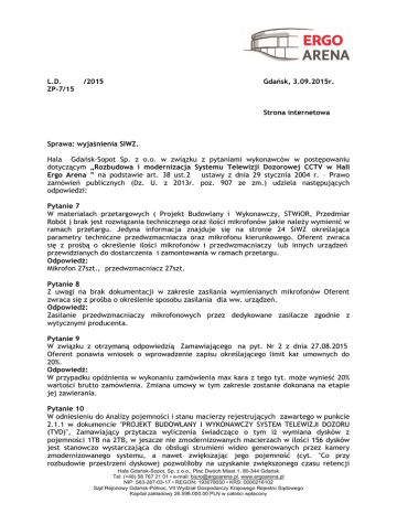 L.D. ZP-7/15 /2015 Gdańsk, 3.09.2015r. Strona internetowa Sprawa: wyjaśnienia SIWZ. Hala Gdańsk-Sopot Sp. z o.o. w związku z pytaniami wykonawców w postępowaniu dotyczącym „Rozbudowa i modernizacja Systemu Telewizji Dozorowej CCTV w Hali Ergo Arena ” na podstawie art. 38 ust.2 ustawy z dnia 29 stycznia 2004 r. – Prawo zamówień publicznych (Dz. U. z 2013r. poz. 907 ze zm.) udziela następujących odpowiedzi: Pytanie 7 W materiałach przetargowych ( Projekt Budowlany i Wykonawczy, STWiOR, Przedmiar Robót ) brak jest rozwiązania technicznego oraz ilości mikrofonów jakie należy wymienić w ramach przetargu. Jedyna informacja znajduje się na stronie 24 SiWZ określająca parametry techniczne przedwzmacniacza oraz mikrofonu kierunkowego. Oferent zwraca się z prośbą o określenie ilości mikrofonów i przedwzmacniaczy lub innych urządzeń przewidzianych do dostarczenia i zamontowania w ramach przetargu. Odpowiedź: Mikrofon 27szt., przedwzmacniacz 27szt. Pytanie 8 Z uwagi na brak dokumentacji w zakresie zasilania wymienianych mikrofonów Oferent zwraca się z prośba o określenie sposobu zasilania dla ww. urządzeń. Odpowiedź: Zasilanie przedwzmacniaczy mikrofonowych przez dedykowane zasilacze zgodnie z wytycznymi producenta. Pytanie 9 W związku z otrzymaną odpowiedzią Zamawiającego na pyt. Nr 2 z dnia 27.08.2015 Oferent ponawia wniosek o wprowadzenie zapisu określającego limit kar umownych do 20%. Odpowiedź: W przypadku opóźnienia w wykonaniu zamówienia max kara z tego tyt. może wynieść 20% wartości brutto zamówienia. Zmiana umowy w tym zakresie zostanie dokonana na etapie jej zawierania. Pytanie 10 W odniesieniu do Analizy pojemności i stanu macierzy rejestrujących zawartego w punkcie 2.1.1 w dokumencie "PROJEKT BUDOWLANY I WYKONAWCZY SYSTEM TELEWIZJI DOZORU (TVD)", Zamawiający przytacza wyliczenia świadczące o tym iż wymiana dysków z pojemności 1TB na 2TB, w jeszcze nie zmodernizowanych macierzach w ilości 156 dysków jest stanowczo wystarczająca do obsługi strumieni wideo generowanych przez kamery zmodernizowanego systemu, a nawet zwiększając jego pojemność (cyt. "Co przy rozbudowie przestrzeni dyskowej pozwoliłoby na uzyskanie zwiększonego czasu retencji Hala Gdańsk-Sopot, Sp. z o.o., Plac Dwóch Miast 1, 80-344 Gdańsk Tel: (+48) 58 767 21 01 • e-mail: [email protected], www.ergoarena.pl NIP: 583-287-03-17 • REGON: 193078050 • KRS: 0000216102 Sąd Rejonowy Gdańsk-Północ, VII Wydział Gospodarczy Krajowego Rejestru Sądowego Kapitał zakładowy 26.596.000,00 PLN w całości wpłacony nagrań tj. około 30,31 dnia ciągłego nagrywania z każdej kamery po rozbudowie." oraz "W obecnej konfiguracji dzięki tej przestrzeni możliwe jest przetrzymywanie ok. 25,54 dnia ciągłego nagrania z każdej kamery."). Stąd jako potencjalny Wykonawca w odniesieniu do punktu 22.d3 "Dostawa i montaż rejestratora - Endura 12TB - NSM5200-12-EUK" z przedmiaru robót sugerujemy usunięcie zapisu odnośnie potrzeby dostarczenia dwóch kolejnych rejestratorów, które są tylko niepotrzebnym kosztem dla Zamawiającego biorąc pod uwagę iż pojemność systemu jest wystarczająca także z naszymi wyliczeniami jako potencjalnego Wykonawcy. Ponadto model urządzenia NSM5200-12-EUK jest macierzą z dyskami 1TB co byłoby nie logiczne przy montażu dysków 2TB i narażało by Zamawiającego na kolejne koszty związane z wymianą dodatkowych dysków. Odpowiedź: Zamawiający zgada się pod warunkiem zagwarantowania wymaganych w projekcie wykonawczym parametrów dotyczących przepływności i czasu przechowywania zarejestrowanego materiału zgodnie z obowiązującym rozporządzeniem MSWiA w sprawie sposobu utrwalania przebiegu imprezy masowej. Pytanie 11 W odniesieniu do zapisów zawartych w dokumencie "SPECYFIKACJA TECHNICZNA WYKONANIA I ODBIORU ROBÓT TELETECHNICZNYCH - PRZEBUDOWA SYSTEMU TVD ERGO ARENA" Zamawiający wymaga dostarczenia dysków do macierzy NSM o pojemności min. 3TB (pkt 2.5.6 "Dysk twardy HDD - min. 3TB pojemności"). Jednakże w projekcie budowlanym i wykonawczym będącym wyznacznikiem wymagań Zamawiający w punkcie 2.1.1 Rejestratory cyfrowe obrazu z kamer TVD – rejestratory NSM Analizuje pojemność macierzy pod kątem dysków o pojemności 2TB i takowe zaleca. Stad jako potencjalny Wykonawca zwracamy się z prośbą o sprecyzowania czy wymagane są dyski 2TB a wymagania na 3TB to błąd literowy/pisarski, podkreślając jednocześnie iż zgodnie z naszą wiedzą wymagane dyski o pojemności 3TB nie będą wspierane przez obecnie posiadane przez Zamawiającego macierze NSM-5200 ze względu na rodzaj i oprogramowanie kontrolera RAID tych macierzy. Odpowiedź: Wymagane są dyski o pojemności 2TB, podana wartość 3TB należy traktować jako pomyłkę pisarską. Powyższe należy uwzględnić przygotowując ofertę. Hala Gdańsk-Sopot, Sp. z o.o., Plac Dwóch Miast 1, 80-344 Gdańsk Tel: (+48) 58 767 21 01 • e-mail: [email protected], www.ergoarena.pl NIP: 583-287-03-17 • REGON: 193078050 • KRS: 0000216102 Sąd Rejonowy Gdańsk-Północ, VII Wydział Gospodarczy Krajowego Rejestru Sądowego Kapitał zakładowy 26.596.000,00 PLN w całości wpłacony