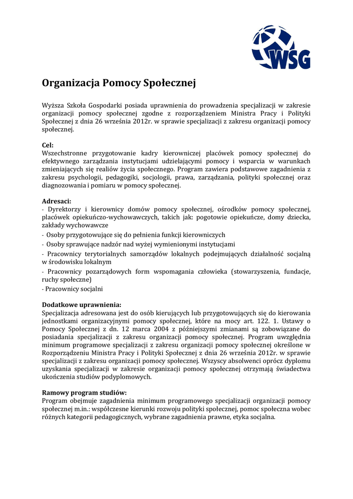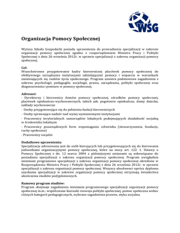 Organizacja Pomocy Społecznej Wyższa Szkoła Gospodarki posiada uprawnienia do prowadzenia specjalizacji w zakresie organizacji pomocy społecznej zgodne z rozporządzeniem Ministra Pracy i Polityki Społecznej z dnia 26 września 2012r. w sprawie specjalizacji z zakresu organizacji pomocy społecznej. Cel: Wszechstronne przygotowanie kadry kierowniczej placówek pomocy społecznej do efektywnego zarządzania instytucjami udzielającymi pomocy i wsparcia w warunkach zmieniających się realiów życia społecznego. Program zawiera podstawowe zagadnienia z zakresu psychologii, pedagogiki, socjologii, prawa, zarządzania, polityki społecznej oraz diagnozowania i pomiaru w pomocy społecznej. Adresaci: - Dyrektorzy i kierownicy domów pomocy społecznej, ośrodków pomocy społecznej, placówek opiekuńczo-wychowawczych, takich jak: pogotowie opiekuńcze, domy dziecka, zakłady wychowawcze - Osoby przygotowujące się do pełnienia funkcji kierowniczych - Osoby sprawujące nadzór nad wyżej wymienionymi instytucjami - Pracownicy terytorialnych samorządów lokalnych podejmujących działalność socjalną w środowisku lokalnym - Pracownicy pozarządowych form wspomagania człowieka (stowarzyszenia, fundacje, ruchy społeczne) - Pracownicy socjalni Dodatkowe uprawnienia: Specjalizacja adresowana jest do osób kierujących lub przygotowujących się do kierowania jednostkami organizacyjnymi pomocy społecznej, które na mocy art. 122. 1. Ustawy o Pomocy Społecznej z dn. 12 marca 2004 z późniejszymi zmianami są zobowiązane do posiadania specjalizacji z zakresu organizacji pomocy społecznej. Program uwzględnia minimum programowe specjalizacji z zakresu organizacji pomocy społecznej określone w Rozporządzeniu Ministra Pracy i Polityki Społecznej z dnia 26 września 2012r. w sprawie specjalizacji z zakresu organizacji pomocy społecznej. Wszyscy absolwenci oprócz dyplomu uzyskania specjalizacji w zakresie organizacji pomocy społecznej otrzymają świadectwa ukończenia studiów podyplomowych. Ramowy program studiów: Program obejmuje zagadnienia minimum programowego specjalizacji organizacji pomocy społecznej m.in.: współczesne kierunki rozwoju polityki społecznej, pomoc społeczna wobec różnych kategorii pedagogicznych, wybrane zagadnienia prawne, etyka socjalna. - Współczesne kierunki rozwoju polityki społecznej w ujęciu globalnym, europejskim i lokalnym - Elementy organizacji i zarządzania w pomocy społecznej - Elementy etyki - Zadania jednostek organizacyjnych pomocy społecznej: gminy, powiatu i województwa - Ewaluacja działań, metody i techniki badań wykorzystywanych w pomocy społecznej - Wybrane zagadnienia prawne, ze szczególnym uwzględnieniem prawa administracyjnego, prawa pracy, prawa zamówień publicznych, prawa rodzinnego i prawa dotyczącego ochrony danych osobowych - Wybrane zagadnienia z zakresu przepisów dotyczących pomocy społecznej i zabezpieczenia społecznego - Publiczne relacje, reklama społeczna i promocja działań w pomocy społecznej – public relations - Mediacje i negocjacje w pomocy społecznej Stres i wypalenie zawodowe - Konsultacje dotyczące pracy dyplomowej wymaganej do uzyskania specjalizacji - Wizyty studyjne – hospitacje instytucji działających w obszarze pomocy społecznej Forma zaliczenia: - Egzamin końcowy - Praca dyplomowa Liczba godzin: 265 Czas trwania: 2 semestry Kierunek studiów podyplomowych Organizacja Pomocy Społecznej - Opłata jednorazowa 1 rata 3 400 zł Wysokość jednej raty w systemie 2-ratalnym 1 700 zł