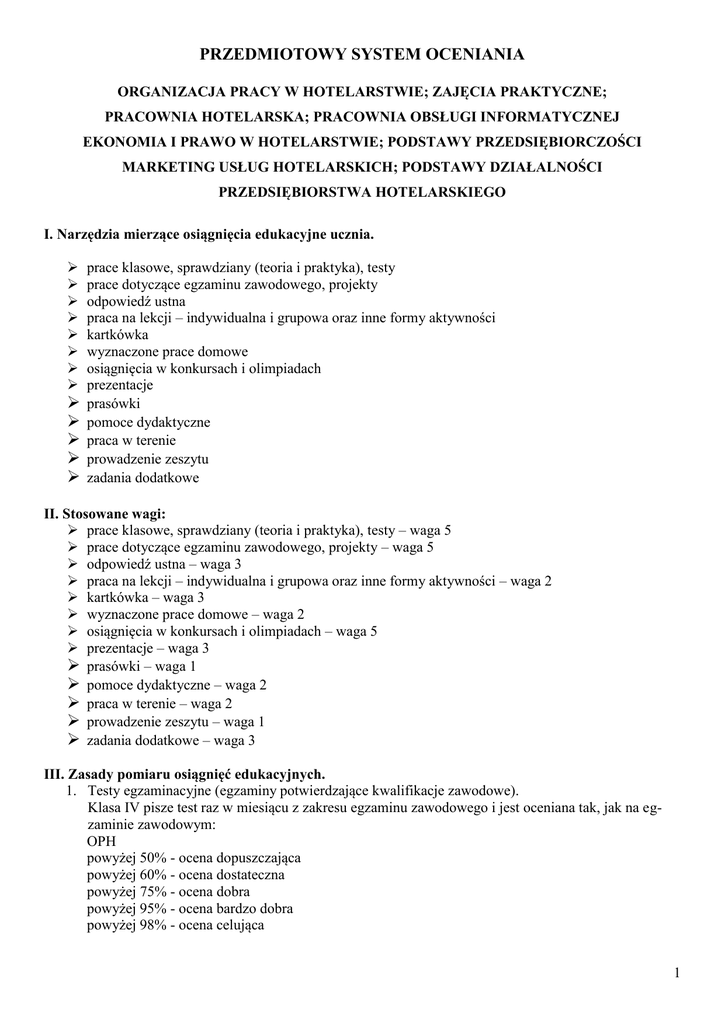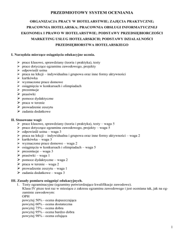 PRZEDMIOTOWY SYSTEM OCENIANIA ORGANIZACJA PRACY W HOTELARSTWIE; ZAJĘCIA PRAKTYCZNE; PRACOWNIA HOTELARSKA; PRACOWNIA OBSŁUGI INFORMATYCZNEJ EKONOMIA I PRAWO W HOTELARSTWIE; PODSTAWY PRZEDSIĘBIORCZOŚCI MARKETING USŁUG HOTELARSKICH; PODSTAWY DZIAŁALNOŚCI PRZEDSIĘBIORSTWA HOTELARSKIEGO I. Narzędzia mierzące osiągnięcia edukacyjne ucznia. prace klasowe, sprawdziany (teoria i praktyka), testy prace dotyczące egzaminu zawodowego, projekty odpowiedź ustna praca na lekcji – indywidualna i grupowa oraz inne formy aktywności kartkówka wyznaczone prace domowe osiągnięcia w konkursach i olimpiadach prezentacje prasówki pomoce dydaktyczne praca w terenie prowadzenie zeszytu zadania dodatkowe II. Stosowane wagi: prace klasowe, sprawdziany (teoria i praktyka), testy – waga 5 prace dotyczące egzaminu zawodowego, projekty – waga 5 odpowiedź ustna – waga 3 praca na lekcji – indywidualna i grupowa oraz inne formy aktywności – waga 2 kartkówka – waga 3 wyznaczone prace domowe – waga 2 osiągnięcia w konkursach i olimpiadach – waga 5 prezentacje – waga 3 prasówki – waga 1 pomoce dydaktyczne – waga 2 praca w terenie – waga 2 prowadzenie zeszytu – waga 1 zadania dodatkowe – waga 3 III. Zasady pomiaru osiągnięć edukacyjnych. 1. Testy egzaminacyjne (egzaminy potwierdzające kwalifikacje zawodowe). Klasa IV pisze test raz w miesiącu z zakresu egzaminu zawodowego i jest oceniana tak, jak na egzaminie zawodowym: OPH powyżej 50% - ocena dopuszczająca powyżej 60% - ocena dostateczna powyżej 75% - ocena dobra powyżej 95% - ocena bardzo dobra powyżej 98% - ocena celująca 1 2. Projekty. Mają na celu przygotowanie do egzaminu praktycznego dla zawodu technik hotelarstwa, który przeprowadzany jest przez Centralną Komisję Egzaminacyjną w formie pisemnej. Uczeń który nie zaliczy pozytywnie 50% projektów, nie będzie dopuszczony do egzaminu zawodowego. Nie ma możliwości poprawy projektów. Przy ocenianiu projektów brane są pod uwagę: Ujęcie tematu. Umiejętności poszukiwania potrzebnej wiedzy w różnych źródłach. Samodzielność pracy. Poprawność merytoryczna. Poprawność terminologiczna. Układ logiczny pracy. Struktura przedstawienia tematu. Estetyka wykonania. Poziom pracy. Projekty rozwiązywane są na lekcji. Za brak projektu wystawiana jest ocena niedostateczna. Nauczyciel sprawdza projekt wystawiając ocenę (uwagi może nanosić na pracy bądź przekazywać uczniom ustnie podczas oddawania sprawdzonych prac, na forum klasy bądź bezpośrednio uczniowi) Kryteria oceniania projektów: % możliwych do uzyskania punktów 0% -74% - niedostateczny 75% - 81% - dopuszczający 82% - 90% - dostateczny 91% - 95% - dobry 96% - 97% - bardzo dobry 98-100% - celujący 3. Praca na zajęciach w terenie - ocenie podlegają umiejętności takie jak: sporządzanie notatek, gromadzenie i selekcjonowanie, statystyczne opracowanie zebranych informacji, wnioskowanie, estetyka opracowań, przekazywanie informacji, poprawność językowa. 4. Uczeń ma obowiązek prowadzenie zeszytu, w którym umieszcza notatki oraz prace domowe. Uczeń, który zapomniał zeszytu, nie prowadzi notatek otrzymuje ocenę niedostateczną. Uczeń może oczekiwać sprawdzenia wiedzy w formie odpowiedzi ustnej z brakujących notatek. 5. Wszystkie prace pisemne sprawdzane są według znanych uczniowi kryteriów. Uczeń ma prawo do jawnej i uzasadnionej oceny oraz znajomości kryteriów oceniania. 6. Prace klasowe, sprawdziany, projekty lub testy są zapowiadane z minimum tygodniowym wyprzedzeniem i są obowiązkowe. 7. Czas poprawiania i oceniania prac przez nauczyciela jest zgodny z odpowiednim zapisem w WSO (do 2 tygodni). 8. Uczeń ma obowiązek poprawienia oceny niedostatecznej z pracy klasowej, sprawdzianu, testu w ciągu 2 tygodni od dnia oddania sprawdzonych prac, w przeciwnym wypadku otrzymuje ocenę niedostateczną. 9. W przypadku stwierdzenia niesamodzielnej pracy podczas sprawdzianów pisemnych nauczyciel odbiera pracę i uczeń otrzymuje ocenę niedostateczną bez możliwości poprawy. 10. Każdy uczeń, który jest nieobecny podczas sprawdzianu ma obowiązek zgłosić się na kolejnej lekcji do nauczyciela i napisać sprawdzian na tej lekcji lub (w szczególnych przypadkach) w terminie wyznaczonym przez nauczyciela. Nie zgłoszenie się po opuszczonym sprawdzianie lub nie stawienie się w wyznaczonym przez nauczyciela terminie jest równoznaczne z otrzymaniem oceny niedostatecz2 11. 12. 13. 14. 15. 16. 17. 18. nej. W przypadku nieobecności trwającej tydzień i dłużej – uczeń uzgadnia z nauczycielem termin sprawdzianu. Każdego ucznia obowiązuje: przygotowanie się do każdej lekcji. Uczeń ma prawo do zgłoszenia jednego nie przygotowania się do zajęć w trymestrze (nie obowiązuje, jeżeli jest to jedna godzina w tygodniu). Za przeszkadzanie na lekcji nauczyciel ma prawo zadać dodatkową pracę lub sprawdzić wiedzę z bieżącego materiału w postaci odpowiedzi ustnej lub pisemnej. Każdego ucznia obowiązuje oddawanie do sprawdzenia prac pisemnych w wyznaczonym terminie. Za każde nie przygotowanie zadania uczeń otrzymuje ocenę niedostateczną. W przypadku zajęć dotyczących obsługi informatycznej uczeń jest zobowiązany dostarczyć prace wykonane w trakcie lekcji na nośniku i w terminie wskazanym przez nauczyciela. W przypadku dostarczenia prac poprzez pocztę elektroniczną, uczeń jest zobowiązany do dostarczenia pracy w określonym terminie oraz zachowania kopii wysłanej wiadomości na swoim koncie pocztowym. Nie dostarczenie pracy wykonywanej na lekcji w ustalonym terminie i w określonej formie skutkuje oceną niedostateczną. Za brak pracy domowej uczeń otrzymuje ocenę niedostateczną. Za brak mundurka uczniowie otrzymują ocenę niedostateczną (zajęcia praktyczne) oraz uwagę do dziennika (wszystkie zajęcia). Aktywność i zaangażowanie bądź niezaangażowanie na lekcji będzie oceniane „+” lub „-”. Za każde 5 „+” ucze