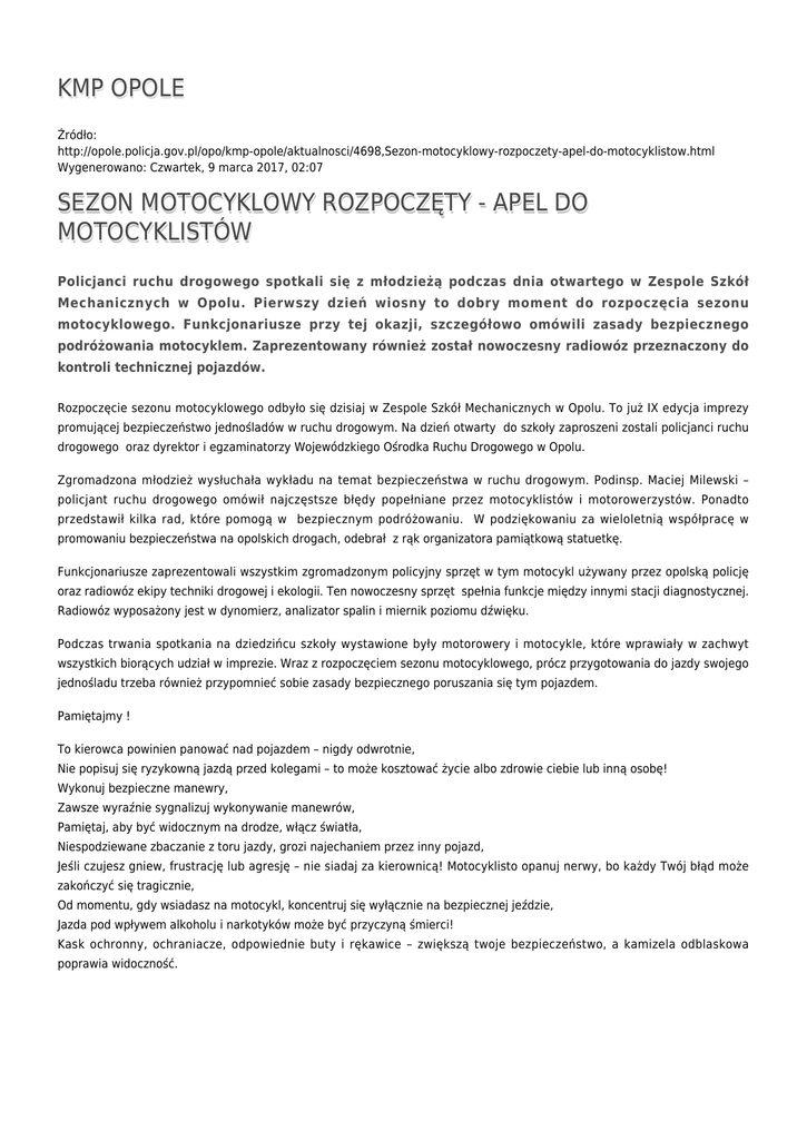 KMP OPOLE Źródło: http://opole.policja.gov.pl/opo/kmp-opole/aktualnosci/4698,Sezon-motocyklowy-rozpoczety-apel-do-motocyklistow.html Wygenerowano: Czwartek, 9 marca 2017, 02:07 SEZON MOTOCYKLOWY ROZPOCZĘTY - APEL DO MOTOCYKLISTÓW Policjanci ruchu drogowego spotkali się z młodzieżą podczas dnia otwartego w Zespole Szkół Mechanicznych w Opolu. Pierwszy dzień wiosny to dobry moment do rozpoczęcia sezonu motocyklowego. Funkcjonariusze przy tej okazji, szczegółowo omówili zasady bezpiecznego podróżowania motocyklem. Zaprezentowany również został nowoczesny radiowóz przeznaczony do kontroli technicznej pojazdów. Rozpoczęcie sezonu motocyklowego odbyło się dzisiaj w Zespole Szkół Mechanicznych w Opolu. To już IX edycja imprezy promującej bezpieczeństwo jednośladów w ruchu drogowym. Na dzień otwarty do szkoły zaproszeni zostali policjanci ruchu drogowego oraz dyrektor i egzaminatorzy Wojewódzkiego Ośrodka Ruchu Drogowego w Opolu. Zgromadzona młodzież wysłuchała wykładu na temat bezpieczeństwa w ruchu drogowym. Podinsp. Maciej Milewski – policjant ruchu drogowego omówił najczęstsze błędy popełniane przez motocyklistów i motorowerzystów. Ponadto przedstawił kilka rad, które pomogą w bezpiecznym podróżowaniu. W podziękowaniu za wieloletnią współpracę w promowaniu bezpieczeństwa na opolskich drogach, odebrał z rąk organizatora pamiątkową statuetkę. Funkcjonariusze zaprezentowali wszystkim zgromadzonym policyjny sprzęt w tym motocykl używany przez opolską policję oraz radiowóz ekipy techniki drogowej i ekologii. Ten nowoczesny sprzęt spełnia funkcje między innymi stacji diagnostycznej. Radiowóz wyposażony jest w dynomierz, analizator spalin i miernik poziomu dźwięku. Podczas trwania spotkania na dziedzińcu szkoły wystawione były motorowery i motocykle, które wprawiały w zachwyt wszystkich biorących udział w imprezie. Wraz z rozpoczęciem sezonu motocyklowego, prócz przygotowania do jazdy swojego jednośladu trzeba również przypomnieć sobie zasady bezpiecznego poruszania się tym pojazdem. Pamiętajmy ! To kierowca powinien panować nad pojazdem – nigdy odwrotnie, Nie popisuj się ryzykowną jazdą przed kolegami – to może kosztować życie albo zdrowie ciebie lub inną osobę! Wykonuj bezpieczne manewry, Zawsze wyraźnie sygnalizuj wykonywanie manewrów, Pamiętaj, aby być widocznym na drodze, włącz światła, Niespodziewane zbaczanie z toru jazdy, grozi najechaniem przez inny pojazd, Jeśli czujesz gniew, frustrację lub agresję – nie siadaj za kierownicą! Motocyklisto opanuj nerwy, bo każdy Twój błąd może zakończyć się tragicznie, Od momentu, gdy wsiadasz na motocykl, koncentruj się wyłącznie na bezpiecznej jeździe, Jazda pod wpływem alkoholu i narkotyków może być przyczyną śmierci! Kask ochronny, ochraniacze, odpowiednie buty i rękawice – zwiększą twoje bezpieczeństwo, a kamizela odblaskowa poprawia widoczność. Ocena: 0/5 (0) Tweetnij rozpoczęcie sezonu motocyklowego