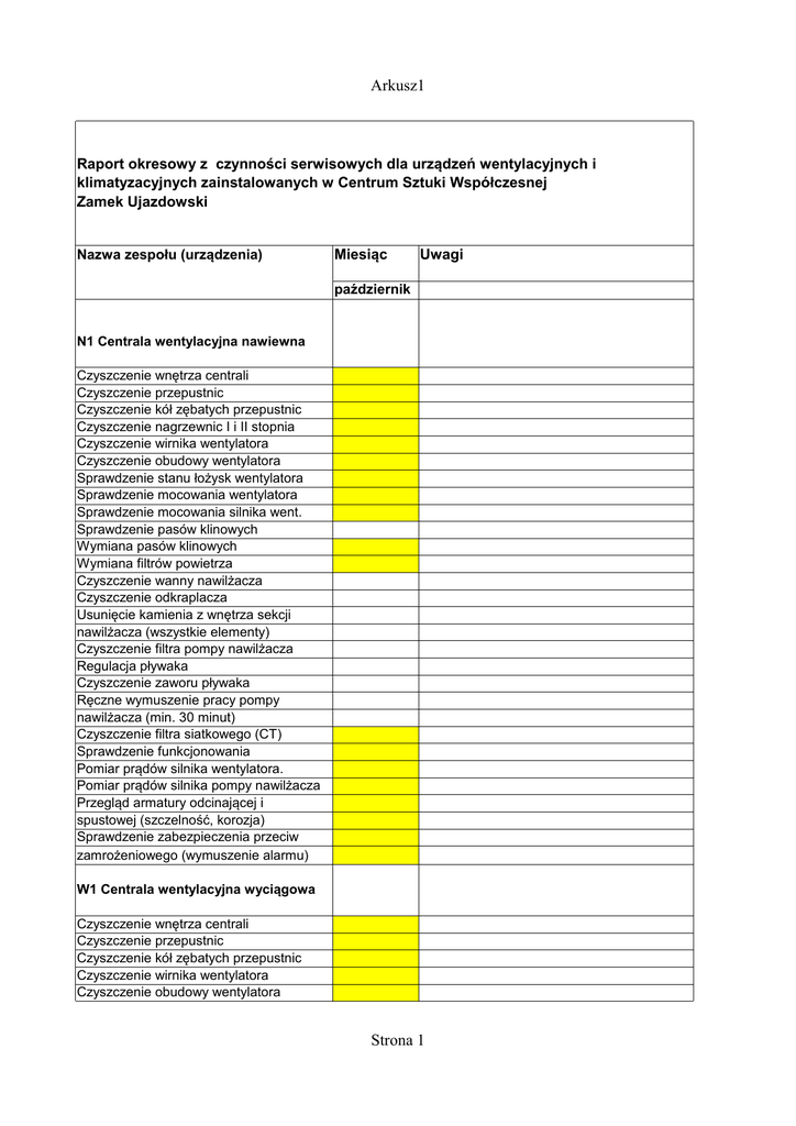 Arkusz1 Raport okresowy z czynności serwisowych dla urządzeń wentylacyjnych i klimatyzacyjnych zainstalowanych w Centrum Sztuki Współczesnej Zamek Ujazdowski Nazwa zespołu (urządzenia) Miesiąc Uwagi październik N1 Centrala wentylacyjna nawiewna Czyszczenie wnętrza centrali Czyszczenie przepustnic Czyszczenie kół zębatych przepustnic Czyszczenie nagrzewnic I i II stopnia Czyszczenie wirnika wentylatora Czyszczenie obudowy wentylatora Sprawdzenie stanu łożysk wentylatora Sprawdzenie mocowania wentylatora Sprawdzenie mocowania silnika went. Sprawdzenie pasów klinowych Wymiana pasów klinowych Wymiana filtrów powietrza Czyszczenie wanny nawilżacza Czyszczenie odkraplacza Usunięcie kamienia z wnętrza sekcji nawilżacza (wszystkie elementy) Czyszczenie filtra pompy nawilżacza Regulacja pływaka Czyszczenie zaworu pływaka Ręczne wymuszenie pracy pompy nawilżacza (min. 30 minut) Czyszczenie filtra siatkowego (CT) Sprawdzenie funkcjonowania Pomiar prądów silnika wentylatora. Pomiar prądów silnika pompy nawilżacza Przegląd armatury odcinającej i spustowej (szczelność, korozja) Sprawdzenie zabezpieczenia przeciw zamrożeniowego (wymuszenie alarmu) W1 Centrala wentylacyjna wyciągowa Czyszczenie wnętrza centrali Czyszczenie przepustnic Czyszczenie kół zębatych przepustnic Czyszczenie wirnika wentylatora Czyszczenie obudowy wentylatora Strona 1 Arkusz1 Sprawdzenie stanu łożysk wentylatora Sprawdzenie mocowania wentylatora Sprawdzenie mocowania silnika went. Sprawdzenie pasów klinowych Wymiana pasów klinowych Sprawdzenie funkcjonowania Pomiar prądów silnika wentylatora. N2 Centrala wentylacyjna nawiewna Czyszczenie wnętrza centrali Czyszczenie przepustnic Czyszczenie kół zębatych przepustnic Czyszczenie nagrzewnic I i II stopnia Czyszczenie wirnika wentylatora Czyszczenie obudowy wentylatora Sprawdzenie stanu łożysk wentylatora Sprawdzenie mocowania wentylatora Sprawdzenie mocowania silnika went. Sprawdzenie pasów klinowych Wymiana pasów klinowych Wymiana filtrów powietrza Czyszczenie wanny nawilżacza Usunięcie kamienia z wnętrza sekcji nawilżacza (wszystkie elementy) Czyszczenie filtra pompy nawilżacza Regulacja pływaka Czyszczenie zaworu pływaka Ręczne wymuszenie pracy pompy nawilżacza (min. 30 minut) Czyszczenie filtra siatkowego (CT) Sprawdzenie funkcjonowania Pomiar prądów silnika wentylatora. Pomiar prądów silnika pompy nawilżacza Przegląd armatury odcinającej i spustowej (szczelność, korozja) Sprawdzenie zabezpieczenia przeciw zamrożeniowego (wymuszenie alarmu) Sprawdzenie funkcjonowania nagrzewnic strefowych DH 315 i DH 355 W2 Centrala wentylacyjna wyciągowa Czyszczenie wnętrza centrali Czyszczenie przepustnic Czyszczenie kół zębatych przepustnic Czyszczenie wirnika wentylatora Czyszczenie obudowy wentylatora Sprawdzenie stanu łożysk wentylatora Sprawdzenie mocowania wentylatora Sprawdzenie mocowania silnika went. Strona 2 Arkusz1 Sprawdzenie pasów klinowych Wymiana pasów klinowych Sprawdzenie funkcjonowania Pomiar prądów silnika wentylatora. N3 Centrala wentylacyjna nawiewna Czyszczenie wnętrza centrali Czyszczenie przepustnic Czyszczenie kół zębatych przepustnic Czyszczenie nagrzewnic I i II stopnia Czyszczenie wirnika wentylatora Czyszczenie obudowy wentylatora Sprawdzenie stanu łożysk wentylatora Sprawdzenie mocowania wentylatora Sprawdzenie mocowania silnika went. Sprawdzenie pasów klinowych Wymiana pasów klinowych Wymiana filtrów powietrza Czyszczenie wanny nawilżacza Usunięcie kamienia z wnętrza sekcji nawilżacza (wszystkie elementy) Czyszczenie filtra pompy nawilżacza Regulacja pływaka Czyszczenie zaworu pływaka Ręczne wymuszenie pracy pompy nawilżacza (min. 30 minut) Czyszczenie filtra siatkowego (CT) Pomiar prądów silnika wentylatora. Sprawdzenie funkcjonowania Pomiar prądów silnika pompy nawilżacza Przegląd armatury odcinającej i spustowej (szczelność, korozja) Sprawdzenie zabezpieczenia przeciw zamrożeniowego (wymuszenie alarmu) W3 Centrala wentylacyjna wyciągowa Czyszczenie wnętrza centrali Czyszczenie przepustnic Czyszczenie kół zębatych przepustnic Czyszczenie wirnika wentylatora Czyszczenie obudowy wentylatora Sprawdzenie stanu łożysk wentylatora Sprawdzenie mocowania wentylatora Sprawdzenie mocowania silnika went. Sprawdzenie pasów klinowych Wymiana pasów klinowych Pomiar prądów silnika wentylatora. Sprawdzenie funkcjonowania Strona 3 Arkusz1 N4 Centrala wentylacyjna nawiewna Czyszczenie wnętrza centrali Czyszczenie przepustnic Czyszczenie kół zębatych przepustnic Czyszczenie nagrzewnicy Czyszczenie wirnika wentylatora Czyszczenie obudowy wentylatora Sprawdzenie stanu łożysk wentylatora Sprawdzenie mocowania wentylatora Sprawdzenie mocowania silnika went. Sprawdzenie pasów klinowych Wymiana pasów klinowych Wymiana filtrów powietrza Czyszczenie filtra siatkowego (CT) Pomiar prądów silnika wentylatora. Sprawdzenie funkcjonowania Przegląd armatury odcinającej i spustowej (szczelność, korozja) Sprawdzenie zabezpieczenia przeciw zamrożeniowego (wymuszenie alarmu) W4 Centrala wentylacyjna wyciągowa Czyszczenie wnętrza centrali Czyszczenie przepustnic Czyszczenie kół zębatych przepustnic Czyszczenie wirnika wentylatora Czyszczenie obudowy wentylatora Sprawdzenie stanu łożysk wentylatora Sprawdzenie mocowania wentylatora Sprawdzenie mocowania silnika went. Czyszczenie wyrzutni powietrza Pomiar prądów silnika wentylatora. Sprawdzenie funkcjonowania Wymiana filtra powietrza W15 Zespół wentylatorów Vent 315 Czyszczenie wirnika wentylatora kpl.2 Wymiana filtra powietrza Czyszczenie filtra pompki skropli. Sprawdzenie funkcjonowania pompki Sprawdzenie funkcjonowania went. Sezonowe ustawienie odzysku ciepła dla rekuperatora Bartosz W58 Czyszczenie wirnika wentylatora Sprawdzenie funkcjonowania went. Strona 4 Arkusz1 W59 Czyszczenie wirnika wentylatora Sprawdzenie funkcjonowania went. N54 Czyszczenie wirnika wentylatora Wymiana filtra powietrza 