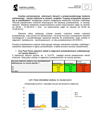 Analiza porównawcza zebranych danych z przeprowadzonego badania ankietowego wśród rodziców w ramach projektu "Lepsza przyszłość zaczyna się w przedszkolu" badającego stopień osiągnięcia wskaźnika rezultatu miękkiego "Wzrost świadomości rodziców dotyczących roli edukacji przedszkolnej w rozwoju dziecka" Badanie ankietowe przeprowadzono przed rozpoczęciem zajęć (w okresie od 28.08 - 31.08.2012 ) oraz na zakończenie zajęć (w okresie od 03.06 do 10.06.2012) Zebrane dane wskazują zmianę postaw rodziców wobec edukacji przedszkolnej oraz wzrost ich świadomości na temat korzyści rozwojowych dziecka wynikających z wcześniejszego zapisania dziecka do przedszkola i jego udziału w zajęciach dydaktyczno - wychowawczych w roku przedszkolnym 2012/2013. Poniżej przedstawiono pytania dotyczącego danego wskaźnika rezultatu miękkiego i udzielone odpowiedzi w ujęciu procentowym, a także procent wzrostu świadomości. 1. Czy Pani/ Pana zdaniem udział w zajęciach przedszkolnych oddziaływuje na rozwój dziecka ? Z zebranych danych wynika, że o 14,37% nastąpił wzrost świadomości wśród rodziców dotyczący udziału w zajęciach przedszkolnych na rozwój dziecka. Czy pani zdaniem udział w zaj. przedszkolnych oddziaływuje na rozwój dziecka ? proce ntow o wszyscy IX 2012 tak nie nie wiem procentow o w zrost ś w iadom oś ci wszyscy VI 2013 procentowo 83,09 97,46 14,37 4,41 0,85 -3,56 12,5 1,69 -10,81 CZY PANI ZDANIEM UDZIAŁ W ZAJĘCIACH , PRZEDSZKOLNYCH ODDZIAŁYWUJE NA ROZWÓJ DZIECKA 120 97,46 100 83,09 tak nie nie w iem 80 60 40 20 12,5 4,41 0,85 1,69 0 w szyscy IX 2012 w szyscy VI 2013 2. Jakie Pani/Pana zdaniem korzyści płyną z pobytu dziecka w przedszkolu? Z zebranych danych wynika, że nastąpił wzrost świadomości wśród rodziców dotyczący korzyści płynących z pobytu dziecka w przedszkolu o: - 20,10% dot. zajęć rozwijających zdolności muzyczne - 10,63 % dot. zajęć rozwijających zdolności plastyczne - 4,90% dot. zajęć rozwijających zdolności techniczne - 16,98% dot. zajęć rozwijających mowę i myślenie - 7,26% dot. rozwoju społecznego i emocjonalnego Jakie pani zdaniem korzyści płyną z pobytu dziecka w przedszkolu? proce ntow o procentow o w zrost ś w iadom oś ci procentowo wszyscy IX 2012 wszyscy VI 2013 59,56 79,66 20,1 60,69 71,32 10,63 57,35 62,25 4,9 77,94 94,92 16,98 80,88 88,14 7,26 rozwój zdolności muzycznych rozwój zdolności plastycznych rozwój zdolności technicznych rozwój mowy i myślenia rozwój społeczny i emocjonalny JAKIE PANI ZDANIEM KORZYŚCI PŁYNĄ Z POBYTU DZIECKA W PRZEDSZKOLU 94,92 100 88,14 77,94 80 60 80,88 rozw ój zdolności muzycznych rozw ój zdolności plastycznych rozw ój zdolności technicznych rozw ój mow y i myślenia rozw ój społeczny i emocjonalny 79,66 71,32 62,25 59,56 60,69 57,35 40 20 0 w szyscy IX 2012 w szyscy VI 2013 3. Czy Pani/Pana zdaniem współpraca rodziców z przedszkolem, wpływa pozytywnie na rozwój dziecka? Z zebranych danych wynika, że o 14,37% nastąpił wzrost świadomości wśród rodziców dotyczący pozytywnego wpływu współpracy rodziców z przedszkolem na rozwój dziecka. Czy Pani zdaniem współpraca rodziców z przedszkolem wpływa pozytywnie na rozwój dziecka? tak nie nie wiem proce ntow o procentow o w zrost ś w iadom oś ci wszyscy IX 2012 wszyscy VI 2013 procentowo 83,09 97,46 14,37 4,41 0 -4,41 12,5 2,54 -9,96 CZY PANI ZDANIEM WSPÓŁPRACA RODZICÓW Z PRZEDSZKOLEM WPŁYWA POZYTYWNIE NA ROZWÓJ DZIECKA 120 97,46 100 83,09 tak nie nie w iem 80 60 40 20 12,5 4,41 2,54 0 0 w szyscy IX 2012 w szyscy VI 2013 4. Czy doświadczenie zdobyte w przedszkolu ma wpływ na osiągnięcia szkolne? Z zebranych danych wynika, że o 16,69 % nastąpił wzrost świadomości wśród rodziców dotyczącego wpływu zdobytego doświadczenia w przedszkolu na osiągnięcia szkolne. Czy doświadczenie zdobyte w przedszkolu ma wpływ na osiągnięcia szkolne? proce ntow o tak nie nie wiem procentow o w zrost ś w iadom oś ci wszyscy IX 2012 wszyscy VI 2013 procentowo 81,62 98,31 16,69 3,68 0 -3,68 14,71 1,69 -13,02 CZY DOŚWIADCZENIE ZDOBYTE W PRZEDSZKOLU MA WPŁYW NA OSIĄGNIĘCIA SZKOLNE? 120 98,31 100 81,62 tak nie nie w iem 80 60 40 20 14,71 3,68 0 1,69 0 w szyscy IX 2012 w szyscy VI 2013 opracowała – mgr Beata Szymczak