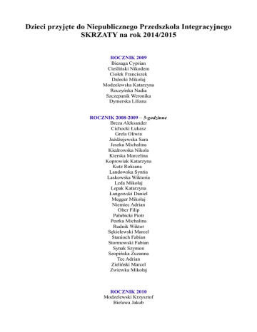 Dzieci przyjęte do Niepublicznego Przedszkola Integracyjnego SKRZATY na rok 2014/2015 ROCZNIK 2009 Biesaga Cyprian Cieśliński Nikodem Ciołek Franciszek Dalecki Mikołaj Modzelewska Katarzyna Roczyńska Nadia Szczepanik Weronika Dymerska Liliana ROCZNIK 2008-2009 – 5-godzinne Breza Aleksander Cichocki Łukasz Grela Oliwia Jażdżejewska Sara Jeszka Michalina Kiedrowska Nikola Kierska Marcelina Koprowiak Katarzyna Kutz Roksana Landowska Syntia Laskowska Wiktoria Leda Mikołaj Lepak Katarzyna Łangowski Daniel Megger Mikołaj Niemiec Adrian Olter Filip Pałubicki Piotr Pestka Michalina Rudnik Wiktor Sękielewski Marcel Stanioch Fabian Stormowski Fabian Synak Szymon Szopińska Zuzanna Tec Adrian Zieliński Marcel Zwiewka Mikołaj ROCZNIK 2010 Modzelewski Krzysztof Bielawa Jakub ROCZNIK 2011 Afanasie Kalina Binger Jan Cieślińska Aniela Ciołek Hanna Czapiewska Marta Data Oliwia Doktorowicz Zofia Gierszewski Miłosz Głomska Weronika Głomski Paweł Gostomczyk Antoni Goślicka Marta Górny Tomasz Gronowski Adrian Gruchała Piotr Madej Olivier Nowak Grażyna Jagodzińska Maria Jurkowski Leon Kafarska Hanna Kazykalewicz Michał Kiełpiński Wojciech Kisała Amelia Krauze Dominika Krawczyk Szymon LISTA REZERWOWA ROCZNIK 2011 Zdyb Adam Mackowski Szymon Witzon Agata Klaman-Nekielski Filip Domachowski Marcel Leszczyński Kordian Ginter Stanisław Harkała Alan Król Agata Zemke Lena Lońska Julia Stopa Dominika Szupke Leon Rybarczyk Julia Kierski Julian Wodowska Matylda Kroll Leonard Kruk Paweł Kuklińska Aleksandra Kulesza Tomasz Kułakowska Katarzyna Malszewska Maja Mikołajczak Miłosz Moga Paweł Nadobna Maja Nartowski Aleksander Laska Hubert Lica Milena Lonski Maksymilian Łosin Szymon Ostrowska Antonina Packi Oliwier Peno Wiktoria Piątek Kinga Pik Oliver Pyr Zofia Reder Agata Reszczyńska Alicja Reszke Zofia Roczyńska Lena Rzepiński Bartosz Sawicka Alicja Skorupska Anna Stoltmann Aleksander Sumińska Martyna Szopińska Marta Tałocha Filip LISTA REZERWOWA ROCZNIK 2010 Guenther Antoni Rydzik Wojciech Misztal Lena Boettcher Jakub Gierszal Aleks