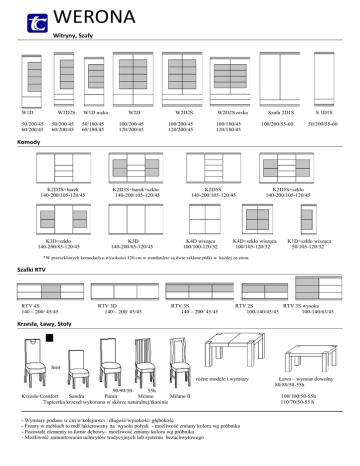 WERONA Witryny, Szafy W1D W1D2S 50/200/45 60/200/45 50/200/45 60/200/45 W1D niska 50/180/45 60/180/45 W2D 100/200/45 120/200/45 W2D2S 100/200/45 120/200/45 W2D2S niska 100/180/45 120/180/45 Szafa 2D1S 100/200/55-60 S 1D1S 50/200/55-60 Komody K2D3S+barek 140-200/105-120/45 K3D+szkło 140-200/85-120/45 K2D3S+barek+szkło 140-200/105-120/45 K3D 140-200/85-120/45 K2D5S 140-200/105-120/45 K4D wisząca 100/100-120/32 K2D5S+szkło 140-200/105-120/45 K4D+szkło wisząca 100/105-120/32 K1D+szkło wisząca 50/105-120/32 *W przeszklonych komodach o wysokości 120 cm w standardzie są dwie szklane półki w każdej ze stron. Szafki RTV RTV 4S 140 – 200/ 45/45 RTV 3D 140 – 200/ 45/45 RTV 3S 140 – 200/ 45/45 RTV 2S RTV 3S wysoka 100-140/45/45 100-140/63/45 Krzesła, Ławy, Stoły Stół (długość,wkładki,szerokość) różne modele i wymiary 100+ 120+3x60/90 ,100 90/90/5055h Krzesło Comfort Sandra Pamir Milano Milano II Tapicerka krzeseł wykonana w skórze naturalnej/tkaninie 140,160 + 3x60/80,90,100 180+3x60/90,100 - Wymiary podano w cm w kolejności : długość/wysokość/ głębokość - Fronty w meblach to mdf lakierowany na wysoki połysk - możliwość zmiany koloru wg próbnika - Pozostałe elementy to fornir dębowy– możliwość zmiany koloru wg próbnika - Możliwość zamontowania uchwytów tradycyjnych lub systemu bezuchwytowego Ława – wymiar dowolny 80/80/50-55h 100/100/50-55h 110/70/50-55 h