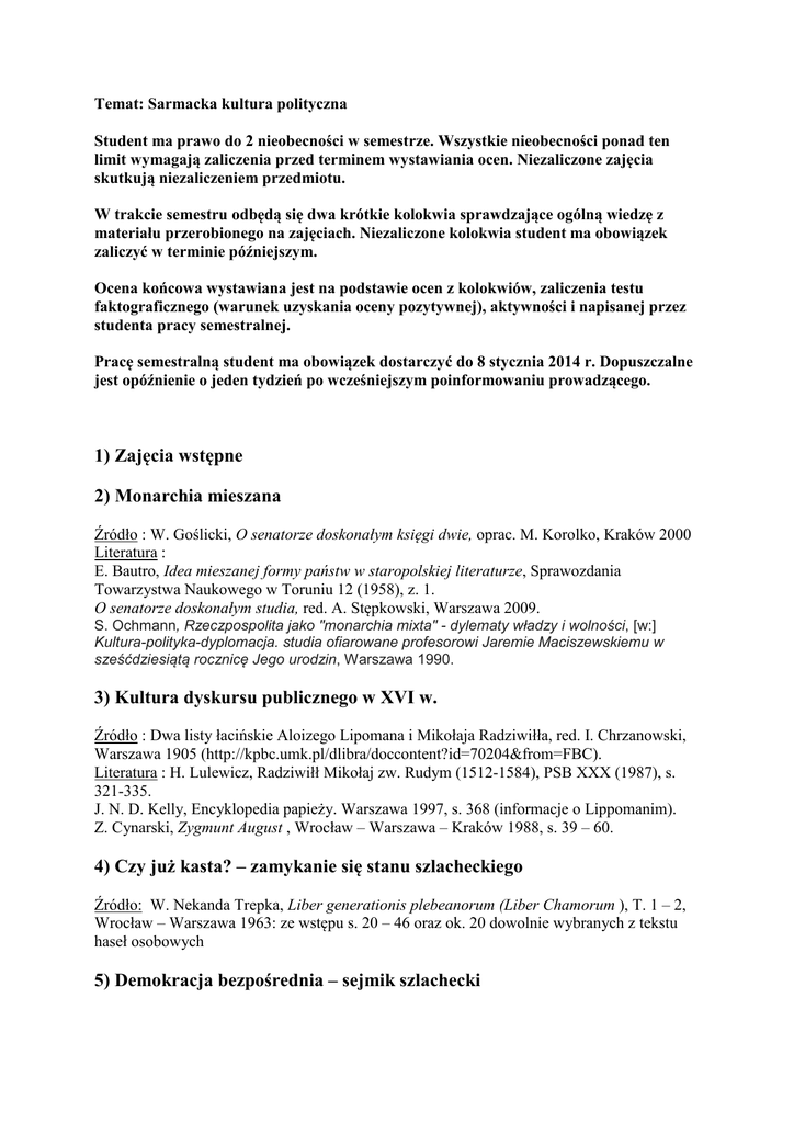 Temat: Sarmacka kultura polityczna Student ma prawo do 2 nieobecności w semestrze. Wszystkie nieobecności ponad ten limit wymagają zaliczenia przed terminem wystawiania ocen. Niezaliczone zajęcia skutkują niezaliczeniem przedmiotu. W trakcie semestru odbędą się dwa krótkie kolokwia sprawdzające ogólną wiedzę z materiału przerobionego na zajęciach. Niezaliczone kolokwia student ma obowiązek zaliczyć w terminie późniejszym. Ocena końcowa wystawiana jest na podstawie ocen z kolokwiów, zaliczenia testu faktograficznego (warunek uzyskania oceny pozytywnej), aktywności i napisanej przez studenta pracy semestralnej. Pracę semestralną student ma obowiązek dostarczyć do 8 stycznia 2014 r. Dopuszczalne jest opóźnienie o jeden tydzień po wcześniejszym poinformowaniu prowadzącego. 1) Zajęcia wstępne 2) Monarchia mieszana Źródło : W. Goślicki, O senatorze doskonałym księgi dwie, oprac. M. Korolko, Kraków 2000 Literatura : E. Bautro, Idea mieszanej formy państw w staropolskiej literaturze, Sprawozdania Towarzystwa Naukowego w Toruniu 12 (1958), z. 1. O senatorze doskonałym studia, red. A. Stępkowski, Warszawa 2009. S. Ochmann, Rzeczpospolita jako "monarchia mixta" - dylematy władzy i wolności, [w:] Kultura-polityka-dyplomacja. studia ofiarowane profesorowi Jaremie Maciszewskiemu w sześćdziesiątą rocznicę Jego urodzin, Warszawa 1990. 3) Kultura dyskursu publicznego w XVI w. Źródło : Dwa listy łacińskie Aloizego Lipomana i Mikołaja Radziwiłła, red. I. Chrzanowski, Warszawa 1905 (http://kpbc.umk.pl/dlibra/doccontent?id=70204&from=FBC). Literatura : H. Lulewicz, Radziwiłł Mikołaj zw. Rudym (1512-1584), PSB XXX (1987), s. 321-335. J. N. D. Kelly, Encyklopedia papieży. Warszawa 1997, s. 368 (informacje o Lippomanim). Z. Cynarski, Zygmunt August , Wrocław – Warszawa – Kraków 1988, s. 39 – 60. 4) Czy już kasta? – zamykanie się stanu szlacheckiego Źródło: W. Nekanda Trepka, Liber generationis plebeanorum (Liber Chamorum ), T. 1 – 2, Wrocław – Warszawa 1963: ze wstępu s. 20 – 46 oraz ok. 20 dowolnie wybranych z tekstu haseł osobowych 5) Demokracja bezpośrednia – sejmik szlachecki Źródło : Diariusz sejmiku krakowskiego przedsejmowego z 1584 i zapis głosowania w Proszowicach, Akta sejmikowe województwa krakowskiego, t. 1 1572-1620, wyd. T. Kutrzeba, Kraków 1932. Literatura : J. Choińska – Mika, Między społeczeństwem szlacheckim a władzą , Warszawa 2002 (rozdział II, s. 85 – 204). A. Lityński, Szlachecka doktryna na sejmikach, czyli między mitem a utopią, zagadnienia wybrane [w:] Parlament, prawo, ludzie , Warszawa 1996, s. 134 – 141. W. Kriegseisen, Sejmiki Rzeczypospolitej szlacheckiej w XVII i XVIII wieku , Warszawa 1991 (rozdz. Obraz idealny i praktyka sejmikowania). 6) Liberum veto w teorii (Fredro) Źródła: A. M. Fredro: W obronie liberum veto [w:] Filozofia i myśl społeczna XVII wieku , opr. Z. Ogonowski, Warszawa 1979 Literatura : W. Kriegseisen, Sejm Rzeczypospolitej szlacheckiej do 1763 roku, Warszawa 1995, s. 31- 66. Nowe badania nad dziejami sejmu polskiego i geneza liberum veto, Czasopismo Prawno – Historyczne 13 (1961), z. 1. C. Backvis, Wymóg jednomyślności a wola ogółu , Czasopismo Prawno – Historyczne 27 (1975), z. 2, s. 170 – 173 Z. Ogonowski, Nad pismami A. M. Fredry w obronie liberum veto, [w:] tegoż, Filozofia polityczna w Polsce XVII wieku i tradycje demokracji europejskiej, Warszawa 1992, s. 9-57. 7) Liberum veto w praktyce (różne sejmy czasów saskich) Źródło: Diariusze sejmowe XVIII w., wyd. W. Konopczyński: 5 ostatnich sesji wybranego sejmu Literatura : W. Konopczyński, Liberum veto , Kraków 2002, Cz. II Rozkwit, Roz. II Czy liberum veto miało podstawę w prawie pisanym? H. Olszewski, Sejm Rzeczypospolitej epoki oligarchii 1652 - 1763, Poznań 1966. 8) Sarmacka dyplomacja Źródło: Akta poselstw do Szwecji, oprac. Z. Wójcik, Teki Archiwalne 5 (1957) Literatura: Wstęp do powyższych Historia dyplomacji polskiej, Warszawa 1982, t. 2, s. 218 – 232 i 294 – 298. 9) Zależności – Klientela w Rzeczypospolitej Obojga Narodów Źródło: M. Matuszewicz , Pamiętniki Marcina Matuszewicza kasztelana brzeskiego-litewskiego : 1714-1765, t. 1-4, red. A. Pawiński, Warszawa 1876. Literatura : Antoni Mączak, Klientela. Nieformalne systemy władzy w Polsce i Europie XVI-XVIII wieku, Warszawa 1994, rozdział: Klientela jako styl życia . W. Tygielski, Klientela: więzi społeczne – grupy nacisku [w:] Władza i społeczeństwo w XVI i XVII wieku , Warszawa 1989, s. 261 – 282. U. Augustyniak, W służbie hetmana i Rzeczypospolitej. Klientela wojskowa Krzysztofa Radziwiłła (1585-1640), Warszawa 2004. 10) Zdrada, zrozumienie terminu Tylko literatura : A. Kersten, Hieronim Radziejowski: studium władzy i opozycji, Warszawa 1988. H. Wisner, Dysydenci litewscy wobec wybuchu wojny polsko-szwedzkiej (1655-1660), Odrodzenie i Reformacja w Polsce 15 (1970), s. 130-144. T. Wasilewski, Zdrada Janusza Radziwiłła w 1655 r. i jej wyznaniowe motywy, Odrodzenie i Reformacja w Polsce 18 (1973). 11) Test Faktograficzny 12) Stanisław Konarski, W pętach niemożności Źródło: St. Konarski, Rozmowa ziemianina ze swoim sąsiadem [w:] tenże, Wybór pism , opr. J. Nowak – Dłużewski Literatura : W. Konopczyński: S. Konarski, Warszawa (Kraków) 1926. K. Kantecki, Stanisław Poniatowski, t. I - II, Poznań. 1880. E. Rostworowski, O polską koronę. Polityka Francji w Latach 1725 – 1733 , Wrocław 1958. 13) Przeciw staremu porządkowi Źródła: St. Leszczyński, Głos wolny wolność ubezpieczający, wyd. S. Jedynak, Lublin 1987. Literatura : W. Konopczyński, Polscy pisarze polityczni XVIII w., Warszawa 1966. Lechicka, Rola dziejowa Stanisława Leszczyńskiego, oraz wybór z jego pism, Toruń 1951 (wstęp). E. Rostworowski: Czy Stanisław Leszczyński był autorem Głosu wolnego ? [w:] tegoż, Legendy i fakty XVIII w., Warszawa 1963. 14) Ku uzdrowieniu ogólnemu Źród