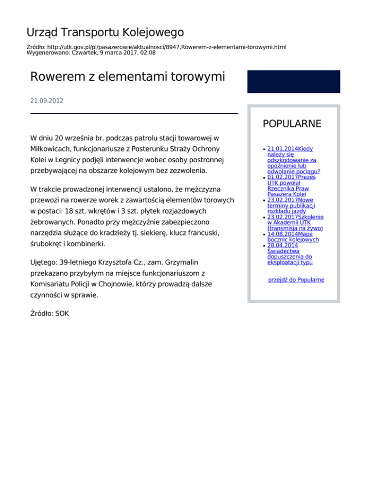 Urząd Transportu Kolejowego Źródło: http://utk.gov.pl/pl/pasazerowie/aktualnosci/8947,Rowerem-z-elementami-torowymi.html Wygenerowano: Czwartek, 9 marca 2017, 02:08 Rowerem z elementami torowymi 21.09.2012 POPULARNE W dniu 20 września br. podczas patrolu stacji towarowej w Miłkowicach, funkcjonariusze z Posterunku Straży Ochrony ● Kolei w Legnicy podjęli interwencje wobec osoby postronnej przebywającej na obszarze kolejowym bez zezwolenia. ● W trakcie prowadzonej interwencji ustalono, że mężczyzna przewozi na rowerze worek z zawartością elementów torowych ● w postaci: 18 szt. wkrętów i 3 szt. płytek rozjazdowych żebrowanych. Ponadto przy mężczyźnie zabezpieczono narzędzia służące do kradzieży tj. siekierę, klucz francuski, śrubokręt i kombinerki. Ujętego: 39-letniego Krzysztofa Cz., zam. Grzymalin przekazano przybyłym na miejsce funkcjonariuszom z Komisariatu Policji w Chojnowie, którzy prowadzą dalsze czynności w sprawie. Źródło: SOK ● ● ● 21.01.2014Kiedy należy się odszkodowanie za opóźnienie lub odwołanie pociągu? 01.02.2017Prezes UTK powołał Rzecznika Praw Pasażera Kolei 23.02.2017Nowe terminy publikacji rozkładu jazdy 23.02.2017Szkolenie w Akademii UTK (transmisja na żywo) 14.08.2014Mapa bocznic kolejowych 28.04.2014 Świadectwa dopuszczenia do eksploatacji typu przejdź do Popularne