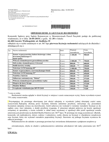 Komornik Sądowy przy Sądzie Rejonowym w Skierniewicach Paweł Pacyński Kancelaria Komornicza w Skierniewicach 96-100 Skierniewice ul. Reymonta 2A tel. /fax 46 8333176, 781 693 370 e-mail: [email protected] www.komornik-skierniewice.pl Km 1692/11 Skierniewice, dnia 16-04-2015 P.T. . #ak *0020000986162*/0419/ *0020000986162* OBWIESZCZENIE O LICYTACJI RUCHOMOŚCI Komornik Sądowy przy Sądzie Rejonowym w Skierniewicach Paweł Pacyński podaje do publicznej wiadomości, że w dniu 26-05-2015r. o godz. 12 :30 w lokalu: 66-400 Gorzów Wielkopolski, ul. Siedlicka 35 odbędzie się w trybie ustalonym w art. 867 kpc pierwsza licytacja ruchomości należących do dłużnika i składających się z: 1 [szt.] Wartość szacunkowa 1 200,00 **) Cena wywołania 900,00 1 [szt.] 1 [szt.] 1 [szt.] 1 [szt.] 1 [szt.] 1 [szt.] 1 [szt.] 1 [szt.] 1 [szt.] 1 [szt.] 1 [szt.] 1 [szt.] 1 000,00 **) 800,00 **) 200,00 **) 1 000,00 **) 800,00 **) 600,00 **) 300,00 **) 500,00 **) 800,00 **) 500,00 **) 100,00 **) 100,00 **) 750,00 600,00 150,00 750,00 600,00 450,00 225,00 375,00 600,00 375,00 75,00 75,00 Lp. Nazwa ruchomości Ilość 1 Zestaw wypoczynowkoy koloru beżowego z elem. drewnianymi(kanapa+2 fotele+pufa) Witryna ciemnobrązowa,przeszklona,szeroka Stół owalny ciemnobrązowy+6 krzeseł Stolik kawowy owalny Telewizor LCD Samsung 40" Zestaw wypoczynkowy czerwony(kanapa+fotel) Telewizor LCD Samsung 32" Toaletka z lustrem Odkurzacz automatyczny "Robot" Witryna ciemnobrązowa przeszklona wąska Ekspres do kawy Krups Monitor Belinea Urządzenie wielofunkcyjne HP P9 2410 2 3 4 5 6 7 8 9 10 11 12 13 *) cena za sztukę Ruchomości można oglądać w dzień licytacji w miejscu i czasie oznaczonym wyżej. Suma wywołania wynosi 75% sumy oszacowania. Przystępujący do przetargu obowiązany jest złożyć rękojmię w wysokości jednej dziesiątej części sumy oszacowania. Rękojmię złożoną przez licytanta, któremu udzielono przybicia, zatrzymuje się; pozostałym licytantom rękojmię zwraca się niezwłocznie. Jeżeli nabywca nie wykonał w terminie warunków licytacji co do zapłaty ceny, traci rękojmię, a skutki przybicia wygasają. Z utraconej rękojmi pokrywa się koszty egzekucji związanej ze sprzedażą, a reszta wchodzi w skład sumy uzyskanej w egzekucji albo jeżeli egzekucja została umorzona jest przelewana na dochód Skarbu Państwa (art. 8671 kpc). W przetargu nie mogą uczestniczyć: dłużnik, komornik, ich małżonkowie, dzieci, rodzice i rodzeństwo, osoby obecne na licytacji w charakterze urzędowym oraz licytant, który nie wykonał warunków poprzedniej licytacji. Stawienie się jednego licytanta wystarcza do odbycia przetargu. Pełnomocnictwo do udziału w przetargu powinno być stwierdzone dokumentem z podpisem urzędowo p oświadczonym, chyba że chodzi o pełnomocnictwo udzielone adwokatowi lub radcy prawnemu (art. 8672 kpc) UWAGA: Licytacja może się nie odbyć bez podania przyczyny. Jeżeli drzwi będą zamknięte, będą otwierane na koszt i odpowiedzialność obowiązanegodłużnika. Tomasz Tutka Tomasz Lesiak Anna Bartczak-Lisik aplikant komorniczy asesor komorniczy asesor komorniczy Do wiadomości: 1. a/a Paweł Pacyński komornik sądowy
