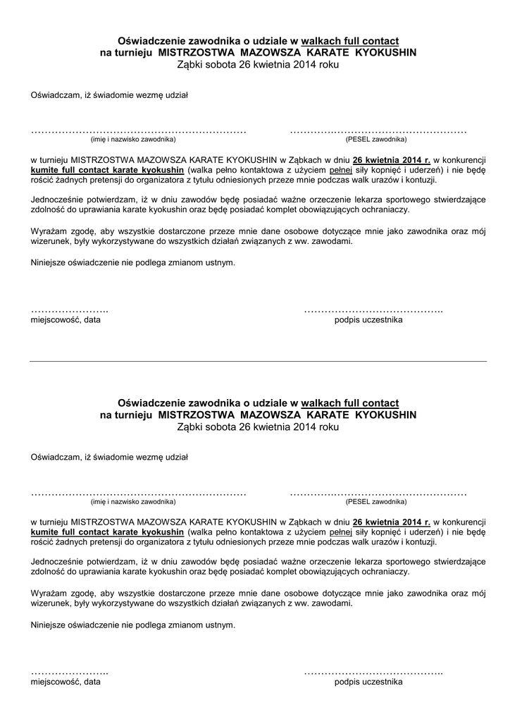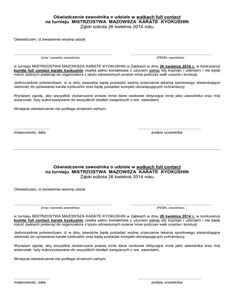 Oświadczenie zawodnika o udziale w walkach full contact na turnieju MISTRZOSTWA MAZOWSZA KARATE KYOKUSHIN Ząbki sobota 26 kwietnia 2014 roku Oświadczam, iż świadomie wezmę udział ……………………………………………………… (imię i nazwisko zawodnika) ………….………………………………… (PESEL zawodnika) w turnieju MISTRZOSTWA MAZOWSZA KARATE KYOKUSHIN w Ząbkach w dniu 26 kwietnia 2014 r. w konkurencji kumite full contact karate kyokushin (walka pełno kontaktowa z użyciem pełnej siły kopnięć i uderzeń) i nie będę rościć żadnych pretensji do organizatora z tytułu odniesionych przeze mnie podczas walk urazów i kontuzji. Jednocześnie potwierdzam, iż w dniu zawodów będę posiadać ważne orzeczenie lekarza sportowego stwierdzające zdolność do uprawiania karate kyokushin oraz będę posiadać komplet obowiązujących ochraniaczy. Wyrażam zgodę, aby wszystkie dostarczone przeze mnie dane osobowe dotyczące mnie jako zawodnika oraz mój wizerunek, były wykorzystywane do wszystkich działań związanych z ww. zawodami. Niniejsze oświadczenie nie podlega zmianom ustnym. ………………….. miejscowość, data ………………………………….. podpis uczestnika Oświadczenie zawodnika o udziale w walkach full contact na turnieju MISTRZOSTWA MAZOWSZA KARATE KYOKUSHIN Ząbki sobota 26 kwietnia 2014 roku Oświadczam, iż świadomie wezmę udział ……………………………………………………… (imię i nazwisko zawodnika) ………….………………………………… (PESEL zawodnika) w turnieju MISTRZOSTWA MAZOWSZA KARATE KYOKUSHIN w Ząbkach w dniu 26 kwietnia 2014 r. w konkurencji kumite full contact karate kyokushin (walka pełno kontaktowa z użyciem pełnej siły kopnięć i uderzeń) i nie będę rościć żadnych pretensji do organizatora z tytułu odniesionych przeze mnie podczas walk urazów i kontuzji. Jednocześnie potwierdzam, iż w dniu zawodów będę posiadać ważne orzeczenie lekarza sportowego stwierdzające zdolność do uprawiania karate kyokushin oraz będę posiadać komplet obowiązujących ochraniaczy. Wyrażam zgodę, aby wszystkie dostarczone przeze mnie dane osobowe dotyczące mnie jako zawodnika oraz mój wizerunek, były wykorzystywane do wszystkich działań związanych z ww. zawodami. Niniejsze oświadczenie nie podlega zmianom ustnym. ………………….. miejscowość, data ………………………………….. podpis uczestnika