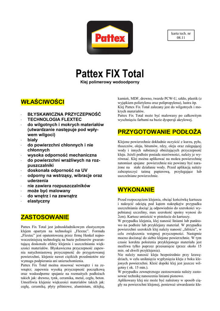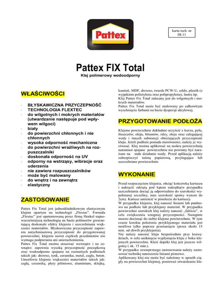 karta tech. nr 08.11 Pattex FIX Total Klej polimerowy wodoodporny CIWO CI - - YSKAWICZNA PRZYCZEPNO TECHNOLOGIA FLEXTEC do wilgotnych i mokrych materia ów (utwardzanie nast puje pod wp ywem wilgoci) bia y do powierzchni ch onnych i nie ch onnych wysoka odporno mechaniczna do powierzchni wra liwych na rozpuszczalniki doskona a odporno na UV odporny na wstrz sy, wibracje oraz uderzenia nie zawiera rozpuszczalników mo e by malowany do wn trz i na zewn trz elastyczny ZASTOSOWANIE Pattex Fix Total jest jednosk adnikowym elastycznym klejem opartym na technologii „Flextec”. Formu a „Flextec” jest opatentowan przez firm Henkel najnowocze niejsz technologi na bazie polimerów gwarantuj doskona e efekty klejenia i uszczelniania wi kszo ci materia ów. B yskawiczna przyczepno zapewnia natychmiastow przyczepno do przygotowanej powierzchni, klejenie nawet ci kich przedmiotów nie wymaga podpierania ani unieruchomienia. Pattex Fix Total mo na stosowa wewn trz i na zewn trz; zapewnia wysok przyczepno pocz tkow oraz wodoodporne spajanie na rozmaitych pod ach takich jak: drewno, tynk, ceramika, metal, ceg a, beton. Umo liwia klejenie wi kszo ci materia ów takich jak: ceg , ceramik , p yty pil niowe, aluminium, sklejk , kamie , MDF, drewno, twarde PCW-U, szk o, plastik (z wyj tkiem polietylenu oraz polipropylenu), lustra itp. Klej Pattex Fix Total zalecany jest do wilgotnych i mokrych materia ów. Pattex Fix Total mo e by malowany po ca kowitym wyschni ciu farbami na bazie dyspersji akrylowej. PRZYGOTOWANIE POD A Klejone powierzchnie dok adnie oczy ci z kurzu, py u, uszczów, oleju, bitumów, rdzy, oleju oraz zalegaj cej wody i innych substancji obni aj cych przyczepno kleju. Je eli pod e posiada nierówno ci, nale y je wyrówna . Klej mo na aplikowa na mokra powierzchni natomiast spajane powierzchnie nie powinny by naraone na sta e dzia anie wody. Przed aplikacj nale y zabezpieczy ta papierow , przylegaj ce lub uszczelniane powierzchnie. WYKONANIE Przed rozpocz ciem klejenia, obci ko cówk kartusza i nakr ci odci pod k tem nakr tk (w przypadku uszczelniania doci j odpowiednio do szeroko ci wype nianej szczeliny, max szeroko spoiny wynosi do 2cm). Kartusz umie ci w pistolecie do kartuszy. W przypadku klejenia, klej nanosi liniami lub punktowo na pod e lub przyklejany materia . W przypadku powierzchni szerokich klej nale y nanosi „fali cie”, w celu zwi kszenia wst pnej przyczepno ci. Nast pnie mocno docisn do siebie klejone powierzchnie. W tym czasie korekta po enia przyklejonego materia u jest mo liwa tylko poprzez przesuni cie (przez oko o 15 min. od chwili przyklejenia). Nie nale y nanosi kleju bezpo rednio przy kraw dziach, w celu unikni cia wyp yni cia kleju z boku klejonych powierzchni. Klei dopóki klej jest jeszcze wilgotny ( ok. 15 min.). W przypadku zewn trznego zastosowania nale y zastosowa technik nanoszenia liniami pionowo. Aplikowany klej nie mo e by na ony w sposób ci y na powierzchni klejonej, poniewa utwardzanie kle- ju nast puje pod wp ywem wilgoci zawartej w powietrzu lub w pod u. W przypadku klejenia dwóch elementów o powierzchniach niech onnych zaaplikowany klej nie mo e by ca kowicie odci ty od dost pu powietrza. W zale no ci od powierzchni, na jakich klejone s elementy, wymagane mo e by podparcie ci kich przedmiotów przez min. 24 godziny. wie e zabrudzenia natychmiast po zastosowaniu naley czy ci za pomoc suchej ciereczki, a nast pnie acetonem lub benzyn lakow . Utwardzony materia mo na usun tylko mechanicznie. UWAGA Prace nale y wykonywa w suchych warunkach, przy temperaturze powietrza i pod a od +5ºC do +40 C. Wszelkie dane odnosz si do temperatury +20 C i wilgotno ci wzgl dnej powietrza 50%. W innych warunkach nale y uwzgl dni krótszy lub d szy czas twardnienia materia u. W przypadku otwarcia opakowania, nale y wykorzysta ca y kartusz. Materia zawiera substancje szkodliwe dla zdrowia. Chroni oczy. W pomieszczeniach zapewni odpowiedni wentylacj . W razie po kni cia nie wywo ywa wymiotów: niezw ocznie zasi gn porady lekarza i pokaza opakowanie lub etykiet . Chroni przed dzie mi. ZALECENIA Niniejsza karta techniczna okre la zakres stosowania materia u i sposób prowadzenia robót, ale nie mo e zast pi zawodowego przygotowania wykonawcy. Oprócz podanych informacji prace nale y wykonywa zgodnie ze sztuk budowlan i zasadami BHP. Producent gwarantuje jako wyrobu, natomiast nie ma wp ywu na warunki i sposób jego u ycia. W przypadku tpliwo ci nale y wykona w asne próby stosowania. Wraz z ukazaniem si tej karty technicznej trac wa no karty wcze niejsze. SK ADOWANIE Do 18 miesi cy od daty produkcji umieszczonej na opakowaniu. Przechowywa w oryginalnych nieuszkodzonych, szczelnie zamkni tych opakowaniach; w ch odnych i suchych warunkach w temperaturze od +5ºC do +30ºC. Nie przechowywa w pobli u róde zap onu nie pali tytoniu. OPAKOWANIA Opakowanie: 440g. DANE TECHNICZNE Baza: polimery z silanami _____________________________________________ Czas otwarty: oko o 15 min. _____________________________________________ Ko cowa wytrzyma (DIN EN 205): 1-2 N/mm² _____________________________________________ sto : 1,6 g/cm³ Czas pe nego utwardzenia: 2 mm w ci gu 24h _____________________________________________ Skurcz: brak _____________________________________________ Odporno termiczna: od –30ºC do +80 C (100ºC w krótkim czasie) _____________________________________________ Temperatura stosowania: od +5ºC do +40oC _____________________________________________ Przyczepno pocz tkowa: oko o 15g/cm² _____________________________________________ Zu ycie (klejenie przy pow. p askiej): oko o 300 g/m² _____________________________________________ Wyd enie przy zerwaniu (DIN 53504): oko o 100% ========================================