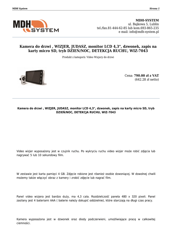 MDH System Strona 1 MDH-SYSTEM ul. Bajkowa 5, Lublin tel./fax.81-444-62-85 lub kom.693-865-235 e mail: [email protected] Kamera do drzwi , WIZJER, JUDASZ, monitor LCD 4,3", dzwonek, zapis na karty micro SD, tryb DZIEŃ/NOC, DETEKCJA RUCHU, WIZ-7043 Produkt z kategorii: Video Wizjery do drzwi Cena: 790.00 zł z VAT (642.28 zł netto) Kamera do drzwi , WIZJER, JUDASZ, monitor LCD 4,3", dzwonek, zapis na karty micro SD, tryb DZIEŃ/NOC, DETEKCJA RUCHU, WIZ-7043 Video wizjer wyposażony jest w czujnik ruchu. Po wykryciu ruchu video wizjer może robić zdjęcia lub nagrywać 5 lub 10 sekundowy film. W zestawie jest karta pamięci 4 GB. Zdjęcie robione jest również osobie dzwoniącej. W dowolnej chwili możemy także włączyć obraz z kamery i zrobić zdjęcie lub nagrać film. Panel video wizjera jest bardzo duży, ma 4,3 cala. Rozdzielczość panela 480 x 320 pixeli. Panel zasilany jest 4 bateriami AAA ( baterie należy dokupić oddzielnie), które starczają na długi czas pracy. Kamera wyposażona jest w dzwonek oraz diody podczerwieni, umożliwiające pracę w całkowitej ciemności. MDH System Strona 2 Możliwość ustawienia rodzaju dzwonka, głośności, daty i godziny. Videowizjer można zamontować w drzwiach o grubości 38-110mm. Otwór drzwiowy powinien mieć średnicę od 14-26mm. Videowizjer można zamontować w otworze po standardowym wizjerze, można także przewiercić otwór w drzwiach. Wymiary panelu lcd 139 x 80 x 19,8mm. Wykrywanie ruchu w tym modelu opiera się na czujniku podczerwieni. Takie rozwiązanie nie generuje fałszywych nagrań. Mozliwość pracy w całkowitych ciemnościach. Opcja dostepna na zamówienie - zasilanie wizjera z zasilacza sieciowego zamiast z akumulatorków - koszt modernizacji 250 zł Zapraszamy do naszego sklepu internetowego www.mdh-system.pl Dokument wygenerowany 2017-03-09 o godzinie 02:08