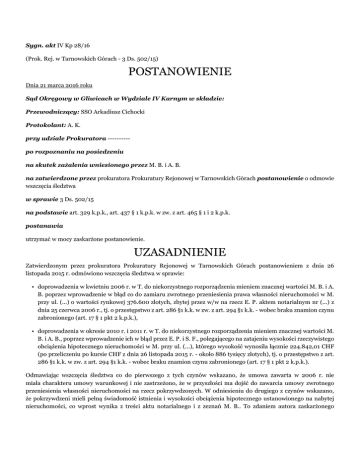 Sygn. akt IV Kp 28/16 (Prok. Rej. w Tarnowskich Górach - 3 Ds. 502/15) POSTANOWIENIE Dnia 21 marca 2016 roku Sąd Okręgowy w Gliwicach w Wydziale IV Karnym w składzie: Przewodniczący: SSO Arkadiusz Cichocki Protokolant: A. K. przy udziale Prokuratora ---------po rozpoznaniu na posiedzeniu na skutek zażalenia wniesionego przez M. B. i A. B. na zatwierdzone przez prokuratora Prokuratury Rejonowej w Tarnowskich Górach postanowienie o odmowie wszczęcia śledztwa w sprawie 3 Ds. 502/15 na podstawie art. 329 k.p.k., art. 437 § 1 k.p.k. w zw. z art. 465 § 1 i 2 k.p.k. postanawia utrzymać w mocy zaskarżone postanowienie. UZASADNIENIE Zatwierdzonym przez prokuratora Prokuratury Rejonowej w Tarnowskich Górach postanowieniem z dnia 26 listopada 2015 r. odmówiono wszczęcia śledztwa w sprawie: • doprowadzenia w kwietniu 2006 r. w T. do niekorzystnego rozporządzenia mieniem znacznej wartości M. B. i A. B. poprzez wprowadzenie w błąd co do zamiaru zwrotnego przeniesienia prawa własności nieruchomości w M. przy ul. (...) o wartości rynkowej 376.600 złotych, zbytej przez w/w na rzecz E. P. aktem notarialnym nr (...) z dnia 25 czerwca 2006 r., tj. o przestępstwo z art. 286 §1 k.k. w zw. z art. 294 §1 k.k. - wobec braku znamion czynu zabronionego (art. 17 § 1 pkt 2 k.p.k.), • doprowadzenia w okresie 2010 r. i 2011 r. w T. do niekorzystnego rozporządzenia mieniem znacznej wartości M. B. i A. B., poprzez wprowadzenie ich w błąd przez E. P. i S. F., polegającego na zatajeniu wysokości rzeczywistego obciążenia hipotecznego nieruchomości w M. przy ul. (...), którego wysokość wynosiła łącznie 224.842,01 CHF (po przeliczeniu po kursie CHF z dnia 26 listopada 2015 r. - około 886 tysięcy złotych), tj. o przestępstwo z art. 286 §1 k.k. w zw. z art. 294 §1 k.k. - wobec braku znamion czynu zabronionego (art. 17 § 1 pkt 2 k.p.k.). Odmawiając wszczęcia śledztwa co do pierwszego z tych czynów wskazano, że umowa zawarta w 2006 r. nie miała charakteru umowy warunkowej i nie zastrzeżono, że w przyszłości ma dojść do zawarcia umowy zwrotnego przeniesienia własności nieruchomości na rzecz pokrzywdzonych. W odniesieniu do drugiego z czynów wskazano, że pokrzywdzeni mieli pełną świadomość istnienia i wysokości obciążenia hipotecznego ustanowionego na nabytej nieruchomości, co wprost wynika z treści aktu notarialnego i z zeznań M. B.. To zdaniem autora zaskarżonego postanowienia uprawnia do wniosku, że w przypadku obu czynów zaktualizowała się negatywna przesłanka procesowa z art. 17 § 1 pkt 2 k.p.k. tj. brak znamion czynu zabronionego. Powyższe postanowienie zakwestionowali pokrzywdzeni. W złożonym zażaleniu podnieśli, że zaskarżone postanowienie zapadło przedwcześnie a jego uzasadnienie nie koreluje z przytoczonymi przez nich faktami. W przekonaniu skarżących zostali oni wprowadzeni w błąd co do faktycznej wysokości zobowiązań ciążących na nabytej przez nich nieruchomości. Zauważyli, że wpis hipoteki „jest tylko wpisem umownym” i nie odzwierciedla rzeczywistego stanu spłaty zobowiązania, które hipoteka zabezpiecza. Wysokość ta została według skarżących zaniżona przez E. P. i S. F., którzy przed podpisaniem aktu notarialnego wskazywali na znacznie niższą wysokość swoich zobowiązań wobec banku. Skarżący wskazali, że wymienione osoby przed ponownym przeniesieniem własności nieruchomości przekazali M. i A. B. informację, iż pozostająca do spłaty suma kredytu opiewa zaledwie na kwotę około 50 tysięcy złotych. W tym kontekście skarżący podnieśli, iż zupełnie niezrozumiałą jest dla nich logika wywodów uzasadnienia postanowienia odmawiającego wszczęcia śledztwa, skoro okoliczność odczytania przez notariusza aktu notarialnego, w tym poinformowanie o istniejącym obciążeniu rzeczowym nie pozwala ustalić rzeczywistej wysokości należności podlegającej spłacie z tytułu kredytu. W ocenie pokrzywdzonych odmowa wszczęcia śledztwa w chwili obecnej daje wyraz braku należytego przeanalizowania całokształtu okoliczności sprawy, czego przejawem jest m.in. niedostrzeżenie możliwości zaistnienia procederu mającego zorganizowany charakter a skutkującego udzieleniem kredytu w wysokości znacznie przekraczającej realną wartość nieruchomości. W konsekwencji podniesionych zarzutów skarżący wnieśli o uchylenie zaskarżonego postanowienia i przekazanie sprawy prokuratorowi do dalszego prowadzenia. Sąd Okręgowy zważył co następuje. Zażalenie nie zasługuje na uwzględnienie. Prokurator w oparciu o przeprowadzone dowody w poprawny sposób ustalił stan faktyczny wyprowadzając z poczynionych ustaleń trafne i logiczne wnioski końcowe. Sąd Okręgowy w całości podziela wnioski prokuratora przedstawione w zaskarżonym postanowieniu. Ocena zgromadzonego materiału dowodowego nie nosi cech dowolności, uwzględnia zasady prawidłowego rozumowania oraz doświadczenia życiowego. Rozstrzygnięcie w postępowaniu przygotowawczym pozostaje zatem pod pełną ochroną przewidzianą treścią przepisu art. 7 k.p.k. Kontrola prawidłowości stwierdzenia o niedopuszczalności prowadzenia śledztwa w niniejszej sprawie - z uwagi na wystąpienie co do obu czynów negatywnej przesłanki braku znamion czynu zabronionego (art. 17 §1 pkt 2 k.p.k.) - wymaga zbadania wystąpienia znamienia czasownikowego wprowadzenia w błąd w rozumieniu art. 286 § 1 k.k. Istotnym jest przy tym podkreślenie, iż przypisanie odpowiedzialności karnej za popełnienie przestępstwa oszustwa w sposób bezwzględny wymaga, aby stan doprowadzenia innej osoby do niekorzystnego rozporządzenia własnym lub cudzym mieniem nastąpił w jeden z enumeratywnie określonych we wskazanym przepisie sposobów. Na gruncie rozpoznawanej sprawy wyeliminowanie ze stanu faktycznego działania potencjalnych sprawców polegającego na wprowadzeniu w błąd osób pokrzywdzonych, co do zamiaru zwrotnego przeniesienia włas