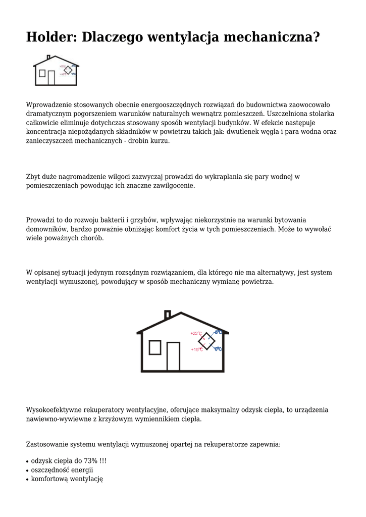 Holder: Dlaczego wentylacja mechaniczna? Wprowadzenie stosowanych obecnie energooszczędnych rozwiązań do budownictwa zaowocowało dramatycznym pogorszeniem warunków naturalnych wewnątrz pomieszczeń. Uszczelniona stolarka całkowicie eliminuje dotychczas stosowany sposób wentylacji budynków. W efekcie następuje koncentracja niepożądanych składników w powietrzu takich jak: dwutlenek węgla i para wodna oraz zanieczyszczeń mechanicznych - drobin kurzu. Zbyt duże nagromadzenie wilgoci zazwyczaj prowadzi do wykraplania się pary wodnej w pomieszczeniach powodując ich znaczne zawilgocenie. Prowadzi to do rozwoju bakterii i grzybów, wpływając niekorzystnie na warunki bytowania domowników, bardzo poważnie obniżając komfort życia w tych pomieszczeniach. Może to wywołać wiele poważnych chorób. W opisanej sytuacji jedynym rozsądnym rozwiązaniem, dla którego nie ma alternatywy, jest system wentylacji wymuszonej, powodujący w sposób mechaniczny wymianę powietrza. Wysokoefektywne rekuperatory wentylacyjne, oferujące maksymalny odzysk ciepła, to urządzenia nawiewno-wywiewne z krzyżowym wymiennikiem ciepła. Zastosowanie systemu wentylacji wymuszonej opartej na rekuperatorze zapewnia: ● ● ● odzysk ciepła do 73% !!! oszczędność energii komfortową wentylację ● ● eliminację zawilgocenia pomieszczeń wywołującego rozwój grzybów i pleśni filtrację nawiewanego powietrza z kurzu i pyłków wywołujących alergie. W związku z tym zalecane w walce z astmą! Rekuperatory - zalety ● ● ● ● ● ● niskie zużycie energii elektrycznej, maksymalny odzysk ciepła (do 92%,(rekuperator duo) dzięki nowatorskiej budowie wymiennika, chronionej w urzędzie patentowym RP), niewielka waga, wyjątkowo cicha praca ( w połączeniu z modułami tłumików), możliwość zabudowy w pozycji podwieszonej pod sufitem (dla central w wersji leżącej). Rekuperatory- cechy dodatkowe: ● ● ● Wszystkie rekuperatory są wygłuszone akustycznie, posiadają układ przeciwzamrożeniowy zabezpieczający rekuperator przed zamarzaniem. Sterowanie rekuperatorami realizowane jest przez regulator manualny lub procesorowy sterownik montowany na ścianie w wybranym pomieszczeniu. W celu zapewnienia maksymalnie cichej pracy całego systemu wentylacyjnego zaleca się użycie kanałów tłumiących (ocieplonych i wygłuszonych wełną mineralną) . Przykładowe wyliczenie oszczędności uzyskanych przy zastosowaniu systemu wentylacji wymuszonej z centralą rekuperacyjną: Dla domu o powierzchni 160 m2 zalecana jest wymiana powietrza 250 m3/godz. W trakcie trwania sezonu grzewczego o długości ok. 200 dni zaoszczędzimy 6100 kWh energii. Przy założeniu kosztu 1kWh na poziomie 0,37 zł, rocznie zaoszczędzimy: 2300 zł. - przy ogrzewaniu elektrycznym lub zaoszczędzimy np. 1000 litrów gazu - przy ogrzewaniu gazowym. PORÓWNANIE KOSZTÓW WYKONANIA WENTYLACJI GRAWITACYJNEJ I WENTYLACJI Z ODZYSKIEM CIEPŁA Wentylacja grawitacyjna Koszt Wentylacja z odzyskiem ciepła Koszt Koszt wykonania komina z kilkoma kanałami wentylacyjnymi, z obróbką blacharską i wykończeniem jego górnej części klinkierem 4 800 zł Koszt wykonania kompletnej instalacji z wykonaniem niezbędnych przekuć, materiałami: kanałami elastycznymi, trójnikami 45°, łącznikami, przepustnicami, czerpnią, wyrzutnią, materiałami montażowymi, stalowymi anemostatami, instalacją odprowadzenia skroplin,sterowaniem, oraz montażem całego systemu w domu o kubaturze około 400m3 5 700 zł Mikrowentylacja w 4 sztukach okien połaciowych bez recyrkulacji 1 000 zł Rezygnacja z niepotrzebnej, (wręcz zabronionej) w przypadku zastosowania odzysk ciepła z rekuperatora, mikrowentylacji. Koszt rekuperatora dla tego przykładu MISTRAL 300 z kompletnym wyposażeniem (filtry, wkład letni, sterowanie) 3 900 zł Mikrowentylacja(nawiewniki)w oknach i drzwiach balkonowych 1 200 zł n.d. 0 zł Dachowe kominki wentylacyjne - 2 szt. Koszt kominków z montażem kanału prowadzącego z parteru z recyrkulacją 500 zł n.d. 0 zł Razem średni koszt 7 500 zł Razem średni koszt 9600 zł UWAGA: Wentylacja z odzyskiem ciepła jest efektywna i szybko zwraca się w eksploatacji. Wentylacja grawitacyjna jest nieefektywna , a jeżeli już działa to w czasie eksploatacji kosztuje tym więcej im droższe jest paliwo jakie używamy do ogrzania domu. Tabelę opracowano na podstawie informacji firmy VENTUS Coraz częściej słyszy się głosy inwestorów i użytkowników, którzy twierdzą, że za dużo płacą za ogrzewanie swoich domów. Pojawiła się konieczność wykonywania analizy energochłonności budynku. W krajach UE wprowadzono konieczność etykietowania budynku, a co zatem idzie i wykonywania certyfikacji energetycznej budynków. Certyfikat energetyczny budynku to dokument, który określa klasę energochłonności budynku. Informacja ta pozwala oszacować w prosty sposób ile będzie kosztować ogrzewanie budynku w standardowym sezonie grzewczym. Dla przykładu dla 100 m2 domu jednorodzinnego ogrzewanego prądem z klasy A, czyli niskoenergetyczny wskaźnik E wynosi od 20 do 45 kWh/m2 rok , przyjęto do obliczeń 45 kWh/m2 rok, koszt ogrzewania wyniósłby: 100 x 45 x średnio I i II taryfa 0,14 zł/kWh = 630 zł za rok, a dla budynku klasy C- średnio energooszczędny koszty ogrzewania wyniosą 100 x 150 x 0,14 = 2 100 zł za rok. Dla budynku Klasy E- energochłonny 100 x 250 x 0,14 = 3 500 zł za rok. Warto więc wiedzieć, czy budynek jest energooszczędny czy energochłonny, zwłaszcza, że koszt domu jest znacznie większy niż koszt pralki lub lodówki. Klasyfikacja energetyczna budynkówwg Stowarzyszenia na rzecz Zrównoważonego Rozwoju Z punktu widzenia inwestora energochłonność budynku jest jedną z najważniejszych informacji koniecznych przy podejmowaniu decyzji o zakupie domu lub mieszkania. Znajomość energochłonności budynku pozwala oszacować jakie będą średnie koszty ogrzewania. Czasami warto zap