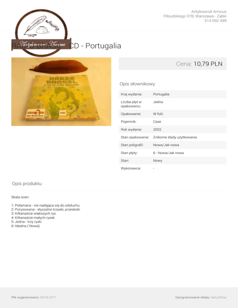 Antykwariat Amicus Piłsudskiego 37B, Warszawa - Ząbki 514 092 499 RADIO BRASIL - CD - Portugalia Cena: 10,79 PLN Opis słownikowy Kraj wydania: Portugalia Liczba płyt w opakowaniu: Jedna Opakowanie: W folii Pojemnik: Case Rok wydania: 2002 Stan opakowania: Znikome ślady użytkowania Stan poligrafii: Nowa/Jak nowa Stan płyty: 6 - Nowa/Jak nowa Stan: Nowy Wykonawca: - Opis produktu Skala ocen: 1: Połamana - nie nadająca się do odsłuchu 2: Porysowana - słyszalne trzaski, przeskoki 3: Kilkanaście większych rys 4: Kilkanaście małych rysek 5: Jedna - trzy ryski 6: Idealna ( Nowa) Plik wygenerowano: 09-03-2017 Oprogramowanie sklepu: AptusShop Antykwariat Amicus Piłsudskiego 37B, Warszawa - Ząbki 514 092 499 Galeria Plik wygenerowano: 09-03-2017 Powered by TCPDF (www.tcpdf.org) Oprogramowanie sklepu: AptusShop