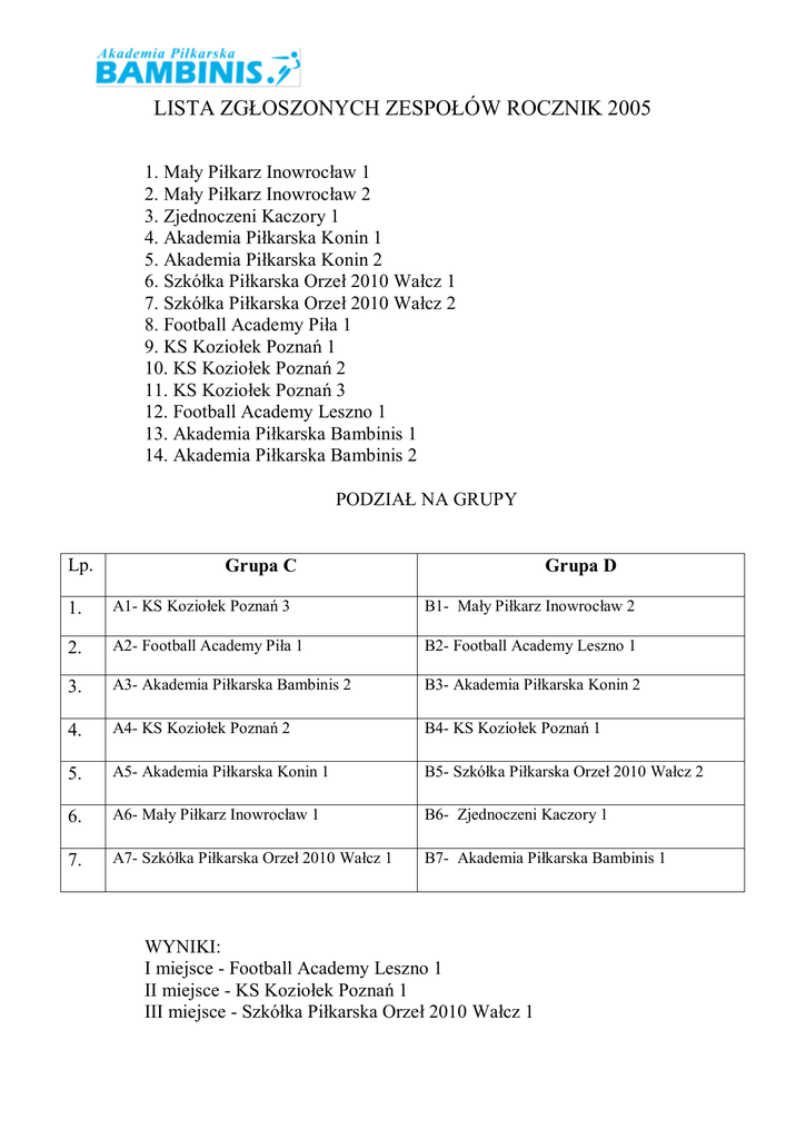 LISTA ZGŁOSZONYCH ZESPOŁÓW ROCZNIK 2005 1. Mały Piłkarz Inowrocław 1 2. Mały Piłkarz Inowrocław 2 3. Zjednoczeni Kaczory 1 4. Akademia Piłkarska Konin 1 5. Akademia Piłkarska Konin 2 6. Szkółka Piłkarska Orzeł 2010 Wałcz 1 7. Szkółka Piłkarska Orzeł 2010 Wałcz 2 8. Football Academy Piła 1 9. KS Koziołek Poznań 1 10. KS Koziołek Poznań 2 11. KS Koziołek Poznań 3 12. Football Academy Leszno 1 13. Akademia Piłkarska Bambinis 1 14. Akademia Piłkarska Bambinis 2 PODZIAŁ NA GRUPY Lp. Grupa C Grupa D 1. A1- KS Koziołek Poznań 3 B1- Mały Piłkarz Inowrocław 2 2. A2- Football Academy Piła 1 B2- Football Academy Leszno 1 3. A3- Akademia Piłkarska Bambinis 2 B3- Akademia Piłkarska Konin 2 4. A4- KS Koziołek Poznań 2 B4- KS Koziołek Poznań 1 5. A5- Akademia Piłkarska Konin 1 B5- Szkółka Piłkarska Orzeł 2010 Wałcz 2 6. A6- Mały Piłkarz Inowrocław 1 B6- Zjednoczeni Kaczory 1 7. A7- Szkółka Piłkarska Orzeł 2010 Wałcz 1 B7- Akademia Piłkarska Bambinis 1 WYNIKI: I miejsce - Football Academy Leszno 1 II miejsce - KS Koziołek Poznań 1 III miejsce - Szkółka Piłkarska Orzeł 2010 Wałcz 1