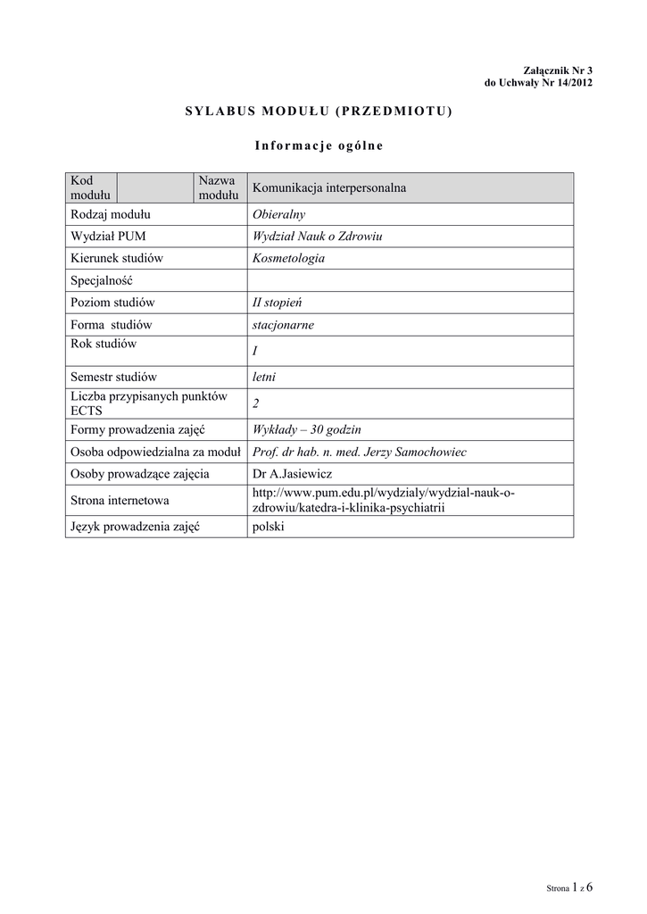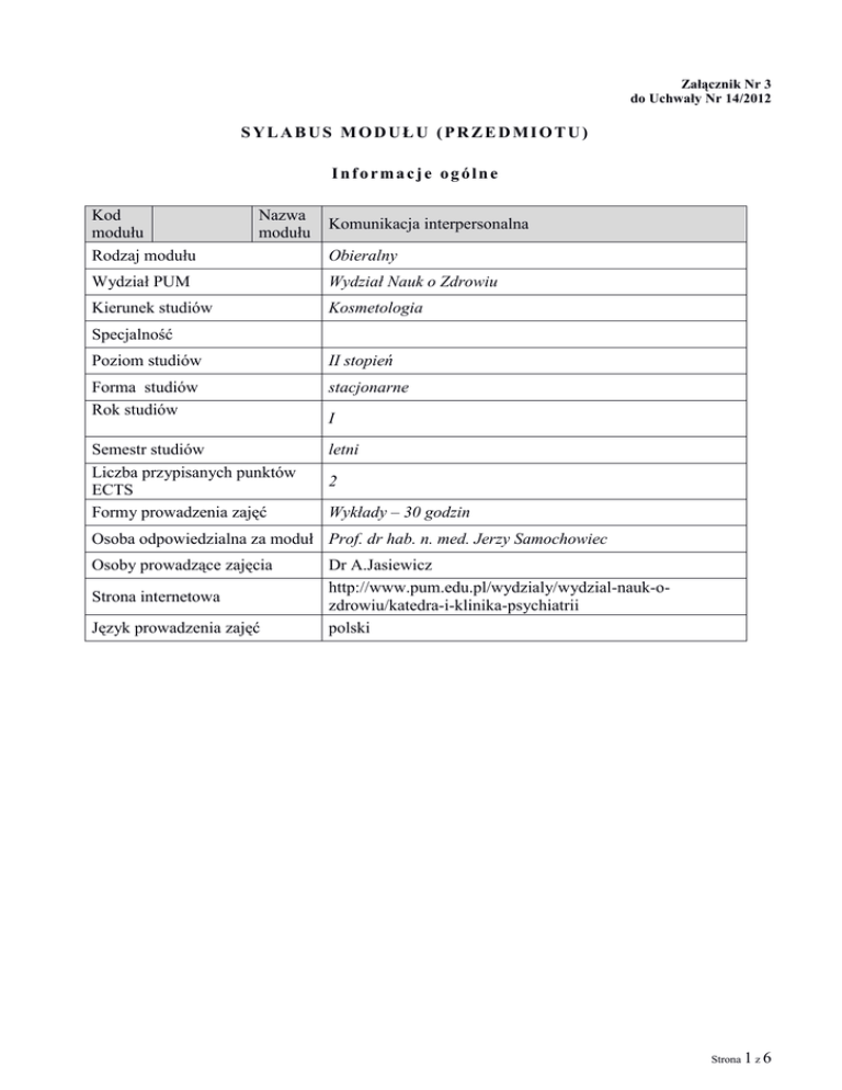Załącznik Nr 3 do Uchwały Nr 14/2012 SYLABUS MODUŁU (PRZEDMIOTU) Informacje ogólne Kod modułu Rodzaj modułu Nazwa modułu Komunikacja interpersonalna Obieralny Wydział PUM Wydział Nauk o Zdrowiu Kierunek studiów Kosmetologia Specjalność Poziom studiów II stopień Forma studiów Rok studiów stacjonarne Semestr studiów Liczba przypisanych punktów ECTS Formy prowadzenia zajęć letni I 2 Wykłady – 30 godzin Osoba odpowiedzialna za moduł Prof. dr hab. n. med. Jerzy Samochowiec Osoby prowadzące zajęcia Strona internetowa Język prowadzenia zajęć Dr A.Jasiewicz http://www.pum.edu.pl/wydzialy/wydzial-nauk-ozdrowiu/katedra-i-klinika-psychiatrii polski Strona 1 z 6 Informacje szczegółowe Cele modułu Wiedzy Wymagania wstępne w zakresie Umiejętności Kompetencji społecznych zapoznanie studentów z problematyką komunikacji interpersonalnej, jako jednej z ważniejszych kompetencji osobistych ćwiczenie niezbędnych umiejętności do prawidłowej komunikacji interpersonalnej uwrażliwienie na potrzeby i problemy drugiego człowieka oraz poznanie własnych możliwości osobowościowych pomocnych w komunikacji interpersonalnej wiedza o podstawowych jednostkach i zespołach chorobowych z zakresu poszczególnych układów człowieka podstawową wiedza ogólną o funkcjonowaniu psychologicznym człowieka podstawowa wiedza z zakresu etyki umiejętność aktywnego słuchania umiejętność prowadzenia dyskusji umiejętność pracy w zespole realizowania stawianych wymagań kultura osobista Opis efektów kształcenia dla modułu (przedmiotu) numer Student, który zaliczył moduł SYMBOL efektu (przedmiot) (odniesienie do) kształcenia wie/umie/potrafi: EKK Potrafi definiować podstawowe W01 pojęcia z zakresu komunikacji K_W25 społecznej. Stosuje poznane metody i techniki do rozwiązywania określonych U01 K_U012 problemów związanych z porozumiewaniem się. U02 K01 K02 Posiada umiejętność zastosowania nabytej wiedzy na płaszczyźnie interpersonalnej, np. w pracy w grupie. Zna poziom własnych kompetencji oraz swoje ograniczenia w wykonywaniu zadań zawodowych. Rozpoznaje problemy, które są poza zakresem jego/jej kompetencji i wie do kogo zwrócić się o pomoc, z uwzględnieniem umiejętności Sposób weryfikacji efektów kształcenia (forma zaliczeń) Zaliczenie w formie testu Zaliczenie w formie testu K_U08 Zaliczenie w formie testu K_K01 Zaliczenie w formie testu K_K02 Zaliczenie w formie testu Strona 2 z 6 K03 współpracy w zespole interdyscyplinarnym. Przejawia szacunek wobec pacjenta/klienta i zrozumienie jego trudności. Zaliczenie w formie testu K_K03 Macierz efektów kształcenia dla modułu (przedmiotu) w odniesieniu do form zajęć K_W024 K_U012 K_U08 K_K01 K_K02 K_K04 Symbol modułu lub Student, który zaliczył moduł (przedmiot) wie/umie/potrafi: Potrafi definiować podstawowe pojęcia z zakresu komunikacji społecznej. Stosuje poznane metody i techniki do rozwiązywania określonych problemów związanych z porozumiewaniem się. Posiada umiejętność zastosowania nabytej wiedzy na płaszczyźnie interpersonalnej, np. w pracy w grupie. Zna poziom własnych kompetencji oraz swoje ograniczenia w wykonywaniu zadań zawodowych. Rozpoznaje problemy, które są poza zakresem jego/jej kompetencji i wie do kogo zwrócić się o pomoc, z uwzględnieniem umiejętności współpracy w zespole interdyscyplinarnym. Przejawia szacunek wobec pacjenta/klienta i zrozumienie jego trudności. Forma zajęć dydaktycznych Wykł Zajęc ad ia semin Ćw. aryjn labor e Ćw. at. proje Ćwic ktow zenia e klinic Ćwic zne Zajęc zenia ia prakt inne yczne ... numer efektu kształcenia X X X X X X Treść modułu (przedmiotu) kształcenia Symbol treści Opis treści kształcenia kształcenia Wprowadzenie do komunikacji TK01 interpersonalnej. Odniesienie do efektów kształcenia dla modułu TK02 K_W025 K_U012 K_U08 K_K01 K_K02 Komunikacja werbalna. K_W25 Strona 3 z 6 TK03 Komunikacja niewerbalna. TK04 Umiejętność słuchania. TK05 Choroba jako sytuacja trudna. Komunikacja terapeutyczna z pacjentem. Błędy jatrogenne. TK06 Komunikowanie się z chorym psychicznie. TK07 Psychomanipulacja. TK08 Kwadratowy dialog. TK09 Psychologia perswazji. TK09 Asertywność. TK10 Analiza transakcyjna K_W025 K_U012 K_U08 K_K01 K_K02 K_W025 K_U012 K_U08 K_K04 K_W025 K_U012 K_U08 K_K01 K_K04 K_W025 K_U012 K_U08 K_K01 K_K04 K_W025 K_U012 K_U08 K_K01 K_K02 K_K04 K_W025 K_U012 K_U08 K_K01 K_K02 K_K04 K_W025 K_U012 K_U08 K_K01 K_K02 K_K04 K_W025 K_U012 K_U08 K_K01 K_K02 K_K04 K_W025 K_U012 K_U08 K_K01 K_K02 K_K04 Strona 4 z 6 TK11 TK12 TK13 TK14 Procesy interpersonalne w grupie. K_W025 K_U012 K_U08 K_K01 K_K02 K_K04 Konflikty. K_W025 K_U012 K_U08 K_K01 K_K02 K_K04 Przemawianie publiczne. K_W025 K_U012 K_U08 K_K01 K_K02 K_K04 Psychologia kłamstwa. K_W025 K_U012 K_U08 K_K01 K_K02 K_K04 Piśmiennictwo i pomoce naukowe 1. Tokarz M.: Argumentacja. Perswazja. Manipulacja. Wykłady z teorii komunikacji, GWP, Gdańsk 2010 2. Ford M: Jak rozmawiać z pacjentem, GWP, Gdańsk 2001 3. Berne E.: W co grają ludzie, psychologia stosunków międzyludzkich, PWN, Warszawa 2008 4. Wilczek-Rużyczka E.: Komunikowanie się z chorym psychicznie, Czelej, Lublin 2007 5. McKay M.: Sztuka skutecznego porozumiewania się. GWP. Gdańsk 2001 6. Alberti R.: Asertywność. GWP. Gdańsk 2004 Nakład pracy studenta (bilans punktów ECTS) Forma nakładu pracy studenta (udział w zajęciach, aktywność, przygotowanie sprawozdania, itp.) Obciążenie studenta [h] Nauczyciel Godziny kontaktowe z nauczycielem 30 Przygotowanie do ćwiczeń 0 Czytanie wskazanej literatury 15 Student Średnia Strona 5 z 6 Napisanie raportu z laboratorium/przygotowanie projektu Przygotowanie do zaliczenia Inne 0 10 0 Sumaryczne obciążenie pracą studenta 55 Punkty ECTS za moduł 2 Uwagi Metody oceniania np.: E – egzamin – rozwiązanie problemu S – sprawdzenie umiejętności praktycznych R – raport D – dyskusja wyników P – prezentacja Inne – Stro