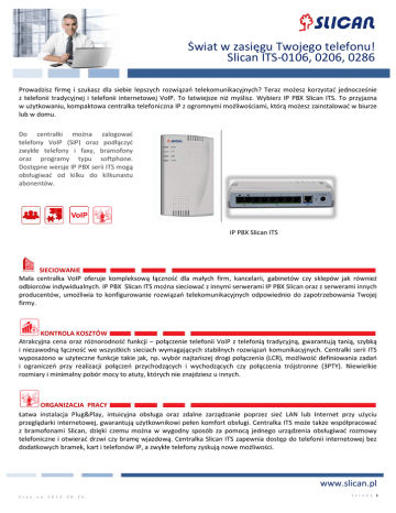 Świat w zasięgu Twojego telefonu! Slican ITS-0106, 0206, 0286 Prowadzisz firmę i szukasz dla siebie lepszych rozwiązań telekomunikacyjnych? Teraz możesz korzystać jednocześnie z telefonii tradycyjnej i telefonii internetowej VoIP. To łatwiejsze niż myślisz. Wybierz IP PBX Slican ITS. To przyjazna w użytkowaniu, kompaktowa centralka telefoniczna IP z ogromnymi możliwościami, którą możesz zainstalować w biurze lub w domu. Do centralki można zalogować telefony VoIP (SIP) oraz podłączyć zwykłe telefony i faxy, bramofony oraz programy typu softphone. Dostępne wersje IP PBX serii ITS mogą obsługiwać od kilku do kilkunastu abonentów. IP PBX Slican ITS SIECIOWANIE Mała centralka VoIP oferuje kompleksową łączność dla małych firm, kancelarii, gabinetów czy sklepów jak również odbiorców indywidualnych. IP PBX Slican ITS można sieciować z innymi serwerami IP PBX Slican oraz z serwerami innych producentów, umożliwia to konfigurowanie rozwiązań telekomunikacyjnych odpowiednio do zapotrzebowania Twojej firmy. KONTROLA KOSZTÓW Atrakcyjna cena oraz różnorodność funkcji – połączenie telefonii VoIP z telefonią tradycyjną, gwarantują tanią, szybką i niezawodną łączność we wszystkich sieciach wymagających stabilnych rozwiązań komunikacyjnych. Centralki serii ITS wyposażono w użyteczne funkcje takie jak, np. wybór najtańszej drogi połączenia (LCR), możliwość definiowania zadań i ograniczeń przy realizacji połączeń przychodzących i wychodzących czy połączenia trójstronne (3PTY). Niewielkie rozmiary i minimalny pobór mocy to atuty, których nie znajdziesz u innych. ORGANIZACJA PRACY Łatwa instalacja Plug&Play, intuicyjna obsługa oraz zdalne zarządzanie poprzez sieć LAN lub Internet przy użyciu przeglądarki internetowej, gwarantują użytkownikowi pełen komfort obsługi. Centralka ITS może także współpracować z bramofonami Slican, dzięki czemu można w wygodny sposób za pomocą jednego urządzenia obsługiwać rozmowy telefoniczne i otwierać drzwi czy bramę wjazdową. Centralka Slican ITS zapewnia dostęp do telefonii internetowej bez dodatkowych bramek, kart i telefonów IP, a zwykłe telefony zyskują nowe możliwości. www.slican.pl S t a n n a 2 0 1 3 . 0 8 . 2 6 . S t r o n a 1 Świat w zasięgu Twojego telefonu! Slican ITS-0106, 0206, 0286 Wyposażenie ITS-0106 ITS-0206 ITS-0286 Abonenci analogowi (FXS) 6 6 6 Linie miejskie (FXO) 1 2 2 Abonenci IP (IPS) 1 1 8 Linie IP (IPO) 2 2 6 Port Ethernet 10 /100 1 1 1 telefony analogowe Slican XL-2023ID oraz XL-209 Dostępne urządzenia współpracujące Slican telefony Slican SIP VPS-2000P, VPS-310P bramofon Slican DPH Obsługiwane protokoły Parametry VoIP Współpraca z innymi aplikacjami / urządzeniami Tryb pracy Zasilanie SIP 2.0 (kodek G.711) SIP 2.0 (kodeki G.711, G.729) aplikacje komputerowe typu „softphone” lub sprzętowy telefon IP, bramy VoIP (SIP 2.0) klient lub / i serwer VoIP ~230 V; 50 Hz < 15 VA (zasilacz zewnętrzny 12 V / 1,2A) Wymiary (mm) szerokość x wysokość x głębokość 191 x 111 x 36 Technologia PURE-IP FUNKCJONALNOŚĆ • łatwa instalacja Plug&Play • 3 zapowiedzi słowne DISA (możliwość nagrywania własnych zapowiedzi) • zdalne zarządzanie centralką przez przeglądarkę internetową • melodia dla połączeń oczekujących MoH • aktualizacja oprogramowania przez Internet • różne rodzaje dzwonków dla połączeń wewnętrznych i miejskich • wybór najtańszej drogi połączenia – LCR • współpraca z operatorami VoIP • możliwość konfiguracji uprawnień (restrykcji) do realizacji • współpraca z bramofonami serii BRV, SKD i DPH połączeń wychodzących i przychodzących • możliwość odbioru połączeń z bramofonów BRV,SKD i DPH na telefonie GSM • przekazywanie rozmów • współpraca z telefonami / FAX-ami analogowymi • przekierowania rozmów – Call Forwarding • współpraca z telefonami zgodnymi z VoIP-SIP • dzwonienie grupy abonentów • wydruk historii połączeń • połączenia trójstronne – 3PTY • automatyczna zmiana trybów pracy centrali (dzień / noc) • prezentacja numeru CLIP • estetyczna obudowa do powieszenia na ścianie • zawieszenie połączeń HOLD • mały pobór mocy od 3W do 11W PRZYKŁADOWA KONFIGURACJA CENTRALKI Przedstawiony materiał jest materiałem informacyjno-poglądowym. W celu prawidłowego skonfigurowania serwera zalecamy kontakt i konsultacje z Dystrybutorem lub Autoryzowanym Partnerem Slican. www.slican.pl S t a n n a 2 0 1 3 . 0 8 . 2 6 . S t r o n a 2