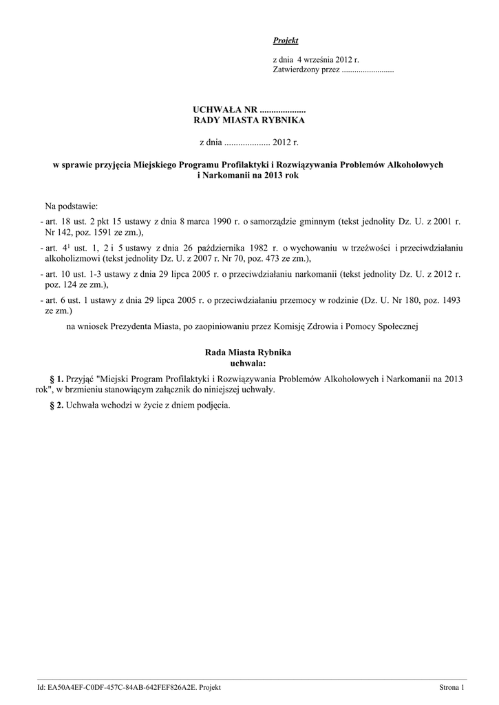 Projekt z dnia 4 września 2012 r. Zatwierdzony przez ......................... UCHWAŁA NR .................... RADY MIASTA RYBNIKA z dnia .................... 2012 r. w sprawie przyjęcia Miejskiego Programu Profilaktyki i Rozwiązywania Problemów Alkoholowych i Narkomanii na 2013 rok Na podstawie: - art. 18 ust. 2 pkt 15 ustawy z dnia 8 marca 1990 r. o samorządzie gminnym (tekst jednolity Dz. U. z 2001 r. Nr 142, poz. 1591 ze zm.), - art. 41 ust. 1, 2 i 5 ustawy z dnia 26 października 1982 r. o wychowaniu w trzeźwości i przeciwdziałaniu alkoholizmowi (tekst jednolity Dz. U. z 2007 r. Nr 70, poz. 473 ze zm.), - art. 10 ust. 1-3 ustawy z dnia 29 lipca 2005 r. o przeciwdziałaniu narkomanii (tekst jednolity Dz. U. z 2012 r. poz. 124 ze zm.), - art. 6 ust. 1 ustawy z dnia 29 lipca 2005 r. o przeciwdziałaniu przemocy w rodzinie (Dz. U. Nr 180, poz. 1493 ze zm.) na wniosek Prezydenta Miasta, po zaopiniowaniu przez Komisję Zdrowia i Pomocy Społecznej Rada Miasta Rybnika uchwala: § 1. Przyjąć "Miejski Program Profilaktyki i Rozwiązywania Problemów Alkoholowych i Narkomanii na 2013 rok", w brzmieniu stanowiącym załącznik do niniejszej uchwały. § 2. Uchwała wchodzi w życie z dniem podjęcia. ————————————————————————————————————————————————————————— Id: EA50A4EF-C0DF-457C-84AB-642FEF826A2E. Projekt Strona 1 Załącznik Nr 1 do Uchwały Nr .................... Rady Miasta Rybnika z dnia....................2012 r. Miejski Program Profilaktyki i Rozwiązywania Problemów Alkoholowych i Narkomanii na 2013 rok I. WPROWADZENIE. Miejski Program Profilaktyki i Rozwiązywania Problemów Alkoholowych i Narkomanii na 2013 rok, zwany dalej „programem”, jest programem operacyjnym Strategii Polityki Społecznej dla Miasta Rybnika na lata 2009-2015, przyjętej Uchwałą Nr 489/XXXV/2009 Rady Miasta Rybnika z dnia 21 stycznia 2009 r. Podstawę prawną opracowania programu stanowi: - art. 4 1 ust. 2 ustawy z dnia 26 października 1982 roku o wychowaniu w trzeźwości i przeciwdziałaniu alkoholizmowi (tekst jednolity Dz. U. z 2007 r. Nr 70, poz. 473 ze zm.), zgodnie z którym realizacja zadań, wskazanych w ust. 1 tego artykułu (tj. zwiększanie dostępności pomocy terapeutycznej i rehabilitacyjnej dla osób uzależnionych od alkoholu, udzielanie rodzinom, w których występują problemy alkoholowe, pomocy psychospołecznej i prawnej, a w szczególności ochrony przed przemocą w rodzinie, prowadzenie profilaktycznej działalności informacyjnej i edukacyjnej w zakresie rozwiązywania problemów alkoholowych i przeciwdziałania narkomanii, w szczególności dla dzieci i młodzieży, w tym prowadzenie pozalekcyjnych zajęć sportowych, a także działań na rzecz dożywiania dzieci uczestniczących w pozalekcyjnych programach opiekuńczowychowawczych i socjoterapeutycznych, wspomaganie działalności instytucji, stowarzyszeń i osób fizycznych, służącej rozwiązywaniu problemów alkoholowych, podejmowanie interwencji w związku z naruszeniem przepisów określonych w art. 131 i 15 tej ustawy oraz występowanie przed sądem w charakterze oskarżyciela publicznego, wspieranie zatrudnienia socjalnego poprzez organizowanie i finansowanie centrów integracji społecznej) jest prowadzona w postaci gminnego programu profilaktyki i rozwiązywania problemów alkoholowych; - art. 10 ust. 2 ustawy z dnia 29 lipca 2005 r. o przeciwdziałaniu narkomanii (tekst jednolity Dz. U. z 2012 r. poz. 124 ze zm.), zgodnie z którym organ wykonawczy gminy opracowuje projekt gminnego programu przeciwdziałania narkomanii, uwzględniając kierunki działań wynikające z Krajowego Programu Przeciwdziałania Narkomanii oraz zadania określone w art. 2 ust. 1 pkt 1-3 tej ustawy, tj. działalność wychowawczą, edukacyjną, informacyjną i zapobiegawczą, leczenie, rehabilitację i reintegrację osób uzależnionych oraz ograniczanie szkód zdrowotnych i społecznych. Zgodnie z ww. ustawami gminny program profilaktyki i rozwiązywania problemów alkoholowych oraz gminny program przeciwdziałania narkomanii, stanowią część gminnej strategii rozwiązywania problemów społecznych. Ponadto, zgodnie z art. 6 ust. 1 ustawy z dnia 29 lipca 2005 r. o przeciwdziałaniu przemocy w rodzinie (Dz. U. Nr 180, poz. 1493 ze zm.), zadania w zakresie przeciwdziałania przemocy w rodzinie są realizowane przez jednostki samorządu terytorialnego na zasadach określonych w przepisach ustawy z dnia 12 marca 2004 r. o pomocy społecznej (tekst jednolity Dz. U. z 2009 r. Nr 175, poz. 1362 ze zm.) lub ustawy o wychowaniu w trzeźwości i przeciwdziałaniu alkoholizmowi (…). Program uwzględnia rekomendacje zawarte w następujących dokumentach krajowych: 1) Narodowym Programie Zdrowia na lata 2007-2015, przyjętym Uchwałą Nr 90/2007 Rady Ministrów z dnia 15 maja 2007 r., 2) Narodowym Programie Profilaktyki i Rozwiązywania Problemów Alkoholowych na lata 2011-2015, przyjętym Uchwałą Nr 35/2011 Rady Ministrów z dnia 22 marca 2011 r., 3) Krajowym Programie Przeciwdziałania Narkomanii na lata 2011-2016, przyjętym Rozporządzeniem Rady Ministrów z dnia 22 marca 2011 r. (Dz. U. Nr 78, poz. 428), ————————————————————————————————————————————————————————— Id: EA50A4EF-C0DF-457C-84AB-642FEF826A2E. Projekt Strona 1 4) Krajowym Programie Przeciwdziałania Przemocy w Rodzinie, przyjętym Uchwałą Nr 162/2006 Rady Ministrów z dnia 25 września 2006 r., 5) Programie profilaktyki i rozwiązywania problemów alkoholowych w województwie śląskim na lata 2011-2015, przyjętym Uchwałą Nr IV/5/1/2011 Sejmiku Województwa Śląskiego z dnia 14 lutego 2011 r. Realizacja zadań programu jest finansowana ze środków pochodzących z dochodów z opłat pobieranych przez gminę Rybnik za zezwolenia na sprzedaż n