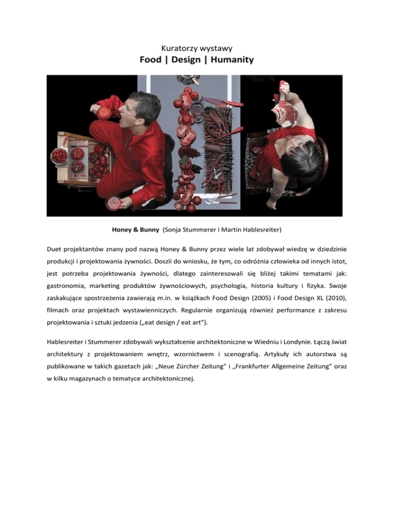 Kuratorzy wystawy Food | Design | Humanity Honey & Bunny (Sonja Stummerer i Martin Hablesreiter) Duet projektantów znany pod nazwą Honey & Bunny przez wiele lat zdobywał wiedzę w dziedzinie produkcji i projektowania żywności. Doszli do wniosku, że tym, co odróżnia człowieka od innych istot, jest potrzeba projektowania żywności, dlatego zainteresowali się bliżej takimi tematami jak: gastronomia, marketing produktów żywnościowych, psychologia, historia kultury i fizyka. Swoje zaskakujące spostrzeżenia zawierają m.in. w książkach Food Design (2005) i Food Design XL (2010), filmach oraz projektach wystawienniczych. Regularnie organizują również performance z zakresu projektowania i sztuki jedzenia („eat design / eat art”). Hablesreiter i Stummerer zdobywali wykształcenie architektoniczne w Wiedniu i Londynie. Łączą świat architektury z projektowaniem wnętrz, wzornictwem i scenografią. Artykuły ich autorstwa są publikowane w takich gazetach jak: „Neue Zürcher Zeitung” i „Frankfurter Allgemeine Zeitung” oraz w kilku magazynach o tematyce architektonicznej.