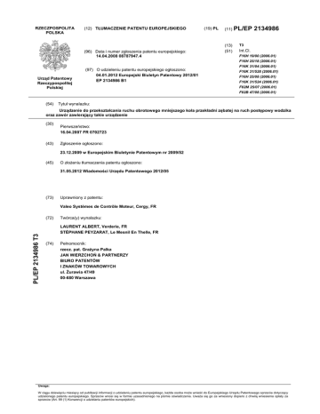 RZECZPOSPOLITA POLSKA (12) TŁUMACZENIE PATENTU EUROPEJSKIEGO (96) Data i numer zgłoszenia patentu europejskiego: 14.04.2008 08787947.4 (19) PL (11) PL/EP (13) (51) 2134986 T3 Int.Cl. F16H 19/00 (2006.01) F16H 25/18 (2006.01) Urząd Patentowy Rzeczypospolitej Polskiej (97) O udzieleniu patentu europejskiego ogłoszono: 04.01.2012 Europejski Biuletyn Patentowy 2012/01 EP 2134986 B1 F16K 31/04 (2006.01) F16K 31/528 (2006.01) F16H 25/08 (2006.01) F16K 31/524 (2006.01) F02M 25/07 (2006.01) F02B 47/08 (2006.01) (54) Tytuł wynalazku: Urządzenie do przekształcania ruchu obrotowego mniejszego koła przekładni zębatej na ruch postępowy wodzika oraz zawór zawierający takie urządzenie (30) (43) Pierwszeństwo: 16.04.2007 FR 0702723 Zgłoszenie ogłoszono: 23.12.2009 w Europejskim Biuletynie Patentowym nr 2009/52 (45) O złożeniu tłumaczenia patentu ogłoszono: 31.05.2012 Wiadomości Urzędu Patentowego 2012/05 (73) Uprawniony z patentu: Valeo Systèmes de Contrôle Moteur, Cergy, FR PL/EP 2134986 T3 (72) Twórca(y) wynalazku: LAURENT ALBERT, Verderie, FR STÉPHANE PEYZARAT, Le Mesnil En Thelle, FR (74) Pełnomocnik: rzecz. pat. Grażyna Palka JAN WIERZCHOŃ & PARTNERZY BIURO PATENTÓW I ZNAKÓW TOWAROWYCH ul. Żurawia 47/49 00-680 Warszawa Uwaga: W ciągu dziewięciu miesięcy od publikacji informacji o udzieleniu patentu europejskiego, każda osoba może wnieść do Europejskiego Urzędu Patentowego sprzeciw dotyczący udzielonego patentu europejskiego. Sprzeciw wnosi się w formie uzasadnionego na piśmie oświadczenia. Uważa się go za wniesiony dopiero z chwilą wniesienia opłaty za sprzeciw (Art. 99 (1) Konwencji o udzielaniu patentów europejskich). 13984/12/P-RO/GP/KM EP 2 134 986 Urządzenie do przekształcania ruchu obrotowego mniejszego koła przekładni zębatej na ruch postępowy wodzika oraz zawór zawierający takie urządzenie Opis [0001] Wynalazek dotyczy urządzenia do przekształcania ruchu obrotowego mniejszego koła przekładni zębatej na ruch postępowy wodzika według zastrzeżenia 1 oraz zawór według zastrzeżenia 10, zawierający takie urządzenie. Zawór tego typu znajduje zastosowanie na przykład w obwodzie recyrkulacji spalin silnika cieplnego pojazdu mechanicznego. EP1040266 opisuje urządzenie według części wstępnej zastrzeżenia 1. Tło wynalazku [0002] Taki zawór ma zwykle korpus, w którym jest zamontowana przesuwnie klapka połączona z mniejszym kołem przekładni zębatej na wyjściu silnika obrotowego, poprzez urządzenie do przekształcania ruchu obrotowego mniejszego koła przekładni zębatej, zazębiającego się z mniejszym kołem przekładni zębatej na wyjściu, na ruch postępowy wodzika połączonego z klapką i zamontowanego przesuwnie w korpusie za pomocą tulei prowadzącej. Mniejsze koło przekładni zębatej jest zamontowane obrotowo względem elementu wspierającego wodzik, zawierającego ściankę rurową zamontowaną na stałe w korpusie. Ścianka rurowa jest wyposażona w powierzchnie krzywkowe, współdziałające każda z rolką wodzącą, zamontowaną na elemencie wspierającym, który z jednej strony jest wprawiany w ruch obrotowy za pomocą widełek mimośrodowych, połączonych sztywno, przy obrotach mniejszego koła przekładni zębatej i który, z drugiej strony, jest zamontowany tak, by obracać się na jednym końcu wodzika. Element wspierający jest zatem wprawiany w ruch obrotowy przez mniejsze koło przekładni zębatej, powodując przemieszczenie się rolek wzdłuż powierzchni krzywkowych, zbudowanych tak, by przemieszczać ruchem postępowym element wspierający, który pociąga za sobą wodzik i klapkę. [0003] Mniejsze koło przekładni zębatej jest połączone sztywno z jednego końca z osią mającą koniec przeciwny, z którym są sztywno połączone widełki wprawiające w ruch obrotowy element wspierający. Oś jest wprowadzana ruchem obrotowym do obracającej się tulei prowadzącej, zamontowanej na siłę na płytce zamocowanej do korpusu. Prawidłowe działanie i trwałość czasowa zaworu oraz urządzenia do przekształcania wymagają dokładnego ustawienia względnego korpusu, klapki, ścianki rurowej, płytki, tulei prowadzących, osi, mniejszego koła przekładni zębatej i widełek, by zapobiec przedwczesnemu zużywaniu się całości lub części tych składników. Uzyskanie wymaganej dokładności ustawienia powoduje, że montaż i obróbka składników jest stosunkowo droga. Przedmiot wynalazku [0004] Celem wynalazku jest zredukowanie ograniczeń montażowych względem urządzenia do przekształcania ruchu dla obniżenia kosztu wyrobów, w których może być ono zainstalowane. -2- Streszczenie wynalazku [0005] W tym celu przewiduje się urządzenie do przekształcania ruchu obrotowego mniejszego koła przekładni zębatej na ruch postępowy wodzika, które to urządzenie zawiera element wspierający wodzik i element wspierający, połączony z mniejszym kołem przekładni zębatej w ruchu obrotowym i połączony z wodzikiem w ruchu postępowym, przy czym mniejsze koło przekładni zębatej jest zamontowane obrotowo względem elementu wspierającego, który zawiera stałą ściankę rurową, a ścianka rurowa jest wyposażona w co najmniej jedną powierzchnię krzywkową, współpracującą z rolką wodzącą, zamontowaną na elemencie wspierającym, przy czym mniejsze koło przekładni zębatej jest unoszone przez element wspierający współosiowo ze ścianką rurową. [0006] Zatem mniejsze koło przekładni zębatej jest zamontowane bezpośrednio na elemencie wspierającym bez pośrednictwa płytki. Ustawienie względem siebie mniejszego koła przekładni zębatej i elementu wspierającego jest ułatwione. [0007] Według korzystnego wykonania, element wspierający zawiera ośkę współosiową ze ścianką rurową i na której jest zamontowane mniejsze koło przekładni zębatej oraz korzystnie element wspierający ma kształt dzwonu, którego dno jest sztywno połączone z ośką, a d