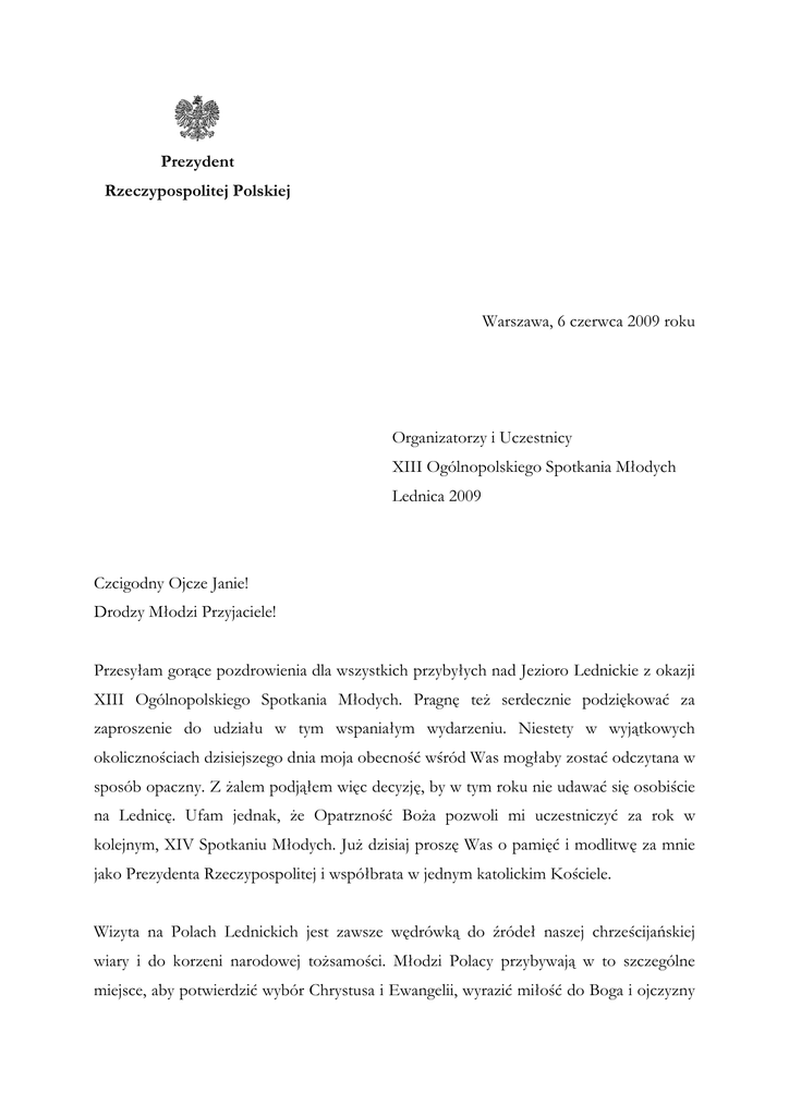 Prezydent Rzeczypospolitej Polskiej Warszawa, 6 czerwca 2009 roku Organizatorzy i Uczestnicy XIII Ogólnopolskiego Spotkania Młodych Lednica 2009 Czcigodny Ojcze Janie! Drodzy Młodzi Przyjaciele! Przesyłam gorące pozdrowienia dla wszystkich przybyłych nad Jezioro Lednickie z okazji XIII Ogólnopolskiego Spotkania Młodych. Pragnę teŜ serdecznie podziękować za zaproszenie do udziału w tym wspaniałym wydarzeniu. Niestety w wyjątkowych okolicznościach dzisiejszego dnia moja obecność wśród Was mogłaby zostać odczytana w sposób opaczny. Z Ŝalem podjąłem więc decyzję, by w tym roku nie udawać się osobiście na Lednicę. Ufam jednak, Ŝe Opatrzność BoŜa pozwoli mi uczestniczyć za rok w kolejnym, XIV Spotkaniu Młodych. JuŜ dzisiaj proszę Was o pamięć i modlitwę za mnie jako Prezydenta Rzeczypospolitej i współbrata w jednym katolickim Kościele. Wizyta na Polach Lednickich jest zawsze wędrówką do źródeł naszej chrześcijańskiej wiary i do korzeni narodowej toŜsamości. Młodzi Polacy przybywają w to szczególne miejsce, aby potwierdzić wybór Chrystusa i Ewangelii, wyrazić miłość do Boga i ojczyzny oraz podjąć dziedzictwo minionych pokoleń. Ta pielgrzymka do wód chrzcielnych Polski daje umocnienie dzięki poczuciu wspólnoty z wyznającymi podobne wartości rówieśnikami. Młodzi ludzie pragnący zachować katolicką wiarę i Ŝyć według jej zasad doświadczają niekiedy odrzucenia ze strony środowisk nastawionych do Ŝycia bardziej liberalnie i konsumpcyjnie. PrzeŜywając te niełatwe momenty w swoim dopiero rozpoczynającym się dojrzałym Ŝyciu, pamiętajcie, Ŝe moŜecie zawsze powracać do przesłania, jakie pozostawił nam nasz umiłowany rodak, Jan Paweł II. Musicie od siebie wymagać, nawet gdyby inni od was nie wymagali – wzywał Ojciec Święty w roku 1983, kiedy podczas drugiej pielgrzymki do ojczyzny spotkał się z młodzieŜą w Częstochowie. A nawiązując do słów Apelu Jasnogórskiego, mówił: Czuwam – to znaczy takŜe: czuję się odpowiedzialny za to wielkie, wspólne dziedzictwo, któremu na imię Polska. To imię nas wszystkich określa. To imię nas wszystkich zobowiązuje. To imię nas wszystkich kosztuje. Ówcześni słuchacze papieŜa Polaka byli Waszymi rówieśnikami. Być moŜe byli wśród nich rodzice kogoś z dzisiejszych ledniczan, minęło wszak juŜ dwadzieścia sześć lat. Nauka ta była dla nich drogowskazem w drodze przez cięŜką dekadę lat osiemdziesiątych, kiedy słabnąca władza komunistyczna represjonowała takŜe niepokornych uczniów i studentów. W tych dniach obchodzimy 20-lecie pokojowo wywalczonej polskiej wolności. Ale ta wspaniała przestrzeń moŜliwości, jaką jest własne suwerenne państwo, wymaga zawsze zagospodarowania przez najaktywniejsze grupy społeczne. RównieŜ Wasze pokolenie wkrótce będzie kształtować oblicze Rzeczypospolitej w wieku XXI. JuŜ za chwilę wylecimy z gniazda – śpiewacie w pieśni będącej swoistym znakiem rozpoznawczym i hymnem młodzieŜy lednickiej. śyczę Wam, by ten Wasz lot był długi i jak najpiękniejszy. Jestem przekonany, Ŝe pozostaniecie wierni chrześcijańskiej Dobrej Nowinie oraz rodzimej kulturze i toŜsamości polskiej. Są one naszym skarbem, który wnosimy do europejskiej wspólnoty. Jednocząc się z innymi narodami, nie moŜemy zapominać, kim sami jesteśmy. Pozostajemy dumni z naszej polskiej historii i dziedzictwa. Tradycją spotkań lednickich jest obdarowywanie Was, młodzi, przez Ojca Jana licznymi pamiątkami, które jeszcze długo potem przypominają o tym, co tutaj przeŜyliście. Niech i mnie będzie wolno coś ofiarować Wam wszystkim. Na ręce Ojca Jana przekazuję zatem w darze kielich mszalny, na którym znajduje się wizerunek Orła Białego – od tysiąca lat stanowiącego godło naszego państwa, które w tym miejscu właśnie rodziło się z chrzcielnej wody do dziejowego trwania. Niech ten wizerunek przypomina Wam zawsze, Ŝe (...) orły to wolne ptaki, bo szybują wysoko. I niech umacnia Was na bliski juŜ lot w dorosłe Ŝycie. Lech Kaczyński