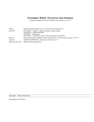 Przedmiar Robót Pyrzowice Szk-Stolarka Wymiana Stolarki Drzwiowej i Okiennej wg. projekt nr 3/171/12 Obiekt Kod CPV Budowa Inwestor Biuro kosztorysowe Sporządził Budynek Szkoły Podstawowej w Pyrzowicach ul.Wolności 46 45111000-8 - Roboty w zakresie burzenia, roboty ziemne 45262500-6 - Roboty murarskie 45410000 - Tynkowanie 45421100-5 - Instalowanie drzwi i okien i podobnych elementów Termomodernizacja Budynku Szkoły Podstawowej w Pyrzowicach wg. proj. 3/171/12 GMINA OśAROWICE , OŜarowice ul.Dworcowa 15 SIGMA BoŜena Jakimowicz BoŜena Jakimowicz Świętochłowice XII.2012 r SIGMA BJ Przedmiar Robót Budynek Szkoły Podstawowej w Pyrzowicach ul.Wolności 46 Nr Podstawa Opis robót 1 WYMIANA STOLARKI OKIENNEJ- wg. projektu ,SST 00 .01 - 45111000-8, SST 00.02 - 45262500-6, SST 00.03- 45410000 i SST 00.05 -45421100-5 1 KNR 4-01 Rozbiórka obróbek blacharskich murów ogniowych, okapów, kołnierzy, gzymsów itp. z 0535/08 blachy nie nadającej się do uŜytku- ANALOGIA paraprtów zewnętrznych z blachy stalowej 0,25 * (1,6 *44 + 0,7 + 0,9 * 3) razem 2 KNR 4-01 Wykucie z muru podokienników betonowych z lastryko 0354/12 1,6 razem 3 KNR 4-01 Wykucie z muru ościeŜnic stalowych lub krat okiennych o powierzchni ponad 2m20354/08 ANALOGIA krat stalowych na oknach 1,7 * 1,5 * 3 razem 4 KNR 4-01 Wykucie z muru ościeŜnic stalowych lub krat okiennych o powierzchni do 1m20354/06 ANALOGIA balustrady w oknie 5 KNR 2-02 Balustrady okienne proste z pochwytem stalowym- balustrada z demontaŜu 1209/04 6 KNR 0-19 MontaŜ okien rozwieranych i uchylno-rozwieranych jednodzielnych o powierzchni do 1023/05 1,0m2- ANALOGIA demontaŜ , R=0,3 M=0 S=0,3 0,6 * 0,9 + 0,9 * 0,66 * 1 razem KNR 0-19 MontaŜ okien rozwieranych i uchylno-rozwieranych dwudzielnych o powierzchni do 1022/08 1,5m2- ANALOGIA demontaŜ okien z PCV R=0,3 M=0 S=0,3 0,86 * 0,56 * 3 razem KNR 0-19 MontaŜ okien rozwieranych i uchylno-rozwieranych dwudzielnych o powierzchni do 1022/10 2,5m2- ANALOGIA demontaŜ okien z PCV R=0,3 M=0 S=0,3 1,46 * 1,64 * 44 razem KNR 0-19 Wymiana okien skrzynkowych rozwieranych i uchylno-rozwieranych dwudzielnych na 0930/08 okna z PCW o powierzchni do 1,5m2 - okno O2 - 2 szt. 1,46 * 0,8 * 2 razem KNR 0-19 Wymiana okien skrzynkowych rozwieranych i uchylno-rozwieranych jednodzielnych na 0930/05 okna z PCW o powierzchni do 1,0m2- Okno O5 - 1 szt. 0,9 * 0,66 razem KNR 0-19 MontaŜ okien rozwieranych i uchylno-rozwieranych jednodzielnych o powierzchni do 1023/05 1,0m2- ANALOGIA O3 i O5 - 1 szt. z obróbką obsadzenia 0,6 * 0,9 * 1 + 0,9 * 0,66 razem KNR 0-19 MontaŜ okien rozwieranych i uchylno-rozwieranych dwudzielnych o powierzchni do 1023/08 1,5m2- ANALOGIA O4 z obróbką obsadzenia 0,86 *0,56 * 3 razem KNR 0-19 MontaŜ okien rozwieranych i uchylno-rozwieranych dwudzielnych o powierzchni do 1023/10 2,5m2- ANALOGIA O1 - 8 szt. antywłamaniowe z obróbką obsadzenia 1,46 * 1,64 * 8 7 8 9 10 11 12 13 Strona 2/5 Jm Ilość m2 m2 18,45 18,45 m m 1,60 1,60 m2 m2 7,65 7,65 szt 1,00 m 1,50 m2 m2 1,13 1,13 m2 m2 1,44 1,44 m2 m2 105,35 105,35 m2 m2 2,34 2,34 m2 m2 0,59 0,59 m2 m2 1,13 1,13 m2 m2 1,44 1,44 m2 19,16 SIGMA BJ Strona 3/5 Przedmiar Robót Budynek Szkoły Podstawowej w Pyrzowicach ul.Wolności 46 Nr Podstawa Opis robót 14 15 16 17 18 19 20 21 22 23 24 razem Jm m2 Ilość 19,16 razem m2 m2 86,20 86,20 m2 17,18 m2 17,18 m2 17,55 m2 17,55 m m 1,60 1,60 m3 m3 0,19 1,56 m3 m3 0,07 1,82 m3 m3 8,96 8,96 m m 5,70 5,70 m3 m3 2,15 2,15 m2 m2 1,17 1,17 m2 m2 1,17 1,17 m m 108,06 10,38 KNR 0-19 MontaŜ okien rozwieranych i uchylno-rozwieranych dwudzielnych o powierzchni do 1023/10 2,5m2- ANALOGIA O1 - 36 szt. z obróbką obsadzenia 1,46 * 1,64 * 36 KNNR 2 MontaŜ obróbek blacharskich z gotowych elementów prefabrykowanych z blachy 0505/03 ocynkowanej lub cynkowej przy szerokości w rozwinięciu ponad 25cm- ANALOGIA parapety zewnetrzne - parter i piwnica parapety z blachy stal gr. 0,6 mm ocynk. powl.farbami poliwin RAL 7015 .zatyczki boczne PCV 0,42 * (1,0 * 5 + 0,7 + 1,56 * 21 +1,22 * 2 ) razem KNNR 2 MontaŜ obróbek blacharskich z gotowych elementów prefabrykowanych z blachy 0505/03 ocynkowanej lub cynkowej przy szerokości w rozwinięciu ponad 25cm- ANALOGIA parapety zewnetrzne - piętro parapety z blachy stal gr. 0,6 mm ocynk. powl.farbami poliwin RAL 7015 .zatyczki boczne PCV 0,45 * (1,56 * 2 + 1,56 * 23 ) razem KNNR 2 Osadzenie podokienników prefabrykowanych w ścianach murowanych- ANALOGIA 0302/07 obsadzenie parapetów wewnętrznych z płyty MDF laminowanej kolor RAL, szer. 45 cmparter 1,6 razem KNR 4-01 Rozebranie ścian, filarów, kolumn wykonanych z cegieł na zaprawie 0349/02 cementowo-wapiennej- ANALOGIA węgarków przy otworach okiennych rozkucie nierównych ościeŜy 0,25 * 1,7 * 0,45 rozbiórka węgarków (1,46 + 1,64 * 2) * 44 * 0,06 * 0,12 + (1,46 + 0,8 * 2) *2 * 0,06 * 0,12 + (0,6 + 0,9 * 2) * 1 * 0,06 * 0,12 (0,86 + 0,56 * 2 ) * 3 * 0,06 * 0,12 + (0,9 + 0,66 * 2) *2 * 0,06 * 0,12 razem kalkulacja opłata za załadunek , wywóz i utylizacje materiałów z rozbiórki indywidual na 7,65 * 0,02 + (1,13 + 1,44 + 105,35 + 2,34 + 0,59 ) * 0,06 + 1,82 + 5,61 * 0,06 razem KNR 2-02 UłoŜenie nadproŜy prefabrykowanych - Ŝelbetowych L19 0126/05 1,9 * 3 razem KNNR 3 Uzupełnienie ścian oraz zamurowanie otworów w ścianach z cegły na zaprawie wapiennej i 0302/01 cementowo-wapiennej- ANALOGIA otworów okiennych po rozkuciu 0,38 * 0,25 * 1,7 + 0,12 * 0,45 * 1,6 * (6 +7 +5 +5) razem KNNR 3 Uzupełnienie tynków wewnętrznych kategorii III o powierzchni do 5m2 z zaprawy 0602/01 cementowo-wapiennej na ścianach ceramicznych, betonowych, z płyt wiórowo-cementowych, na zagruntowanych siatkach 0,3 * 2,1 + 0,3 * 1,8 razem KNNR 3 Uzupełnienie tynków zewnętrznych zwykłych kategorii III z zaprawy 0604/01 cementowo-wapiennej o powierzchni do 5m2 0,3 * 2,1 + 0,3 * 1,8 razem KNR 4-01 Wykonanie tynków zwykłych wewnętrznych kategorii III z zaprawy cementowo-wapiennej 0708/01 na ościeŜach o szerokości do 15cm na p