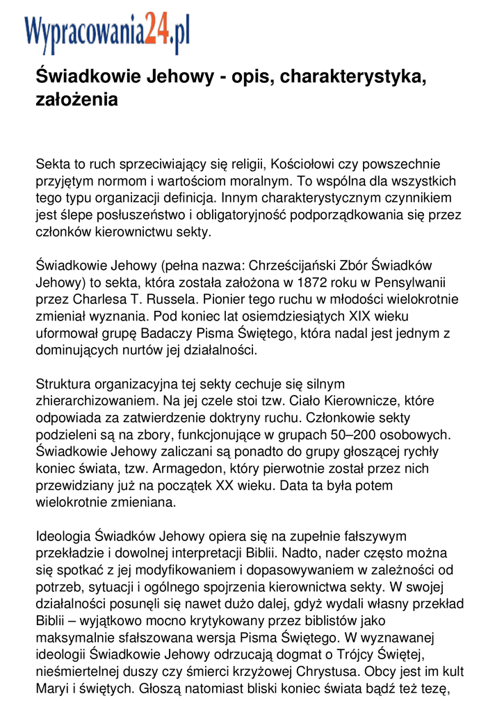 Świadkowie Jehowy - opis, charakterystyka, założenia Sekta to ruch sprzeciwiający się religii, Kościołowi czy powszechnie przyjętym normom i wartościom moralnym. To wspólna dla wszystkich tego typu organizacji definicja. Innym charakterystycznym czynnikiem jest ślepe posłuszeństwo i obligatoryjność podporządkowania się przez członków kierownictwu sekty. Świadkowie Jehowy (pełna nazwa: Chrześcijański Zbór Świadków Jehowy) to sekta, która została założona w 1872 roku w Pensylwanii przez Charlesa T. Russela. Pionier tego ruchu w młodości wielokrotnie zmieniał wyznania. Pod koniec lat osiemdziesiątych XIX wieku uformował grupę Badaczy Pisma Świętego, która nadal jest jednym z dominujących nurtów jej działalności. Struktura organizacyjna tej sekty cechuje się silnym zhierarchizowaniem. Na jej czele stoi tzw. Ciało Kierownicze, które odpowiada za zatwierdzenie doktryny ruchu. Członkowie sekty podzieleni są na zbory, funkcjonujące w grupach 50–200 osobowych. Świadkowie Jehowy zaliczani są ponadto do grupy głoszącej rychły koniec świata, tzw. Armagedon, który pierwotnie został przez nich przewidziany już na początek XX wieku. Data ta była potem wielokrotnie zmieniana. Ideologia Świadków Jehowy opiera się na zupełnie fałszywym przekładzie i dowolnej interpretacji Biblii. Nadto, nader często można się spotkać z jej modyfikowaniem i dopasowywaniem w zależności od potrzeb, sytuacji i ogólnego spojrzenia kierownictwa sekty. W swojej działalności posunęli się nawet dużo dalej, gdyż wydali własny przekład Biblii – wyjątkowo mocno krytykowany przez biblistów jako maksymalnie sfałszowana wersja Pisma Świętego. W wyznawanej ideologii Świadkowie Jehowy odrzucają dogmat o Trójcy Świętej, nieśmiertelnej duszy czy śmierci krzyżowej Chrystusa. Obcy jest im kult Maryi i świętych. Głoszą natomiast bliski koniec świata bądź też tezę, zgodnie z którą należy we wszelki możliwy sposób powstrzymać się od krwi w jakiejkolwiek postaci, stąd też są przeciwnikami transfuzji. Izolacja członków sekty od społeczeństwa następuje w różnych formach, wśród których są te dotyczące codziennego życia społeczno–politycznego. Celem przykładu można w tym aspekcie chociażby wskazać na generalne potępienie obchodzenia urodzin, które uzasadniane jest jako oznaka bałwochwalstwa, udział w wyborach uznawane jako mieszanie się w sprawy świata czy oglądanie filmów, podjęcie studiów, udział w zajęciach pozaszkolnych, które traktowane są przez sektę jako strata czasu, gdyż powinien on być przeznaczony na głoszenie. Taki rytm życia szczególnie mocno oddziałuje na dzieci Świadków Jehowy, których emocjonalne poczucie odizolowania od rówieśników i – szerzej – od społeczeństwa zostaje zwielokrotnione.