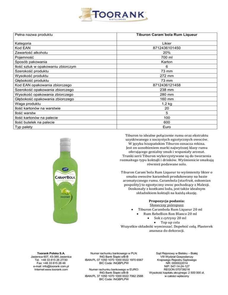 Pełna nazwa produktu Tiburon Caram`bola Rum Liqueur Kategoria Kod EAN Zawartość alkoholu Pojemność Sposób pakowania Ilość sztuk w opakowaniu zbiorczym Szerokość produktu Wysokość produktu Głębokość produktu Kod EAN opakowania zbiorczego Szerokość opakowania zbiorczego Wysokość opakowania zbiorczego Głębokość opakowania zbiorczego Waga produktu Ilość kartonów na warstwie Ilość warstw Ilość kartonów na palecie Ilość butelek na palecie Typ palety Likier 8712436101450 20% 700 ml Karton 6 73 mm 272 mm 73 mm 8712436121458 238 mm 280 mm 160 mm 1,2 kg 20 5 100 600 Euro Tiburon to idealne połączenie rumu oraz ekstraktu uzyskiwanego z soczystych egzotycznych owoców. W języku hiszpańskim Tiburon oznacza rekina. Jest on uosobieniem marki najwyższej klasy rumu oferującego genialny smak i wspaniały aromat. Trunki serii Tiburon wykorzystywane są do tworzenia rozmaitego typu koktajli i drinków. Wyśmienicie smakują również podawane solo. Tiburon Caram`bola Rum Liqueur to wyśmienity likier o smaku owoców karamboli produkowany na bazie aromatycznego rumu. Carambola (starfruit, oskomian pospolity) to egzotyczny owoc pochodzący z Malezji. Doskonały z kostkami lodu, jest także idealnym składnikiem koktajli na każdą okazję. Propozycja podania: Słoneczny pióropusz Tiburon Carambola Rum Liqueur 20 ml Rum Rebellion Ron Blanco 20 ml Sok z cytryny 20 ml Top up cola Wszystkie składniki wymieszać. Dopełnić colą. Plasterek ananasa do dekoracji. Toorank Polska S.A. Jasienica 607, 43-385 Jasienica Tel. +48 33 815 26 27/30 Fax: +48 33 815 28 48 e-mail: info@toorank com.pl Internet:www.toorank.com Numer rachunku bankowego w PLN: ING Bank Śląski o/B-B IBAN:PL 07 1050 1070 1000 0022 1970 6567 BIC Code: INGBPLPW Numer rachunku bankowego w EURO: ING Bank Śląski o/B-B IBAN:PL 37 1050 1070 1000 0022 7062 2588 BIC Code: INGBPLPW Sąd Rejonowy w Bielsku – Białej VIII Wydział Gospodarczy Krajowego Rejestru Sądowego NR: 0000022014 NIP: 547-14-24-127 REGON 070739216 Wysokość kapitału akcyjnego: 2 500 000 zł, w całości wpłacony