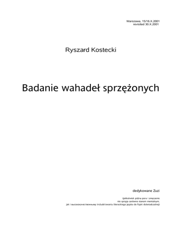 Warszawa, 15/16.X.2001 revisited 30.X.2001 Ryszard Kostecki Badanie wahadeł sprzężonych dedykowane Zuzi (jakkolwiek późna pora i zmęczenie nie sprzyja zarówno stanom mentalnym, jak i высококачественныму include'owaniu literackiego języka do fizyki doświadczalnej) I. Streszczenie Celem tej pracy jest obserwacja wahadeł sprzężonych, weryfikacja przewidywań teoretycznych ich dotyczących, oraz wyznaczenie współczynnika sprężystości sprężyny. II. Podstawy teoretyczne W poniższej pracy będę korzystał z następujących oznaczeń: M - masa wahadła k - współczynnik sprężystości sprężyny a - odległość punktu zaczepienia sprężyny na wahadle od punktu zaczepienia wahadła g - wartość przyspieszenia ziemskiego (= 9.80665 m/s^2) pi - liczba rzeczywista ( = 3.14159) r - odległość środka masy wahadła od punktu zaczepienia wahadła I - moment bezwładności wahadła T - okres drgań w - częstotliwość drgań t - czas f - początkowy kąt wychylenia wahadła m - masa dodana na szalkę d - wychylenie szalki spowodowane umieszczeniem na niej masy m, oraz wzorów teoretycznych (bądź oczywistych, bądź też wyprowadzonych w skrypcie): dla warunków początkowych f1L(t=0)=f, f1P(t=0)=f, df1L/dt(t=0)=df1P/dt(t=0)=0 zachodzi: T1=2*pi/w1 [1]# dla warunków początkowych f2L(t=0)=f, f2P(t=0)=-f, df2L/dt(t=0)=df2P/dt(t=0)=0 zachodzi: T2=2*pi/w2 [2] dla warunków początkowych f`L(t=0)=0, f`P(t=0)=f, df`L/dt(t=0)=df`P/dt(t=0)=0 występują dudnienia i charakterystyczne okresy: T`1 = 2*T1*T2/(T1+T2) [3], T`2 = 2*T1*T2/ (T1-T2) [4] w1^2 = M*g*r/I [5], oraz w2^2 = (M*g*r + 2*k*a^2)/I [6] z czego wynika, że: k = M*g*r*((w2/w1)^2-1)/2/a/a [7] k*d=g*m <=> k = g*m/d 2 [8] ∂y Jeżeli mamy dane powyższe wzory, to ze wzoru na propagację małych błędów (widocznego obok w postaci ogólnej) można wyprowadzić następujące zależności: ∑ ∂x Δw = 2*pi* | ΔT/T^2 | ΔT`1 = 2*sqrt ((T2^4)*(ΔT1^2)+(T1^4)*(ΔT2^2))/(T1+T2)^2 ΔT`2 = 2*sqrt ((T2^4)*(ΔT1^2)+(T1^4)*(ΔT2^2))/(T1-T2)^2 Δk = g*sqrt((Δm/d)^2+(m*Δd/d/d)^2) 2 ∆k = ∆y = i Δx [10] [11] 2 ∆M * r w 2 2 ∆r * M w 2 2 ∆a * r * M w 2 2 (( ) − 1) + (( ) − 1) + (( ) − 1) 2 2 3 w1 w1 w1 a 2a 2a ∆w1 * r * M * w2 2 + a 2 * w13 2 ∆w 2 * r * M * w 2 + a 2 * w12 2 [13] Ryszard Kostecki - "Badanie wahadeł sprzężonych" - strona 2 [9] [12] 2 # - nawiasami kwadratowymi dokonuję numeracji wzorów (aby się do nich później w sposób uproszczony odwoływać), zaś notacja fxP oznacza kąt wychylenia prawego wahadła w części doświadczenia związanej z wyznaczaniem Tx. III. Opis układu doświadczalnego W doświadczeniu użyłem dwóch identycznych wahadeł o masach M = (3000 +/- 40) g, sprężyny, stopera, taśmy mierniczej, zestawu odważników, a także nieokreślonej bliżej ilości nitki oraz gazu w zapalniczce. Układ doświadczalny składał się z trzech części, jednej głównej i dwóch pomocniczych: część główna (rys.1): część pomocnicza 1 (rys.2): część pomocnicza 2 (rys.2): (na rysunkach zostały zaznaczone niektóre z wielkości charakterystycznych układu, zdefiniowanych w punkcie II.; oczywiście ruch wahadła odbywał się w płaszczyźnie rysunku) IV. Przebieg doświadczenia Część IV.0 Wpierw, w celu przekonania się o rzekomej identyczności wahadeł, dokonałem kilku pomiarów okresów wahań każdego z nich (mierzyłem oczywiście czas trwania 10 okresów, po czym dzieliłem go przez dziesięć). Okresy te okazały się być nierozróżnialnymi w obliczu błędu generowanego przez czas reakcji naciskającego stoper (czas reakcji = 0.2s), takowoż uznałem obydwa wahadła za równoważne sobie (a testowe okresy wahnięć wahadła lewego umieściłem w tabeli 1 w kolumnie I pod numerami 1 i 2, zaś prawego jako 3 i 4). Część IV.I Po tej zaprawie doświadczalnej przystąpiłem do pomiarów właściwych. Obrałem sobie jedno z tożsamych wzajemnie wahadeł i dlań mierzyłem czas 10 okresów jego wahnięć (aby zmniejszyć błąd pomiarowy wynikający z opóźnionej reakcji ręka-oko), po czym wyniki te (zapisane już jako czas trwania 1 okresu) umieściłem w tabelce 1 w kolumnie I). To wykonawszy, robotę tę powtórzyłem kilkakrotnie, aby ustrzec się przed zbytnim wpływem błędów grubych, acz i nie tylko... Część IV.II Po zakończeniu powyższych czynności założyłem sprężynę na obydwa wahadła w odległości a = (25 +/- 0.1) cm od punktu zaczepu każdego z nich, wychyliłem je (poniekąd jako czarę goryczy) obydwa do wewnątrz o nieduży kąt f (tak, by zachować sensowność przybliżenia małych drgań: sin f ≈ f), po czym ustabilizowałem związując nitką. W chwili t=0 przepaliłem nitkę płonącym gazem z zapalniczki jednocześnie (z dokładnością do czasu reakcji ręka-oko, oraz Szczególnej Teorii Względności (jakkolwiek mam świadomość faktu, iż błąd wynikający z tego pierwszego jest nieco istotniejszy)) uruchamiając stoper. Po dziesięciu okresach wahnięć zatrzymałem stoper. Czas na nim uwieczniony spisałem do tabelki 1 w kolumnę II, po czym powtórzyłem tę procedurę (bez zakładania sprężyny, oczywiście, bowiem nie została ona zdjęta, więc tej potrzeby nie było) aż do uzyskania zadowalającej liczby wyników (a było ich 10 (notabene, interesującym jest wpływ systemu liczbowego używanego przez istoty myślące dokonujące pomiarów wahań wahadeł sprzężonych na charakterystykę tych pomiarów)). Ryszard Kostecki - "Badanie wahadeł sprzężonych" - strona 3 Część IV.III Jedno z wahadeł ustawiłem w pozycji pionowej, a drugie wychyliłem o jak zwykle mały kąt f. Nie zważając na zmienną amplitudę drgań mierzyłem czas 5 pełnych okresów drgań jednego z wahadeł. Wartości te, już po podzieleniu przez 5, znajdują się w tabelce 1, w kolumnie III. Część IV.IV Zadając te same warunki początkowe, co w części IV.III doświadczenia, mierzyłem czas trzech okresów T`2,