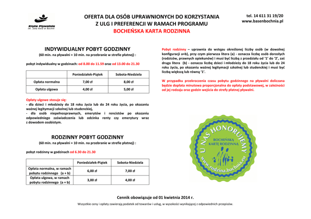 OFERTA DLA OSÓB UPRAWNIONYCH DO KORZYSTANIA Z ULG I PREFERENCJI W RAMACH PROGRAMU BOCHEŃSKA KARTA RODZINNA INDYWIDUALNY POBYT GODZINNY (60 min. na pływalni + 10 min. na przebranie w strefie płatnej) : pobyt indywidualny w godzinach: od 8.00 do 11.59 oraz od 13.00 do 21.30 Poniedziałek-Piątek Sobota-Niedziela Opłata normalna 7,00 zł 8,00 zł Opłata ulgowa 4,00 zł 5,00 zł Pobyt rodzinny – uprawnia do wstępu określonej liczby osób (w dowolnej konfiguracji a+b), przy czym pierwsza litera (a) - oznacza liczbę osób dorosłych (rodziców, prawnych opiekunów) i musi być liczbą z przedziału od ‘1’ do ‘2’, zaś druga litera (b) - oznacza liczbę dzieci i młodzieży do 18 roku życia lub do 24 roku życia, po okazaniu ważnej legitymacji szkolnej lub studenckiej i musi być liczbą większą lub równą ‘1’. W przypadku przekroczenia czasu pobytu godzinnego na pływalni doliczana będzie dopłata minutowa proporcjonalna do opłaty podstawowej, w zależności od jej rodzaju oraz godzin wejścia do strefy płatnej pływalni. Opłaty ulgowe stosuje się: - dla dzieci i młodzieży do 18 roku życia lub do 24 roku życia, po okazaniu ważnej legitymacji szkolnej lub studenckiej, - dla osób niepełnosprawnych, emerytów i rencistów po okazaniu odpowiedniego zaświadczenia lub odcinka renty czy emerytury wraz z dowodem osobistym. RODZINNY POBYT GODZINNY (60 min. na pływalni + 10 min. na przebranie w strefie płatnej) : pobyt rodzinny w godzinach od 6.30 do 21.30 Opłata normalna, w ramach pobytu rodzinnego (a + b) Opłata ulgowa, w ramach pobytu rodzinnego (a + b) Poniedziałek-Piątek Sobota-Niedziela 6,00 zł 7,00 zł 3,00 zł 4,00 zł tel. 14 611 31 19/20 www.basenbochnia.pl Cennik obowiązuje od 01 kwietnia 2014 r. Wszystkie ceny i opłaty zawierają podatek od towarów i usług, w wysokości wynikającej z odpowiednich przepisów.