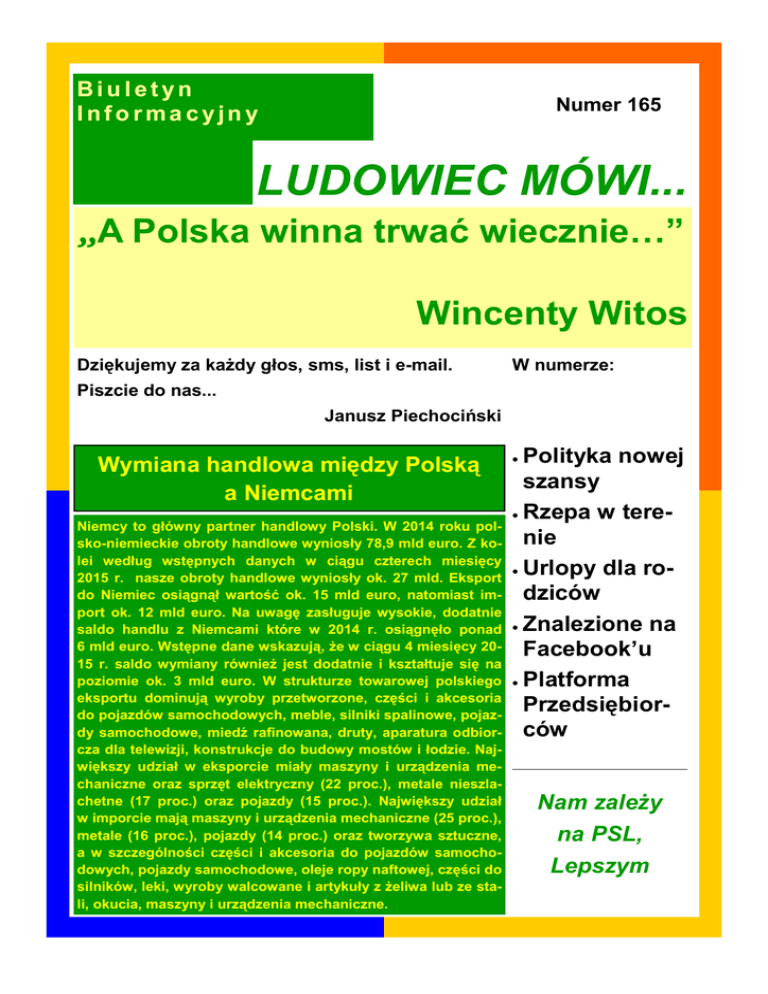 Biuletyn Informacyjny Numer 165 LUDOWIEC MÓWI... „A Polska winna trwać wiecznie…” Wincenty Witos Dziękujemy za kaŜdy głos, sms, list i e-mail. W numerze: Piszcie do nas... Janusz Piechociński Wymiana handlowa między Polską a Niemcami Niemcy to główny partner handlowy Polski. W 2014 roku polsko-niemieckie obroty handlowe wyniosły 78,9 mld euro. Z kolei według wstępnych danych w ciągu czterech miesięcy 2015 r. nasze obroty handlowe wyniosły ok. 27 mld. Eksport do Niemiec osiągnął wartość ok. 15 mld euro, natomiast import ok. 12 mld euro. Na uwagę zasługuje wysokie, dodatnie saldo handlu z Niemcami które w 2014 r. osiągnęło ponad 6 mld euro. Wstępne dane wskazują, Ŝe w ciągu 4 miesięcy 2015 r. saldo wymiany równieŜ jest dodatnie i kształtuje się na poziomie ok. 3 mld euro. W strukturze towarowej polskiego eksportu dominują wyroby przetworzone, części i akcesoria do pojazdów samochodowych, meble, silniki spalinowe, pojazdy samochodowe, miedź rafinowana, druty, aparatura odbiorcza dla telewizji, konstrukcje do budowy mostów i łodzie. Największy udział w eksporcie miały maszyny i urządzenia mechaniczne oraz sprzęt elektryczny (22 proc.), metale nieszlachetne (17 proc.) oraz pojazdy (15 proc.). Największy udział w imporcie mają maszyny i urządzenia mechaniczne (25 proc.), metale (16 proc.), pojazdy (14 proc.) oraz tworzywa sztuczne, a w szczególności części i akcesoria do pojazdów samochodowych, pojazdy samochodowe, oleje ropy naftowej, części do silników, leki, wyroby walcowane i artykuły z Ŝeliwa lub ze stali, okucia, maszyny i urządzenia mechaniczne. Polityka nowej szansy • Rzepa w terenie • Urlopy dla rodziców • Znalezione na Facebook’u • Platforma Przedsiębiorców • Nam zaleŜy na PSL, Lepszym LUDOWIEC MÓWI... Str. 2 4 Polityka nowej szansy – wsparcie dla firm zagroŜonych upadłością i tych, które chcą ponownie zaistnieć w biznesie Polityka Nowej Szansy to dokument przygotowany w Ministerstwie Gospodarki prezentujący system wsparcia dla małych i średnich przedsiębiorstw w trudnej sytuacji finansowoekonomicznej. Działania opisane w programie, realizowane w latach 2014-20, mają zapobiegać kryzysom w firmach, ograniczać ryzyko ich upadłości oraz pomóc przy ponownym rozpoczęciu działalności po poraŜce w biznesie. W Polityce Nowej Szansy wyodrębniono cztery główne obszary działań: zapobieganie sytuacjom kryzysowym w przedsiębiorstwie, zapobieganie ryzyku przedwczesnej likwidacji, sprawne przeprowadzenie likwidacji przedsiębiorstw oraz wsparcie dla ponownego podejmowania działalności gospodar- czej. MG proponuje m.in. upowszechnienie systemów wczesnego ostrzegania o sytuacji kryzysowej przedsiębiorstwa, np. w postaci narzędzi on-line monitorujących sytuację finansową. Polityka… ma umoŜliwić równieŜ jak największy dostęp do usług informacyjnych i doradczych na temat zarządzania firmą (kryzysem, ryzykiem, zmianą). W celu zapobiegania ryzyku przedwczesnej likwidacji, w Polityce Nowej Szansy ujęto działania na rzecz poprawy dostępu do finansowania dla małych i średnich przedsiębiorstw, korzystających z działań restrukturyzacyjnych. Polit yka Nowej Szansyproponuje wdroŜenie instrumentu pomocy publicznej na ratowanie i restrukturyzację przedsiębiorstwa znajdującego się w trudnej sytuacji ekonomicznej. Warunkiem jest jednak podjęcie działań naprawczych. Zmiany prawne z zakresu postępowania restrukturyzacyjnego, które mają na celu m.in. przeprowadzenie sprawnej likwidacji przedsiębiorstwa, zaproponowane zostały z kolei w ustawie Prawo restrukturyzacyjne, którą 9 czerwca 2015 r. podpisał Prezydent RP. Ustawa wejdzie w Ŝycie 1 stycznia 2016 r. Poprzez wsparcie dla ponownego podejmowania działalności gospodarczej naleŜy natomiast rozumieć działania, które ułatwią ponowny start firmom i zmienią negatywne postrzeganie społeczne poraŜki w biznesie. NaleŜą do nich np. szkolenia, doradztwo, coaching, świadczone przez instytucje ukierunkowane na współpracę z przedsiębiorcami otwierającymi firmę po raz kolejny (instrument nowy start). www.mg.gov.pl Numer 165 Str. 3 Rzepa w terenie LUDOWIEC MÓWI... Str. Str. 44 Apel o inwestowanie w małe przetwórnie Apeluję do rolników o inwestowanie w małe przetwórnie. To pewna szansa na dodatkowe dochody, bo konsumenci kochają wiejską Ŝywność – powiedział minister rolnictwa i rozwoju wsi Marek Sawicki podczas konferencji prasowej w Centrum Doradztwa Rolniczego w Radomiu. Takie inwestycje mogą liczyć na dofinansowanie z programu LEADER w wysokości 100 tyś. zł, a z programu „Wsparcie inwestycji w przetwarzanie produktów rolnych, obrót nimi lub ich rozwój” maksymalna kwota pomocy to 300 tys. zł. – Deflacja w maju to dobra informacja dla konsumentów, którzy będą płacić mniej za Ŝywność. Mniej zadowoleni są rolnicy, którzy otrzymają mniej za swoją pracę. Aby bronić ich dochodów proponujemy inwestycje w działalność marginalną, ograniczoną oraz lokalną, czyli tzw. MOL-e. To małe przetwórnie Ŝywności, które mogą korzystać z surowców wyprodukowanych w gospodarstwie rolnika – tłumaczył Marek Sawicki. Spotkanie z dziennikarzami odbyło się w Centrum Praktycznego Szkolenia w Za- kresie Małego Przetwórstwa. To, funkcjonujący od 2010 r. w ramach Centrum Doradztwa Rolniczego, ośrodek szkoleniowy, gdzie kaŜdy rolnik moŜe poznać teoretyczne oraz praktyczne tajniki przetwórstwa, na poziomie gospodarstwa. Do tej pory z takich szkoleń skorzystało 7,5 tys. rolników. Zdecydowana większość polskich rolników sprzedaje produkty ze swoich gospodarstw w postaci surowców (zboŜa, Ŝywiec, owoce), w efekcie czego otrzymuje za nie cenę duŜo niŜszą w porównaniu z tą, jaką moŜna otrzymać przy sprzedaŜy produktów przetworzonych. Przetwórstwo na poziomie gospodarstwa pozwala na zwiększenie dochodów, bo rolnik moŜe zatrzymać marŜę, którą