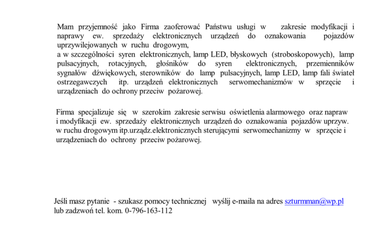 Mam przyjemność jako Firma zaoferować Państwu usługi w zakresie modyfikacji i naprawy ew. sprzedaży elektronicznych urządzeń do oznakowania pojazdów uprzywilejowanych w ruchu drogowym, a w szczególności syren elektronicznych, lamp LED, błyskowych (stroboskopowych), lamp pulsacyjnych, rotacyjnych, głośników do syren elektronicznych, przemienników sygnałów dźwiękowych, sterowników do lamp pulsacyjnych, lamp LED, lamp fali świateł ostrzegawczych itp. urządzeń elektronicznych serwomechanizmów w sprzęcie i urządzeniach do ochrony przeciw pożarowej. Firma specjalizuje się w szerokim zakresie serwisu oświetlenia alarmowego oraz napraw i modyfikacji ew. sprzedaży elektronicznych urządzeń do oznakowania pojazdów uprzyw. w ruchu drogowym itp.urządz.elektronicznych sterującymi serwomechanizmy w sprzęcie i urządzeniach do ochrony przeciw pożarowej. Jeśli masz pytanie - szukasz pomocy technicznej wyślij e-maila na adres [email protected] lub zadzwoń tel. kom. 0-796-163-112