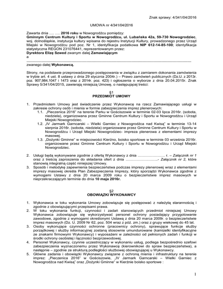 Znak sprawy: 4/341/04/2016 UMOWA nr 4/341/04/2016 Zawarta dnia …. …. 2016 roku w Nowogrodźcu pomiędzy: Gminnym Centrum Kultury i Sportu w Nowogrodźcu, ul. Lubańska 42a, 59-730 Nowogrodziec, woj. dolnośląskie, instytucja kultury wpisana do rejestru Instytucji Kultury, prowadzonego przez Urząd Miejski w Nowogrodźcu pod poz. Nr 1, identyfikacja podatkowa NIP 612-14-85-100; identyfikacja statystyczna REGON 231076441, reprezentowanym przez: Dyrektora Elizę Szwed zwanym dalej Zamawiającym a …………………………………………………………………………………………………………………… zwanego dalej Wykonawcą. Strony, na podstawie przeprowadzonego postępowania w związku z zamiarem dokonania zamówienia w trybie art. 4 ust. 8 ustawy z dnia 29 stycznia 2004r.) – Prawo zamówień publicznych (Dz.U. z 2013r. poz. 907,984,1047 i 1473 oraz z 2014r. poz. 423) i ogłoszenia o wyborze z dnia 20.04.2015r. Znak Sprawy 5/341/04/2015, zawierają niniejszą Umowę, o następującej treści: §1 PRZEDMIOT UMOWY 1. Przedmiotem Umowy jest świadczenie przez Wykonawcę na rzecz Zamawiającego usługi w zakresie ochrony osób i mienia w formie zabezpieczenia imprez plenerowych: 1.1. „Pieczenica 2016” na terenie Parku w Gościszowie w terminie 02-03 lipca 2016r. (sobota, niedziela), organizowana przez Gminne Centrum Kultury i Sportu w Nowogrodźcu i Urząd Miejski Nowogrodziec. 1.2. „IV Jarmark Garncarski – Wielki Garniec z Nowogrodźca nad Kwisą” w terminie 13-14 sierpnia 2016r. (sobota, niedziela) organizowane przez Gminne Centrum Kultury i Sportu w Nowogrodźcu i Urząd Miejski Nowogrodziec- impreza plenerowa z elementami imprezy masowej. 1.3. „Dożynki Gminne” w miejscowości Kierżno, boisko sportowe w terminie 03 września 2016r. organizowane przez Gminne Centrum Kultury i Sportu w Nowogrodźcu i Urząd Miejski Nowogrodziec. 2. Usługi będą wykonywane zgodnie z ofertą Wykonawcy z dnia …………………. r. – Załącznik nr 1 oraz z treścią zaproszenia do składania ofert z dnia ……………………..- Załącznik nr 2, które stanowią integralną część niniejszej Umowy. 3. Sposób i metodykę zapewnienia bezpieczeństwa podczas imprezy plenerowej wraz z elementami imprezy masowej określa Plan Zabezpieczenia Imprezy, który sporządzi Wykonawca zgodnie z wymogami Ustawy z dnia 20 marca 2009 roku o bezpieczeństwie imprez masowych w nieprzekraczającym terminie do dnia 10 maja 2016r. §2 OBOWIĄZKI WYKONAWCY 1. Wykonawca w toku wykonania Umowy zobowiązuje się postępować z należytą starannością i zgodnie z obowiązującymi przepisami prawa. 2. W toku wykonania funkcji, czynności i zadań stanowiących przedmiot niniejszej Umowy Wykonawca zobowiązuje się wykorzystywać personel ochrony posiadający przygotowanie zawodowe, zgodnie z wymogami określonymi Ustawą z dnia 20 marca 2009r. o bezpieczeństwie imprez masowych (Dz. U. 2009 Nr 62, poz. 504 wraz z póź. zm.) oraz z grupy wiekowej do 45 lat. 3. Osoby wykonujące czynności ochronne (pracownicy ochrony), sprawujące funkcje służby porządkowej i służby informacyjnej zostaną stosownie umundurowane (kamizelki identyfikacyjne ze znakami firmowymi Wykonawcy) i wyposażeni w zależności od pełnionych zadań i funkcji w środki ochrony osobistej i łączności bezprzewodowej. 4. Personel Wykonawcy, czynnie uczestniczący w wykonaniu usług, podlega bezpośrednio szefowi zabezpieczenia wyznaczonemu przez Wykonawcę (kierownikowi do spraw bezpieczeństwa), a następnie – zgodnie ze strukturą podległości służbowej obowiązującej u Wykonawcy. 5. Główne zadania i obowiązki Wykonawcy związane z ochroną mienia i infrastruktury na terenie imprez: „Pieczenica 2016” w Gościszowie, „IV Jarmark Garncarski – Wielki Garniec z Nowogrodźca nad Kwisą” oraz „Dożynki Gminne” w Kierżnie boisko sportowe : 1 5.1 Płyta główna (Pieczenica 2016 – Park w Gościszowie, „IV Jarmark Garncarski – Wielki Garniec z Nowogrodźca nad Kwisą” – Rynek w Nowogrodźcu, „Dożynki Gminne” – Kierżno boisko sportowe): - scena wraz z zadaszeniem, nagłośnieniem i oświetleniem, z punktem mikserskim ustawionym na płycie, - namioty artystów, zlokalizowane w strefie za sceną, - samochody obsługi i artystów, - strefa rozdzielająca imprezę masową od rekreacji, 5.2 Płyta boczna i teren wystawowy (odpowiednio dla „Pieczenica 2016” – Park w Gościszowie, „IV Jarmark Garncarski – Wielki Garniec z Nowogrodźca nad Kwisą” – Rynek w Nowogrodźcu, „Dożynki Gminne” – Kierżno boisko sportowe): - namioty i stoiska gastronomiczne z wyposażeniem, - miejsca konsumpcyjne zlokalizowane na płycie, - stoiska handlowo wystawiennicze, - samochody obsługi i wystawców, - przenośne toalety, - miejsca poboru energii elektrycznej, 6. Zadania i obowiązki Wykonawcy związane z zapewnieniem bezpieczeństwa imprezy, spokoju i porządku publicznego oraz ochrona osób i mienia odpowiednio dla „Pieczenicy 2016” – rejon boiska w Parku w Gościszowie, „IV Jarmarku Garncarskiego – Wielkiego Garnca z Nowogrodźca nad Kwisą”– rejon Rynku w Nowogrodżcu, natomiast dla „Dożynek Gminnych – rejon boiska sportowego w Kierżnie podejmowanie interwencji w przypadku zakłócania porządku publicznego, - zabezpieczenie i prowadzenie depozytu, - opróżnianie sfery rozdzielającej imprezę masową od rekreacyjnej z uczestników po zakończeniu imprez (w terminie podanym przez upoważnionego i odpowiedzialnego za bezpieczeństwo przedstawiciela Zamawiającego), z wyłączeniem osób wskazanych przez Zamawiającego, - sprawdzanie nieletnich pod względem nietrzeźwości, a w przypadku stwierdzenia takiego stanu przekazanie nietrzeźwych nieletnich straży miejskiej, funkcjonariuszom policji, - bieżące kontrolowanie osób wchodzących na teren/obszar/obiekt imprezy masowej na bramach wejściowych pod kątem przeciwdziałania próbom wniesien
