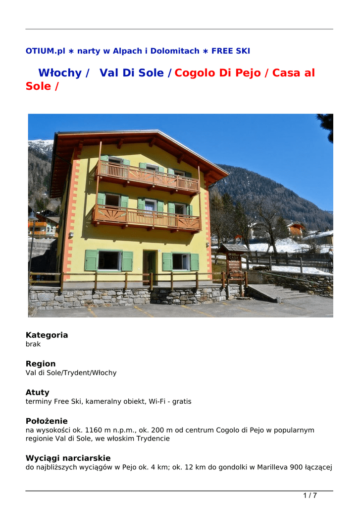 OTIUM.pl ∗ narty w Alpach i Dolomitach ∗ FREE SKI Włochy / Val Di Sole / Cogolo Di Pejo / Casa al Sole / Kategoria brak Region Val di Sole/Trydent/Włochy Atuty terminy Free Ski, kameralny obiekt, Wi-Fi - gratis Położenie na wysokości ok. 1160 m n.p.m., ok. 200 m od centrum Cogolo di Pejo w popularnym regionie Val di Sole, we włoskim Trydencie Wyciągi narciarskie do najbliższych wyciągów w Pejo ok. 4 km; ok. 12 km do gondolki w Marilleva 900 łączącej 1/7 wyciągami i trasami narciarskimi z Marilleva 1400, Folgarida, Madonna di CampiglioPinzolo, które razem tworzą region SkiArea Campiglio Dolomiti di Brenta. Do Tonale (Adamello Ski) z Lodowcem Presena ok. 20 km. Przystanek skibusa (gratis) znajduje się ok. 100 m od obiektu. Wyposażenie przechowalnia sprzętu narciarskiego, parking (gratis). Obiekt 2-piętrowy. Uwaga! Apartament typu Trilo 4 znajduje się w innym budynku w Celledizzo (ok. 1 km od Pejo) Internet tak (Wi-Fi, gratis) Karty kredytowe nie Szkolenie narciarskie Val di Sole/Marilleva 1400 lub Folgarida w terminach 14.01-26.02.2017 proponujemy (dodatkowo płatne) 6-dniowe grupowe szkolenia narciarskie na wszystkich poziomach zaawansowania dla dzieci od 4 lat, młodzieży i dorosłych - 2,5 h dziennie i dla jeżdżących w stopniu min. podstawowym dzieci 6-12 lat - 4,5 h lub 5,5 h dziennie. (Uwaga! w Marillevie nie prowadzimy szkoleń na poziomie 0, zajęcia dla początkujących odbywają się w Folgaridzie). Fakultatywna dopłata przy rezerwacji. Szczegóły i ceny na stronie www - Szkolenia narciarskie - info Apartament BILO 2-3-osobowy (ok. 35 m<sup>2</sup>), składa się z sypialni z łóżkiem małżeńskim, pokoju dziennego z łóżkiem pojedynczym, aneksu kuchennego w pełni wyposażonego (naczynia, sztućce, kuchenka, lodówka). Łazienka z WC, suszarka; TV, sejf. Część apartamentów posiada balkon Apartament BILO 4-osobowy: (ok. 40 m<sup>2</sup>), składa się z sypialni z łóżkiem małżeńskim, pokoju dziennego z dwuosobowym rozkładanym łóżkiem lub dwoma pojedynczymi, aneksu kuchennego w pełni wyposażonego (naczynia, sztućce, kuchenka, lodówka). Łazienka z WC, suszarka do włosów; TV, sejf. Część apartamentów posiada balkon Apartament TRILO 4-osobowy (ok. 40-50 m<sup>2</sup>), składa się z dwóch sypialni (w każdej łóżko małżeńskie lub dwa łóżka pojedyncze), pokoju dziennego z sofą i aneksu kuchennego w pełni wyposażonego (naczynia, sztućce, kuchenka, lodówka). Łazienka z WC, suszarka do włosów; TV, sejf. Część apartamentów posiada balkon. Apartament znajduje się w Celledizzo Apartament TRILO 4-6-osobowy (ok. 80 m<sup>2</sup>), składa się z dwóch sypialni (w każdej łóżko małżeńskie lub dwa łóżka pojedyncze), pokoju dziennego z dwuosobowym rozkładanym łóżkiem i aneksu kuchennego w pełni wyposażonego (naczynia, sztućce, kuchenka, lodówka). Łazienka z WC, suszarka do włosów; TV, sejf. Część apartamentów posiada balkon Pieski 2/7 tak (za opłatą 20 euro/tydz.) Kategoria lokalna brak Świadczenia 7 noclegów (Uwaga! w terminie 17-22.12.2016 - oferta z przejazdem autokarem, 5 noclegów, wykwaterowanie 22.12 ok. 18.00; w terminie 17-23.12.2016 - oferta z dojazdem własnym, 6 noclegów), ubezpieczenie Signal Iduna - Bezpieczne Podróże (w tym rekreacyjne uprawianie narciarstwa zjazdowego, biegowego lub snowboardu na oznakowanych trasach zjazdowych) - KL, KR, NNW i bagażu, opieka włoskiego kontrahenta Uwaga Zalecamy dodatkowe ubezpieczenie OC/SS (w tym sprzęt sportowy) Signal Iduna - 35 zł/os/pobyt Dopłaty możliwość wypożyczenia bielizny pościelowej i ręczników - 10 euro/os. lub obowiązkowo własne. Dopłata za ubezpieczenie od kosztów rezygnacji 2,4% W cenie prąd, woda, ogrzewanie Obowiązkowe opłaty na miejscu kaucja zwrotna 150 euro/apt; końcowe sprzątanie 50 euro/BILO/tydz., 60 euro/TRILO/tydz. (aneks kuchenny należy posprzątać we własnym zakresie, śmieci należy wyrzucić); taksa klimatyczna ok. 1-2,5 euro/os./dzień Zakwaterowanie przyjazd - od godz. 14.00, wyjazd - do godz. 9.00 Autokar przejazd komfortowym autokarem (klimatyzacja, WC, bar, video), warunki przewozu, cennik, program i rozkład jazdy dostępne na stronie organizatora. (Uwaga! W terminie 16-23.12.2016 tylko dla pobytów 5-dniowych) Oferta Free Ski w terminach 03-24.12.2016, 07.01-08.04.2017 karnet 6-dniowy Pejo w cenie. Uwaga! W terminach 17-22.12.2016 (oferta autokarowa) i 17-23.12.2016 karnet 5-dniowy Pejo. W dniu rezerwacji istnieje możliwość dopłaty do karnetu Combi3 (obejmuje Pejo i 3 dni do wykorzystania w dowolnych ośrodkach Superskirama - Folgarida- Marilleva, Madonna di Campiglio, Pinzolo, Tonale) - w terminie 17-22/23/24.12 - 330 zł/os., w terminach 07-28.01.2017, 04-18.03.2017 - 350 zł/os., w terminach 28.01-04.03.2017, 18-25.03.2017 - 305 zł/os. lub karnetu Superskirama Adamello Brenta - w terminach 03-17.12.2016 - 180 zł/os. i w terminach 25.03-08.04.2017 - 230 zł/os. 3/7 Promocja Niezmienność ceny - dla rezerwacji potwierdzonych do 30.11.2016 data skąd pobyt opis cena / os 17.03.2017 Bielsko - Biała 8 dni Pokój: Apartament BILO 2 os. Wyżywienie: bez wyżywienia 1639 zł / os 17.03.2017 Katowice 8 dni Pokój: Apartament BILO 2 os. Wyżywienie: bez wyżywienia 1668 zł / os 17.03.2017 Częstochowa 8 dni Pokój: Apartament BILO 2 os. Wyżywienie: bez wyżywienia 1678 zł / os 17.03.2017 Opole 8 dni Pokój: Apartament BILO 2 os. Wyżywienie: bez wyżywienia 1678 zł / os 17.03.2017 Łódź 8 dni Pokój: Apartament BILO 2 os. Wyżywienie: bez wyżywienia 1698 zł / os 17.03.2017 Piotrków Trybunalski 8 dni Pokój: Apartament BILO 2 os. Wyżywienie: bez wyżywienia 1698 zł / os 17.03.2017 Wrocław 8 dni Pokój: Apartament BILO 2 os. Wyżywienie: bez wyżywienia 1698 zł / os 17.03.2017 Warszawa 8 dni Pokój: Apartament BILO 2 os. Wyżywienie: bez wyżywienia 1698 zł / os 17.03.2017 Gdańsk 8 dni Pokój: Apartament BILO 2 os. Wyżywienie: bez wyżywienia 1788 zł / os 4