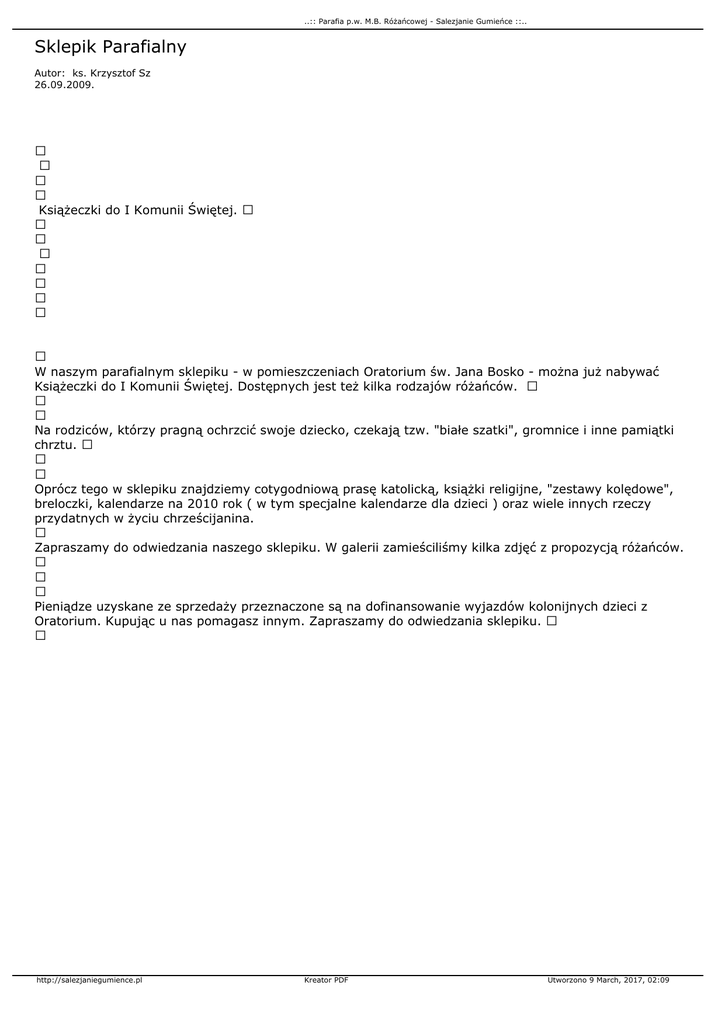 ..:: Parafia p.w. M.B. Różańcowej - Salezjanie Gumieńce ::.. Sklepik Parafialny Autor: ks. Krzysztof Sz 26.09.2009. Książeczki do I Komunii Świętej. W naszym parafialnym sklepiku - w pomieszczeniach Oratorium św. Jana Bosko - można już nabywać Książeczki do I Komunii Świętej. Dostępnych jest też kilka rodzajów różańców. Na rodziców, którzy pragną ochrzcić swoje dziecko, czekają tzw. "białe szatki", gromnice i inne pamiątki chrztu. Oprócz tego w sklepiku znajdziemy cotygodniową prasę katolicką, książki religijne, "zestawy kolędowe", breloczki, kalendarze na 2010 rok ( w tym specjalne kalendarze dla dzieci ) oraz wiele innych rzeczy przydatnych w życiu chrześcijanina. Zapraszamy do odwiedzania naszego sklepiku. W galerii zamieściliśmy kilka zdjęć z propozycją różańców. Pieniądze uzyskane ze sprzedaży przeznaczone są na dofinansowanie wyjazdów kolonijnych dzieci z Oratorium. Kupując u nas pomagasz innym. Zapraszamy do odwiedzania sklepiku. http://salezjaniegumience.pl Kreator PDF Utworzono 9 March, 2017, 02:09