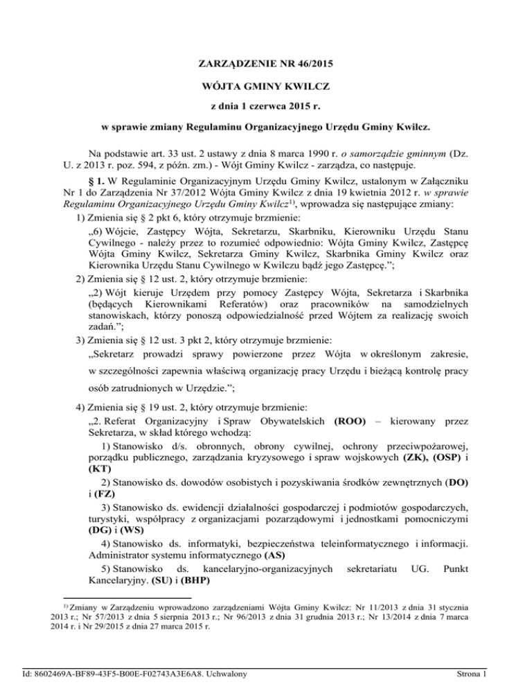 ZARZĄDZENIE NR 46/2015 WÓJTA GMINY KWILCZ z dnia 1 czerwca 2015 r. w sprawie zmiany Regulaminu Organizacyjnego Urzędu Gminy Kwilcz. Na podstawie art. 33 ust. 2 ustawy z dnia 8 marca 1990 r. o samorządzie gminnym (Dz. U. z 2013 r. poz. 594, z późn. zm.) - Wójt Gminy Kwilcz - zarządza, co następuje. § 1. W Regulaminie Organizacyjnym Urzędu Gminy Kwilcz, ustalonym w Załączniku Nr 1 do Zarządzenia Nr 37/2012 Wójta Gminy Kwilcz z dnia 19 kwietnia 2012 r. w sprawie Regulaminu Organizacyjnego Urzędu Gminy Kwilcz1), wprowadza się następujące zmiany: 1) Zmienia się § 2 pkt 6, który otrzymuje brzmienie: „6) Wójcie, Zastępcy Wójta, Sekretarzu, Skarbniku, Kierowniku Urzędu Stanu Cywilnego - należy przez to rozumieć odpowiednio: Wójta Gminy Kwilcz, Zastępcę Wójta Gminy Kwilcz, Sekretarza Gminy Kwilcz, Skarbnika Gminy Kwilcz oraz Kierownika Urzędu Stanu Cywilnego w Kwilczu bądź jego Zastępcę.”; 2) Zmienia się § 12 ust. 2, który otrzymuje brzmienie: „2) Wójt kieruje Urzędem przy pomocy Zastępcy Wójta, Sekretarza i Skarbnika (będących Kierownikami Referatów) oraz pracowników na samodzielnych stanowiskach, którzy ponoszą odpowiedzialność przed Wójtem za realizację swoich zadań.”; 3) Zmienia się § 12 ust. 3 pkt 2, który otrzymuje brzmienie: „Sekretarz prowadzi sprawy powierzone przez Wójta w określonym zakresie, w szczególności zapewnia właściwą organizację pracy Urzędu i bieżącą kontrolę pracy osób zatrudnionych w Urzędzie.”; 4) Zmienia się § 19 ust. 2, który otrzymuje brzmienie: „2. Referat Organizacyjny i Spraw Obywatelskich (ROO) – kierowany przez Sekretarza, w skład którego wchodzą: 1) Stanowisko d/s. obronnych, obrony cywilnej, ochrony przeciwpożarowej, porządku publicznego, zarządzania kryzysowego i spraw wojskowych (ZK), (OSP) i (KT) 2) Stanowisko ds. dowodów osobistych i pozyskiwania środków zewnętrznych (DO) i (FZ) 3) Stanowisko ds. ewidencji działalności gospodarczej i podmiotów gospodarczych, turystyki, współpracy z organizacjami pozarządowymi i jednostkami pomocniczymi (DG) i (WS) 4) Stanowisko ds. informatyki, bezpieczeństwa teleinformatycznego i informacji. Administrator systemu informatycznego (AS) 5) Stanowisko ds. kancelaryjno-organizacyjnych sekretariatu UG. Punkt Kancelaryjny. (SU) i (BHP) 1) Zmiany w Zarządzeniu wprowadzono zarządzeniami Wójta Gminy Kwilcz: Nr 11/2013 z dnia 31 stycznia 2013 r.; Nr 57/2013 z dnia 5 sierpnia 2013 r.; Nr 96/2013 z dnia 31 grudnia 2013 r.; Nr 13/2014 z dnia 7 marca 2014 r. i Nr 29/2015 z dnia 27 marca 2015 r. Id: 8602469A-BF89-43F5-B00E-F02743A3E6A8. Uchwalony Strona 1 6) Stanowisko ds. obsługi Rady Gminy, archiwum zakładowego i ochrony zdrowia (RG), (OZ) i (AZ) 7) pracownicy obsługi (sprzątaczki, pracownik gospodarczy).”; 5) W § 20 ust. 2 skreśla się pkt 4. 6) Zmienia się § 20 ust. 7, który otrzymuje brzmienie: „7) Sekretarzowi podlega bezpośrednio Referat Organizacyjny i Spraw Obywatelskich, którego jest kierownikiem.”; 7) Zmienia się nazwę Rozdziału III, który otrzymuje brzmienie: „Sekretarz Gminy” 8) Zmienia się § 23, który otrzymuje brzmienie: „Do zadań Sekretarza Gminy należy zapewnienie sprawnego funkcjonowania Urzędu, a w szczególności: 1) przedkładanie Wójtowi propozycji dotyczących usprawnienia pracy Urzędu, 2) realizowanie polityki zarządzania zasobami ludzkimi, 3) opracowywanie projektów zmian Regulaminu Organizacyjnego, 4) opracowywanie projektów podziału referatów i zespołów pracowniczych na stanowiska pracy, 5) opracowywanie zakresów czynności na stanowiskach pracy dla kierowników referatów oraz stanowisk samodzielnych, 6) organizowanie i sprawowanie nadzoru nad organizacją pracy, przestrzeganiem wewnętrznego porządku pracy, prawidłowym wykonywaniem czynności kancelaryjnych i elektronicznym obiegiem dokumentów e-urząd, 7) zabezpieczenie budynku Urzędu przed dostępem osób nieupoważnionych po godzinach pracy oraz w czasie wolnym od pracy, 8) zapewnianie pracownikom Urzędu dostępu do aktualnego zbioru aktów prawnych, fachowych czasopism, 9) nadzorowanie przestrzegania przez pracowników Urzędu zasad rzetelnego i terminowego załatwiania spraw, 10) inicjowanie, koordynowanie i nadzorowanie szkolenia pracowników Urzędu na podstawie opracowywanych planów szkoleń na dany rok według zapotrzebowania pracowników i kierowników referatów, 11) nadzorowanie spraw w zakresie podnoszenia kwalifikacji zawodowych pracowników, 12) prowadzenie spraw z zakresu służby przygotowawczej urzędników samorządowych, 13) współpraca, wraz ze stanowiskiem do spraw kadrowych, z Powiatowym Urzędem Pracy w zakresie organizacji stażu, przygotowania zawodowego dla absolwentów szkół średnich i wyższych oraz prac interwencyjnych i robót publicznych dla osób bezrobotnych – składanie zapotrzebowania oraz organizacja pracy dla skierowanych osób, 14) zapewnianie skutecznych sposobów publikacji prawa miejscowego, obwieszczeń oraz wszelkiej informacji o charakterze publicznym na terenie Gminy, 15) zapewnianie organizacji w zakresie przygotowania materiałów pod obrady sesji Rady Gminy i posiedzeń Komisji, Id: 8602469A-BF89-43F5-B00E-F02743A3E6A8. Uchwalony Strona 2 16) kierowanie pracą Referatu Organizacyjnego i Spraw Obywatelskich, w szczególności: a) rozpatrywanie skarg na pracowników Referatu oraz podejmuje działania zapobiegające, b) dokonywanie oceny pracy pracowników Referatu, c) usprawnianie organizacji pracy Referatu, przygotowywanie wniosków i analiz z zakresu właściwości pracy Referatu, d) przygotowywanie propozycji planów, programów i regulaminów obszaru wnikającego z właściwości pracy Referatu, 17) współpraca w zakresie prac związanych z wyborami, referendami i spisami, 18) koordynacja czynności związanych z realizowaniem ustawy o dostępie do informacji publicznej, w tym związanych z zamieszczaniem informacji w Biuletynie Informacji Publicz